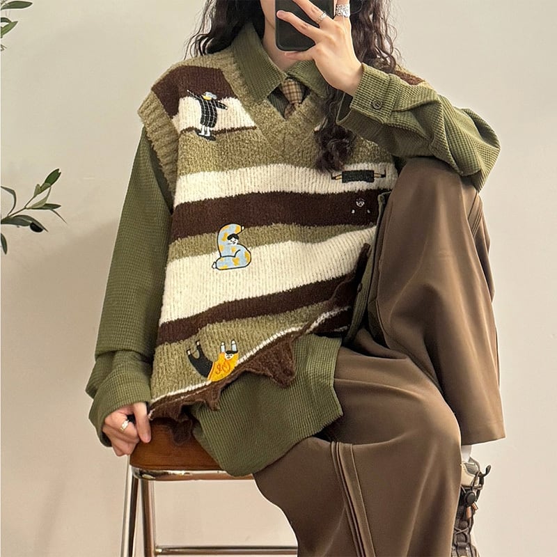 【UATONLINEシリーズ】★ニットベスト★ トップス ベスト ノースリーブ 男女兼用 メンズ Vネック 横縞 縞模様
