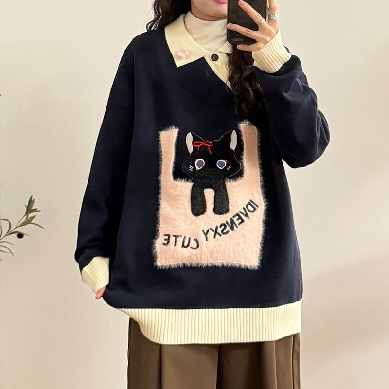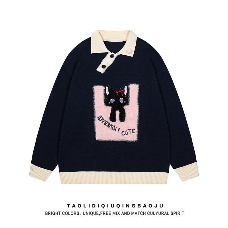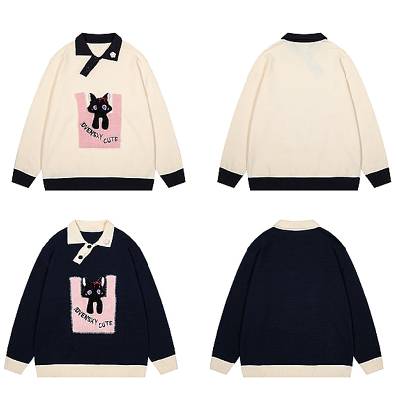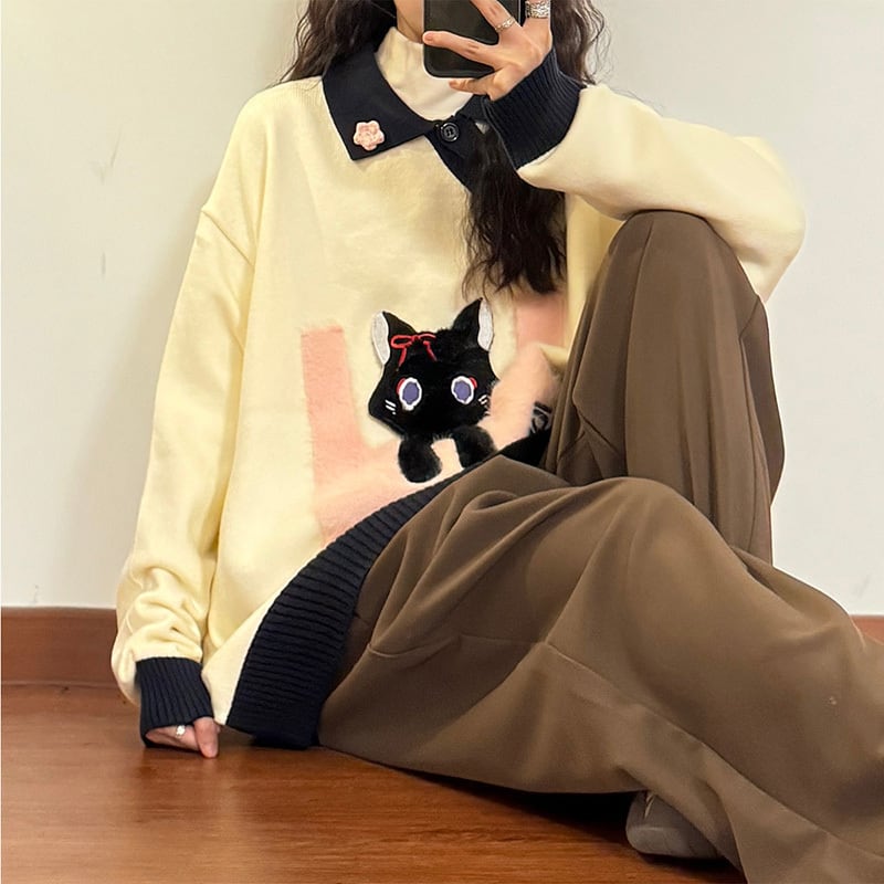 【UATONLINEシリーズ】★セーター★ 2color トップス ニットトップス POLOネック 猫 猫柄 ネコ レディース 可愛い