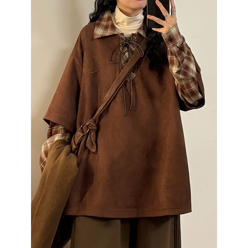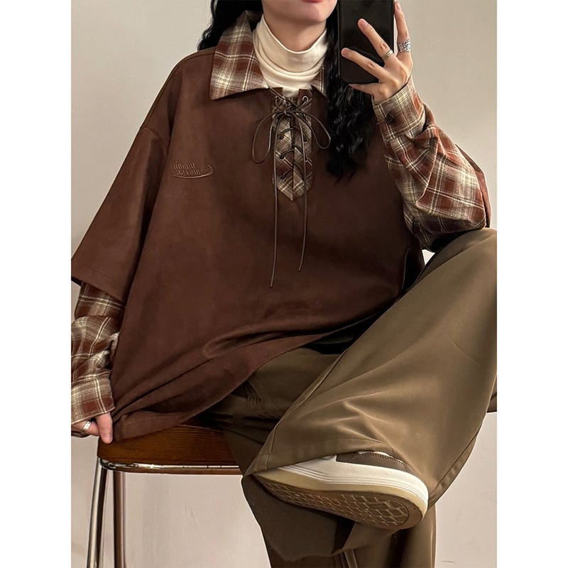 【UATONLINEシリーズ】★POLOシャツ★ トップス 男女兼用 メンズ レトロ 切り替え チェック柄
