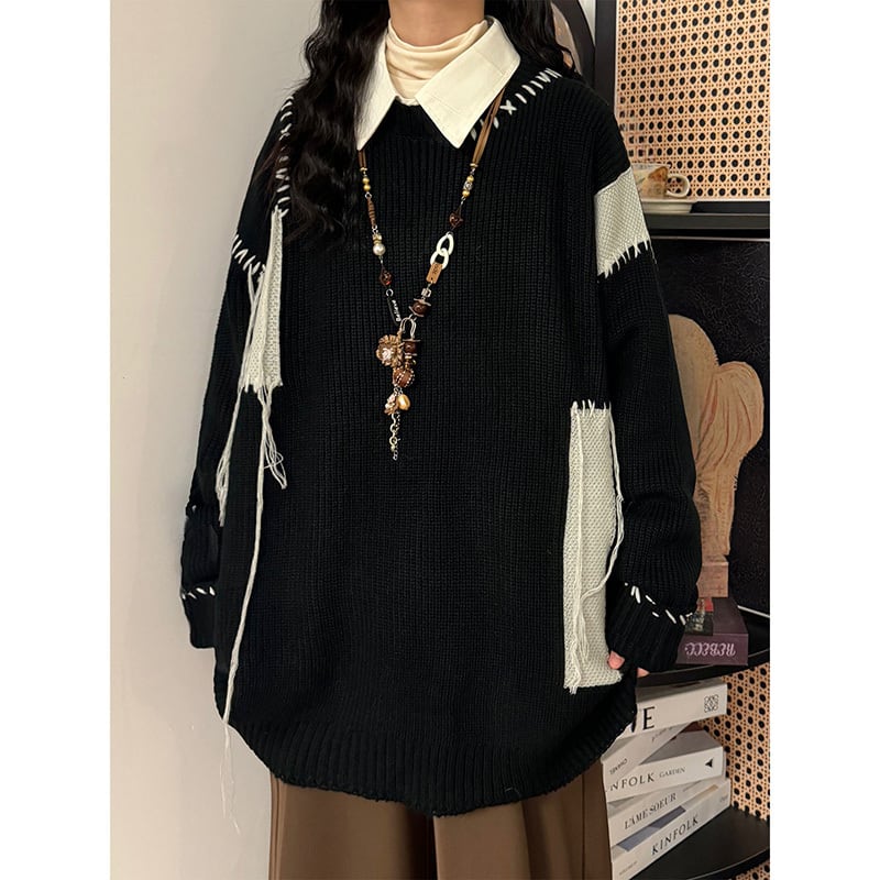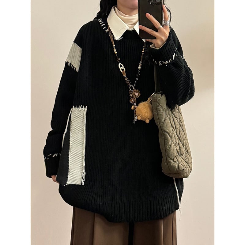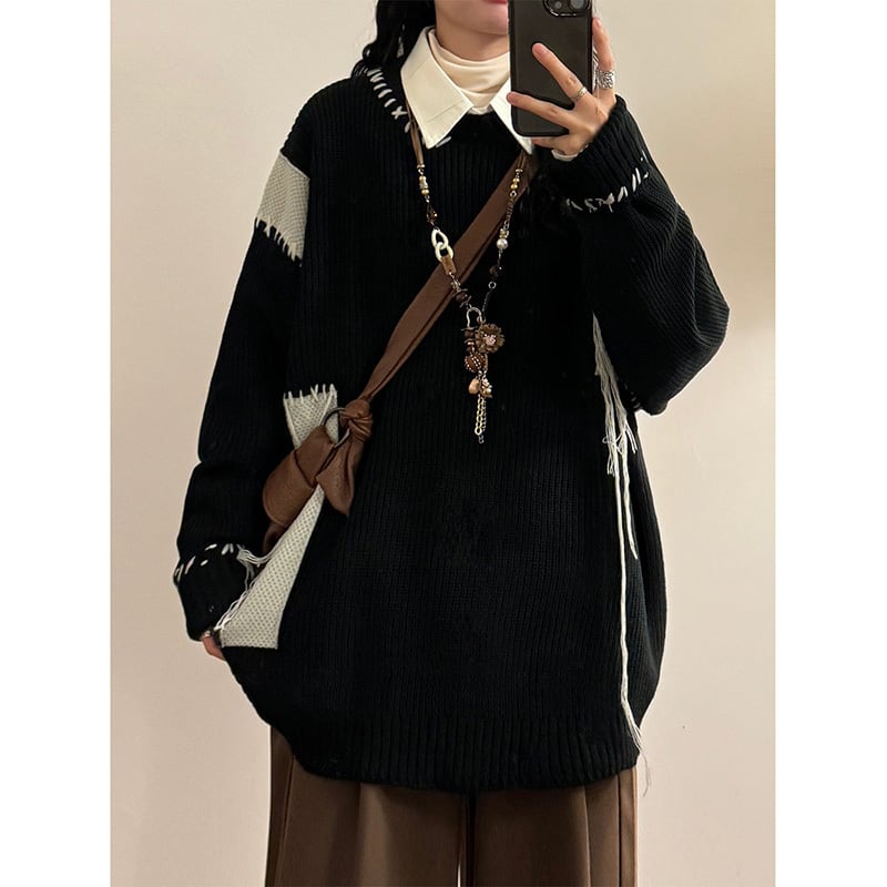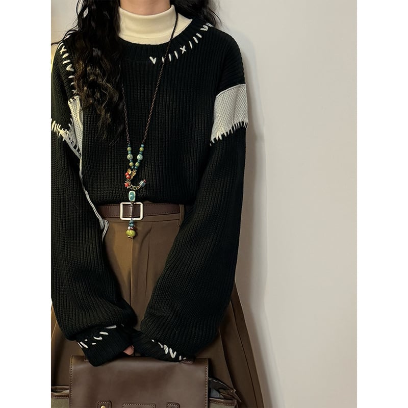 【UATONLINEシリーズ】★セーター★ ニットトップス 男女兼用 メンズ ブラック 黒い 配色 おしゃれ