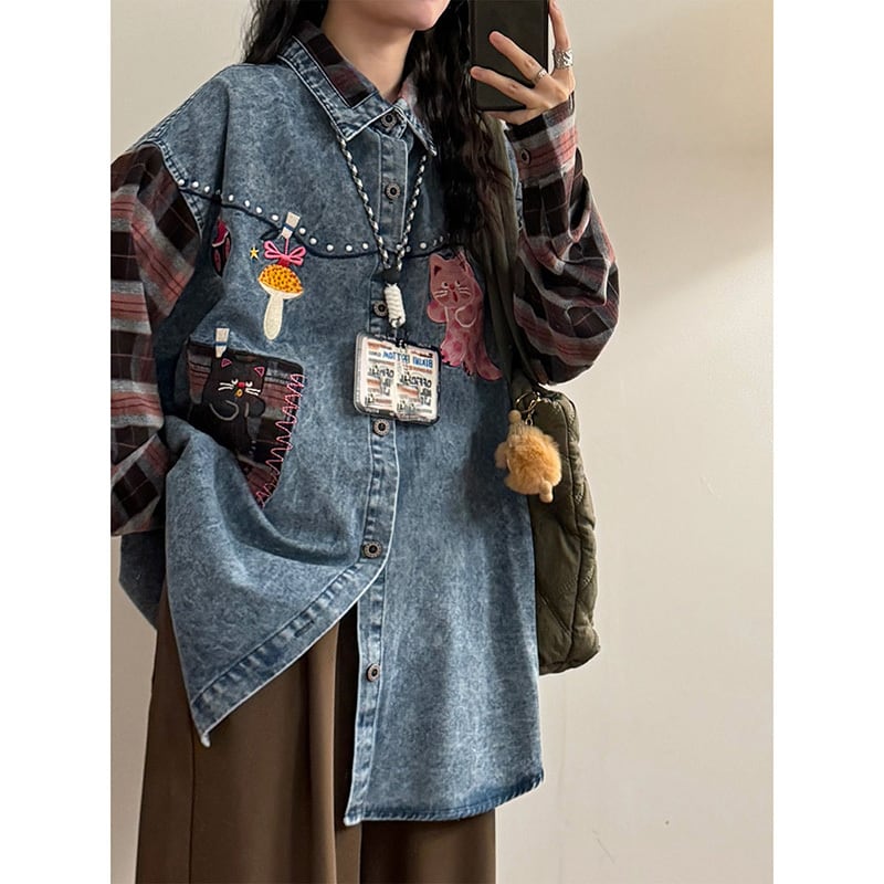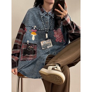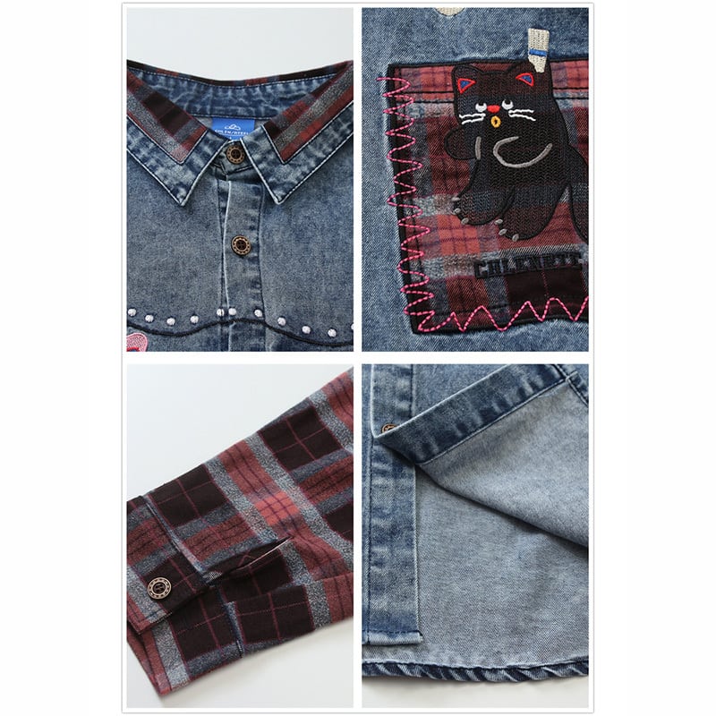 【UATONLINEシリーズ】★シャツ★ トップス 男女兼用 メンズ 長袖シャツ デニム 切り替え チェック柄 猫 ねこ ネコ 可愛い
