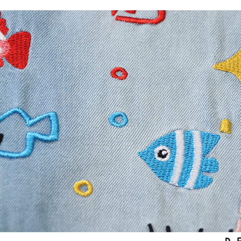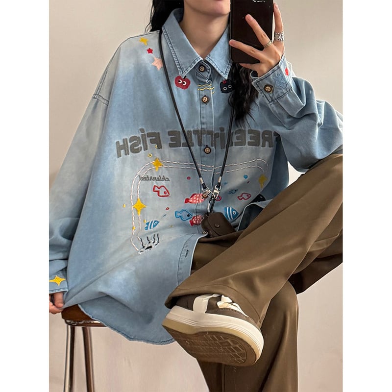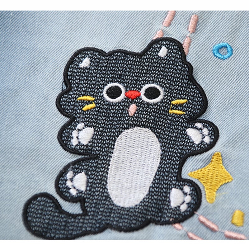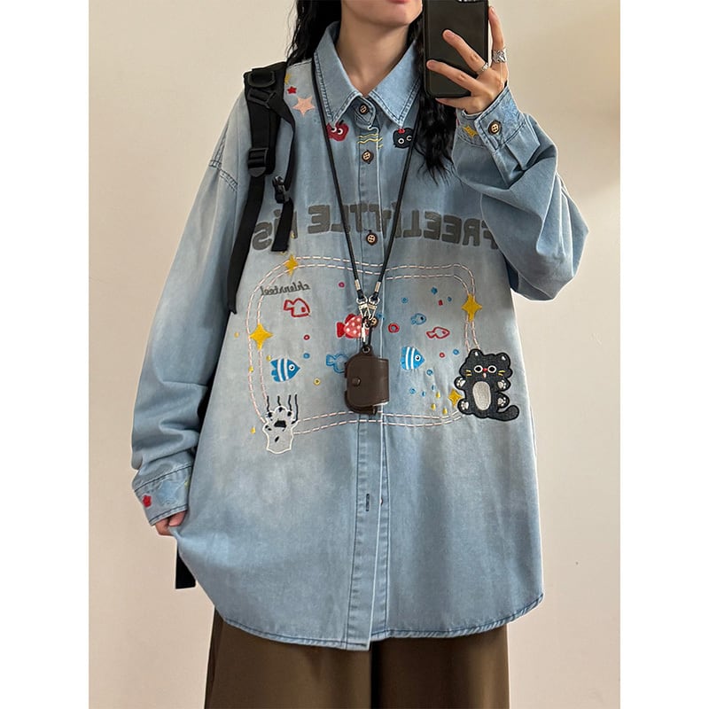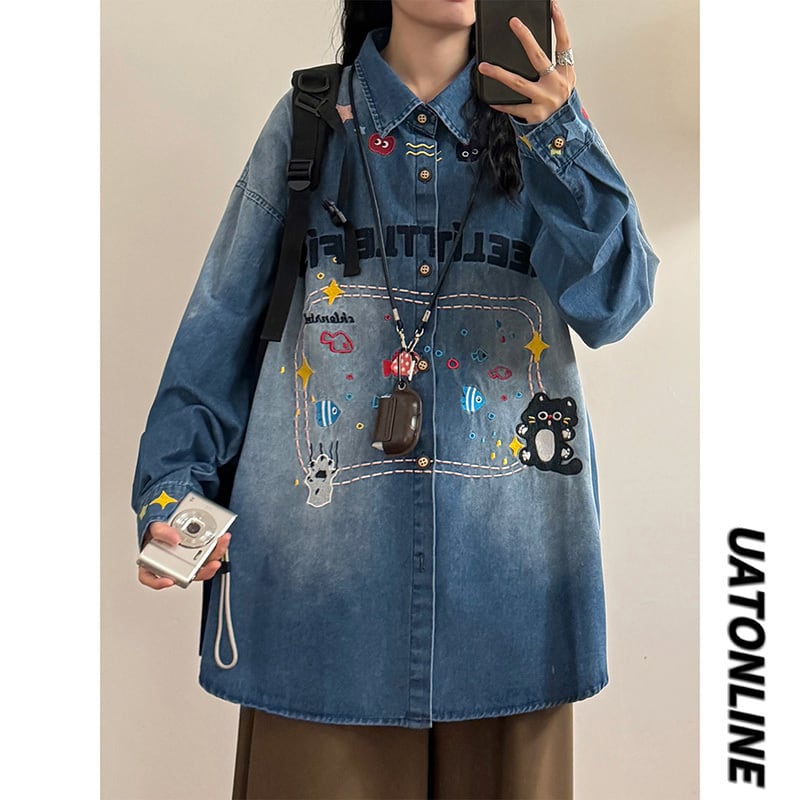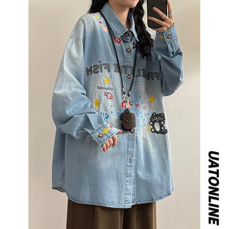 【UATONLINEシリーズ】★シャツ★ 2color 刺繍 トップス 男女兼用 メンズ 長袖シャツ デニム 猫 ねこ ネコ 可愛い