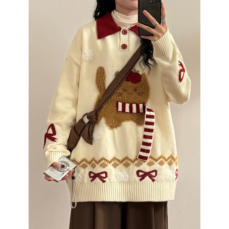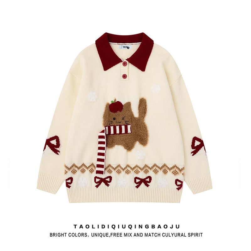 【UATONLINEシリーズ】★セーター★ 2color ニットトップス 男女兼用 メンズ POLOネック 猫 ねこ ネコ クリスマス 赤 可愛い