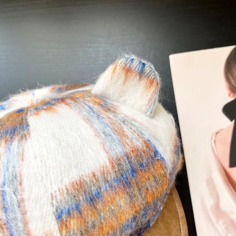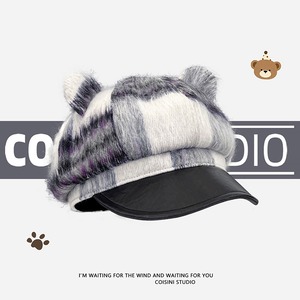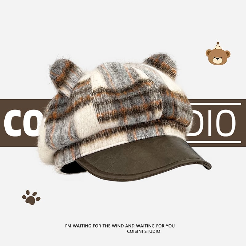 【COISINIシリーズ】★帽子★ 3color 熊耳 レトロ レディース 画家帽 デザイン性有り チェック柄 ラシャ 可愛い
