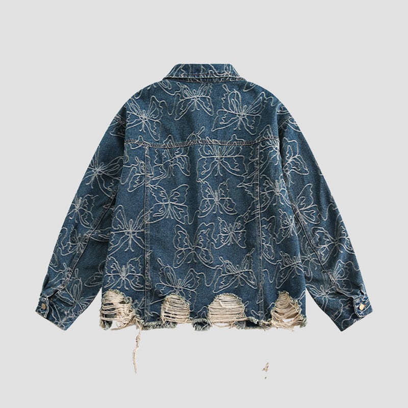 【Mmoptopシリーズ】★ジャケット★ アウター 男女兼用 メンズ デニムジャケット 蝶々 ダメージ加工 ブルー 青い