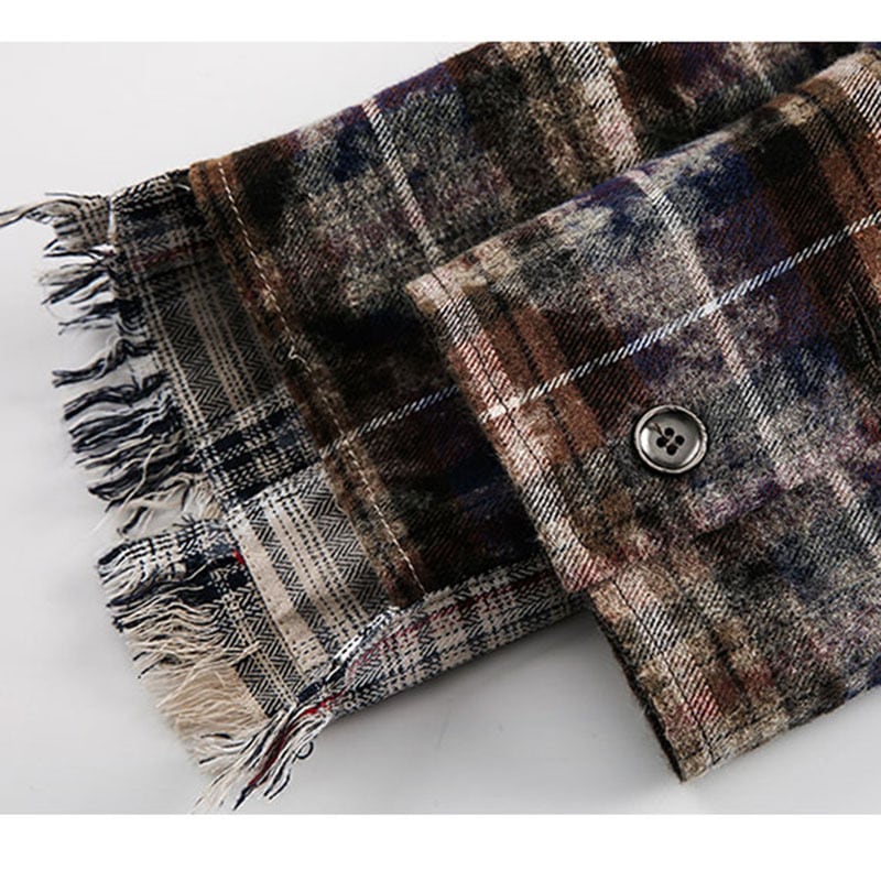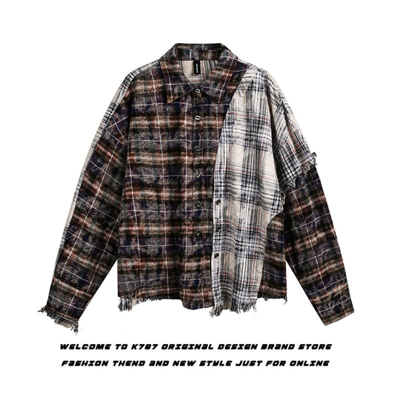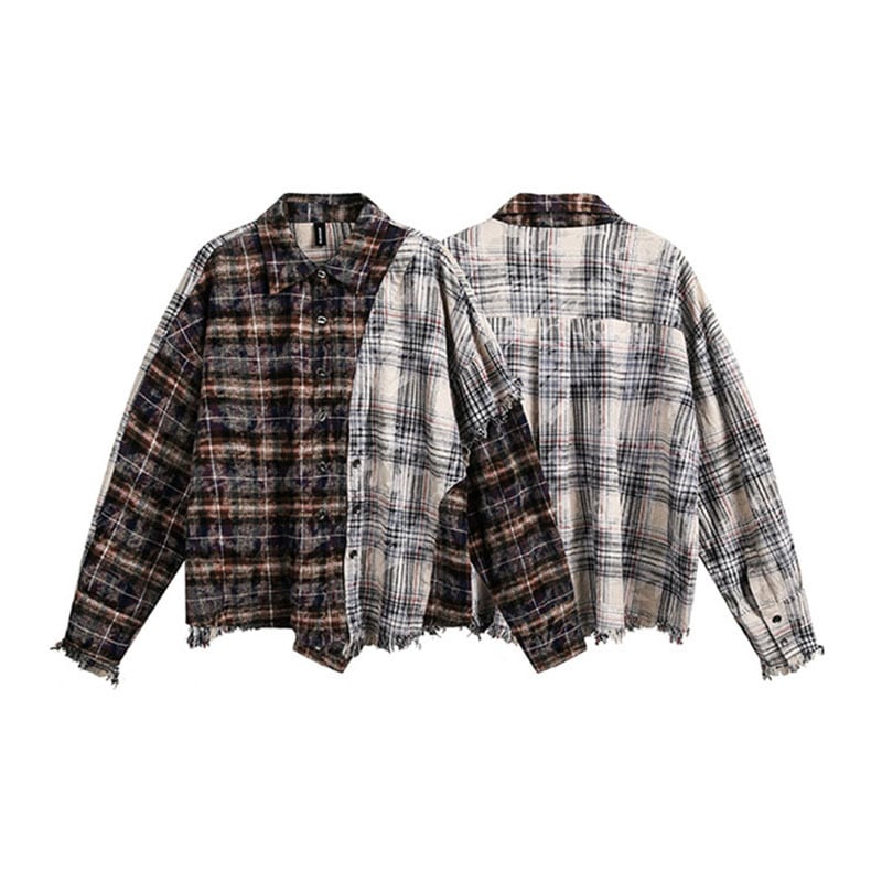 【Glaxhopシリーズ】★シャツ★ トップス 男女兼用 メンズ ウォッシュド加工 フリンジ チェック柄 ダメージ加工