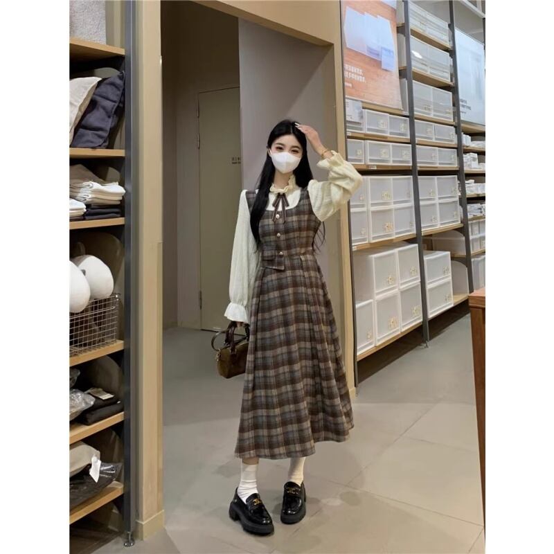 【JGJGシリーズ】★ワンピース★ ドレス リボン チェック柄 レディース ロング フェイクレイヤード 大きいサイズ 着痩せ
