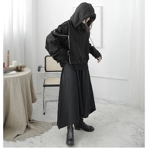 【隱覓シリーズ】★パーカー★ トップス ファスナー付き デザイン性有り ショート丈 ゆったり 不規則 ブラック 黒