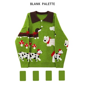 ♥遊び心のビンテージニット! 【Blank paletteシリーズ】★セーター★ ジャカード ポロカラー 2color ニットトップス 男女兼用 緑