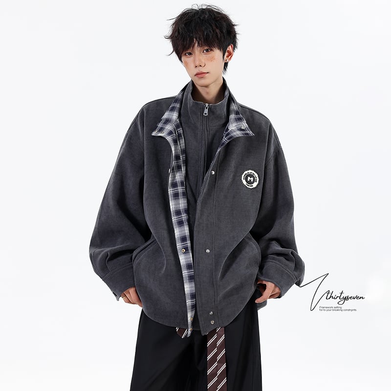 ☃ 重ね着の美学!【Qotriockシリーズ】★ジャケット★ コーデュロイ フェイクレイヤード ユニセックス 3color チェック柄 黒 灰