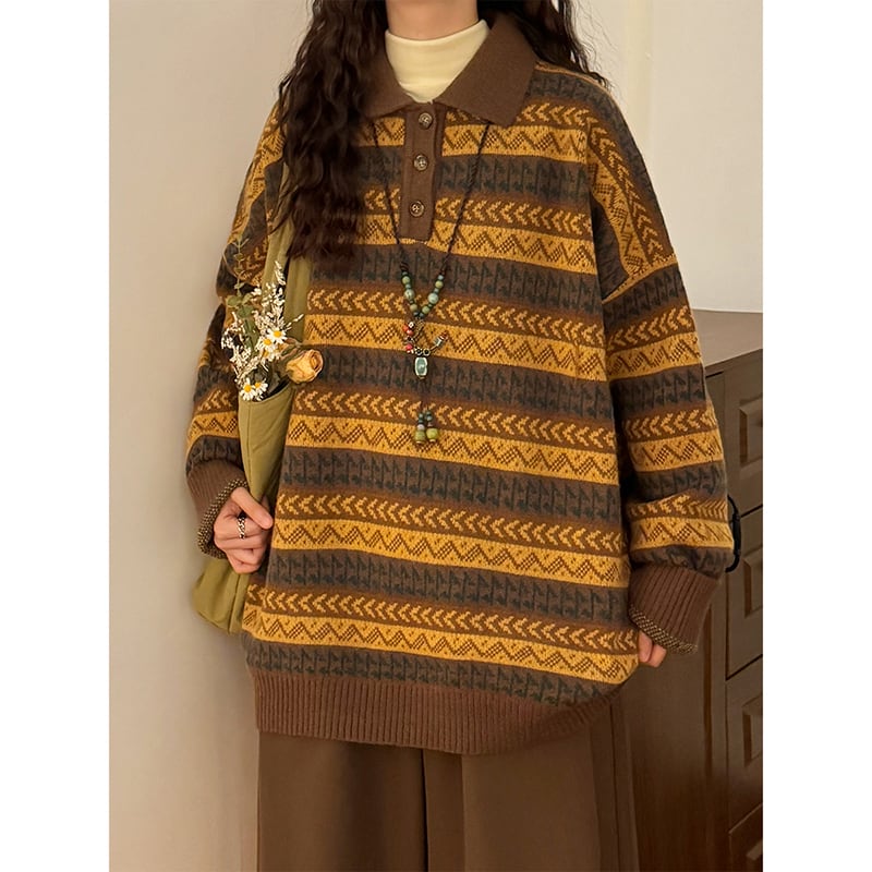 ♥ポロ襟がきまる、ビンテージニット!【UATONLINEシリーズ】★セーター★ ユニセックス ニットトップス 横縞 縞模様 POLOネック