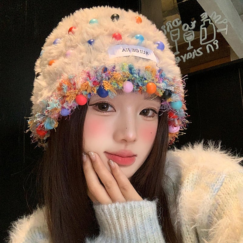 ☠カラービーズ モコモコニット帽!【WXFシリーズ】★帽子★ 4color ハット 配色 暖か アクセサリー レディース