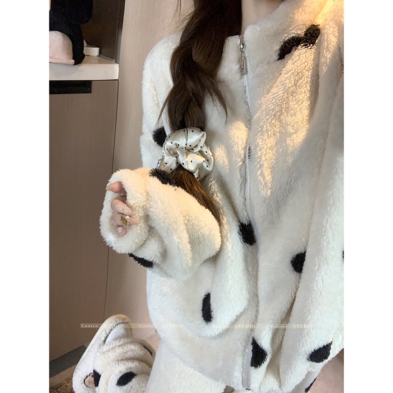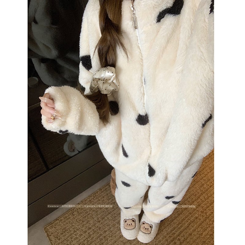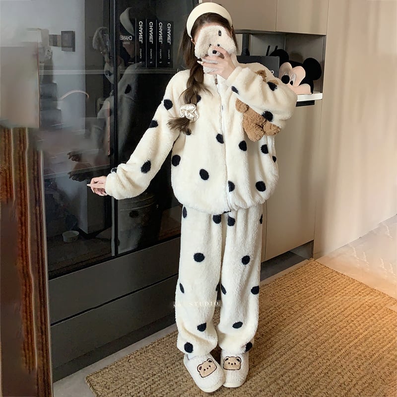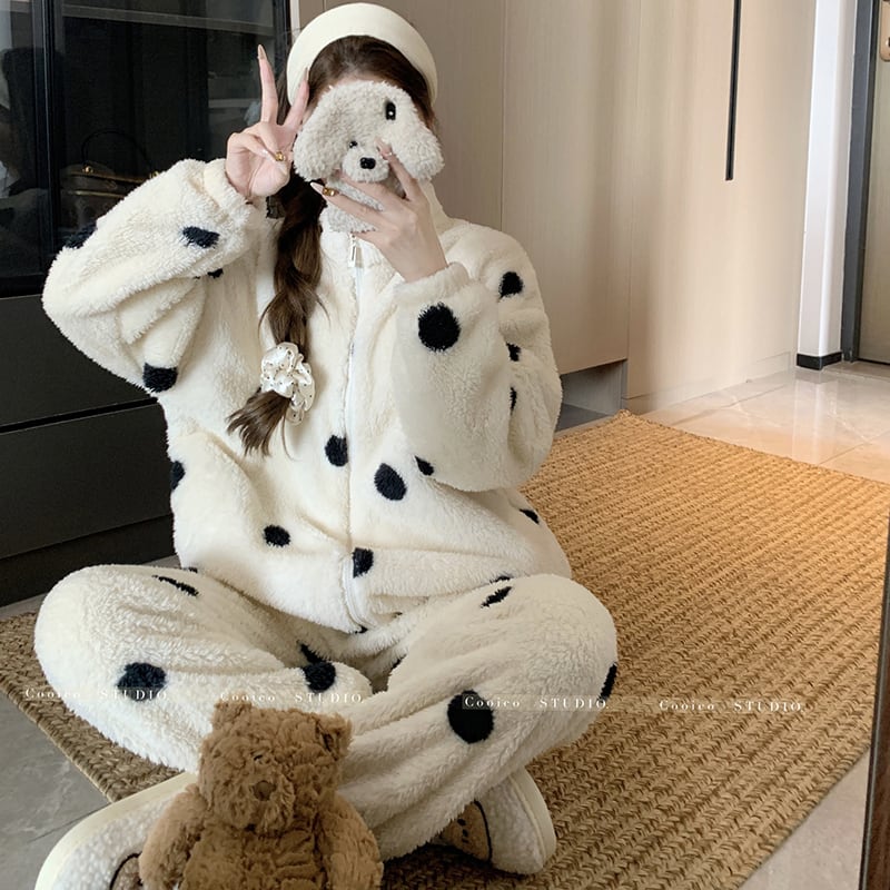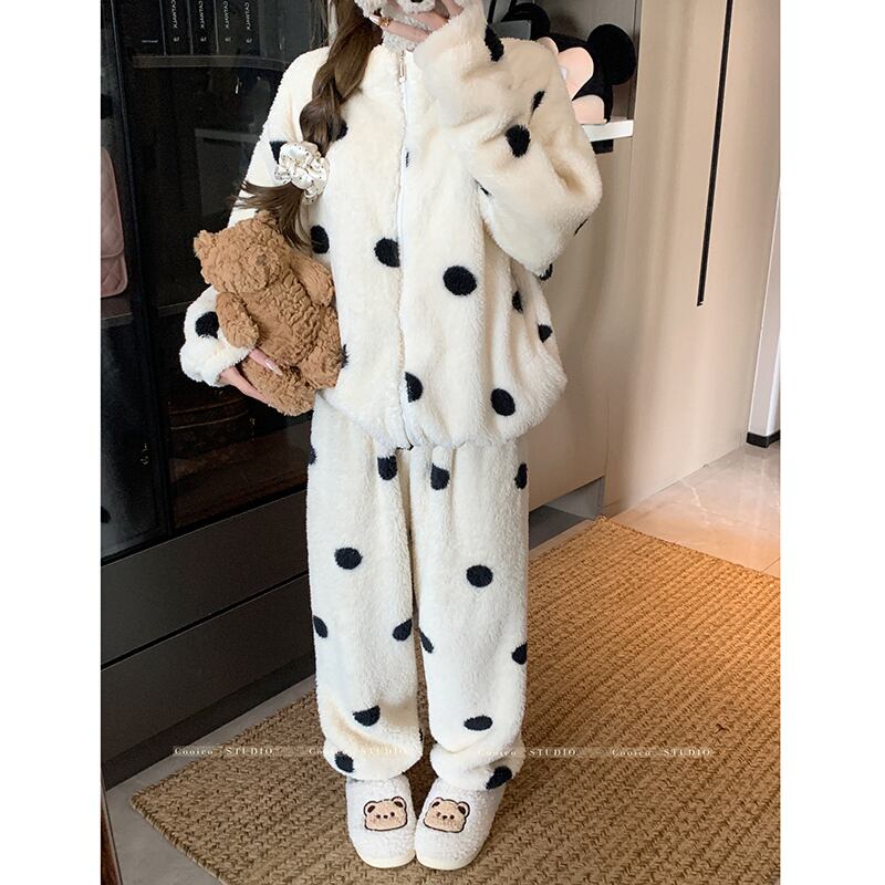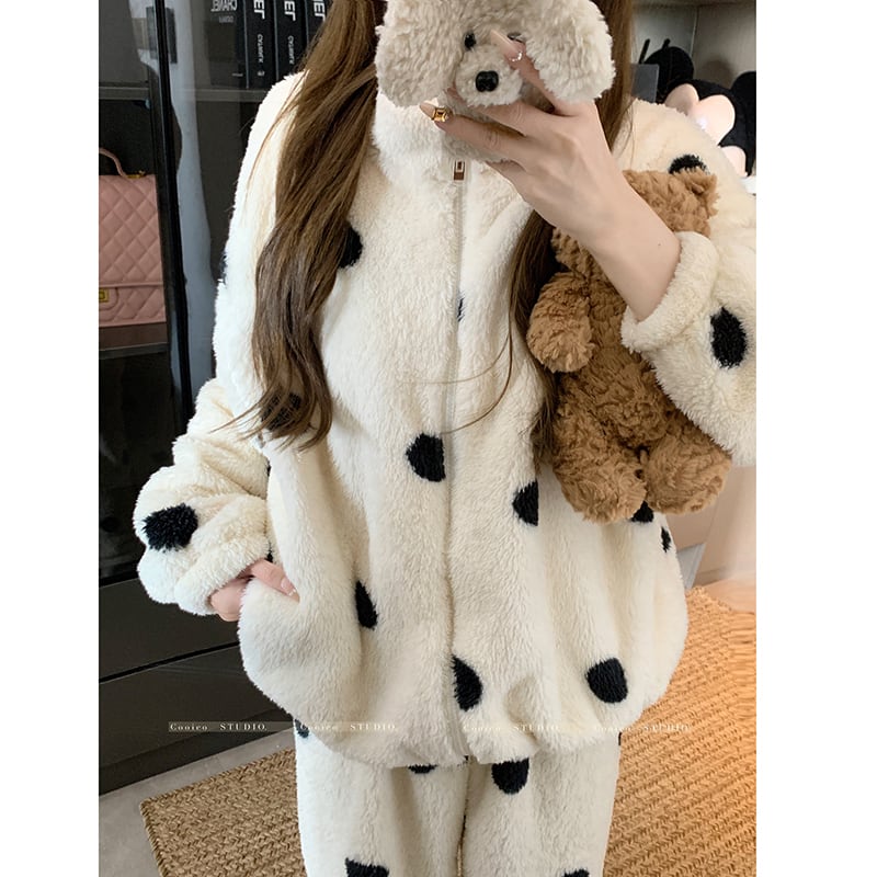 ✿冬のルームウェアセット!【KEKELIシリーズ】★パジャマ★ もふもふ ドット柄 2点セット トップス+ズボン レディース 部屋着 ルームウェア