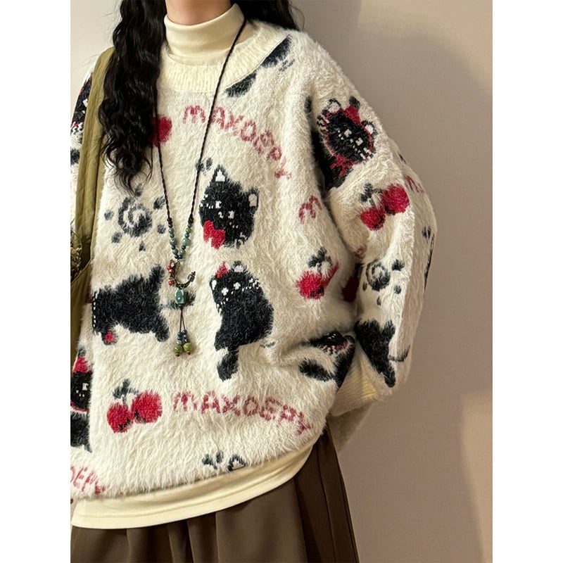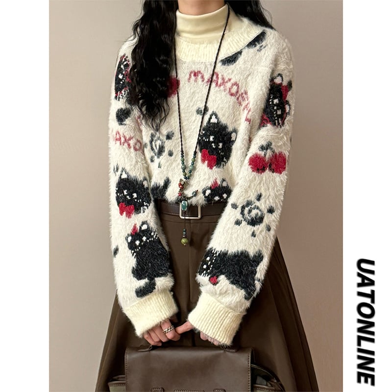 ♥愛らしいチェリー&猫柄ニット!【UATONLINEシリーズ】★セーター★ ユニセックス ニットトップス 猫 ねこ ネコ