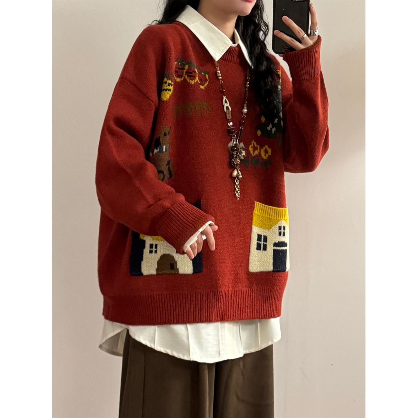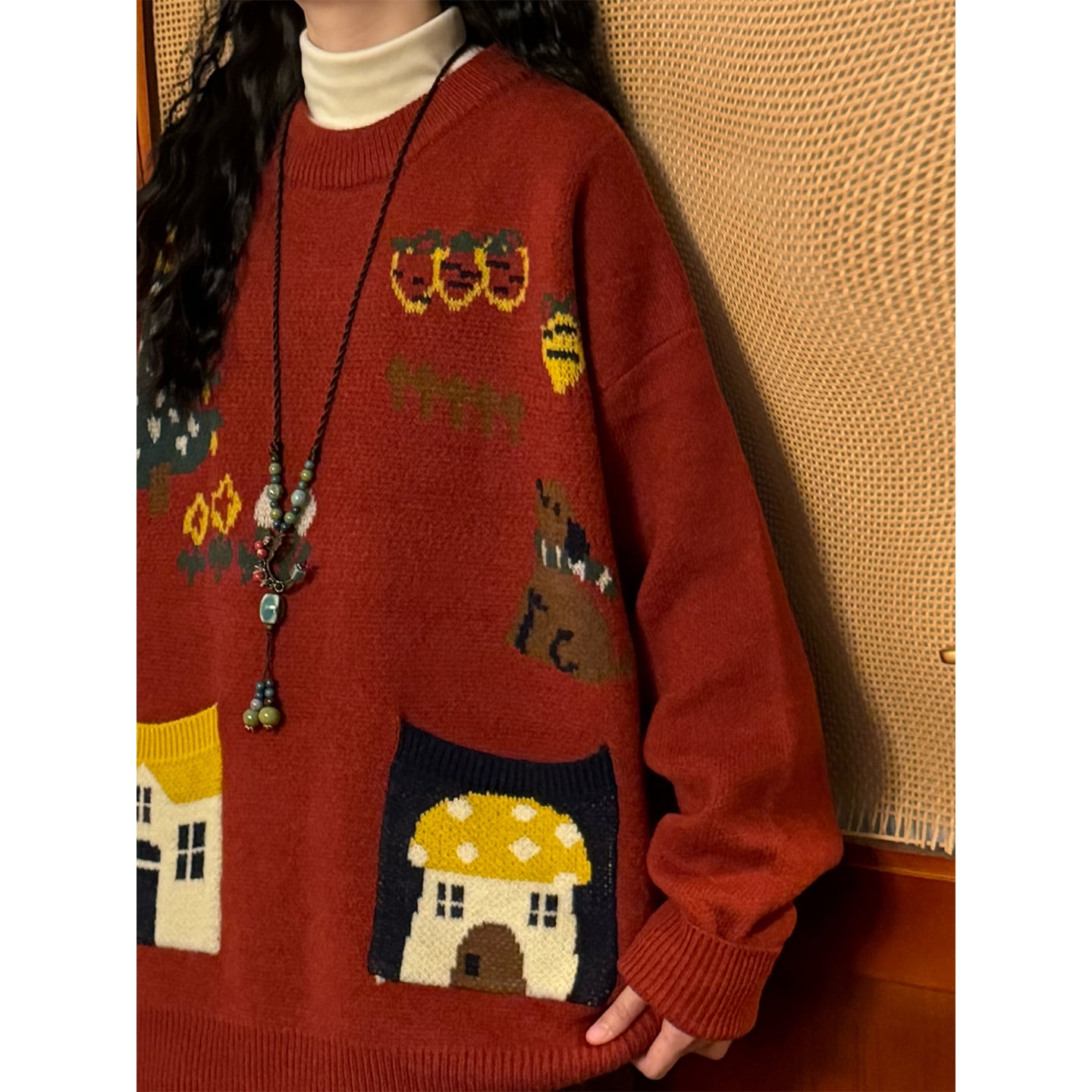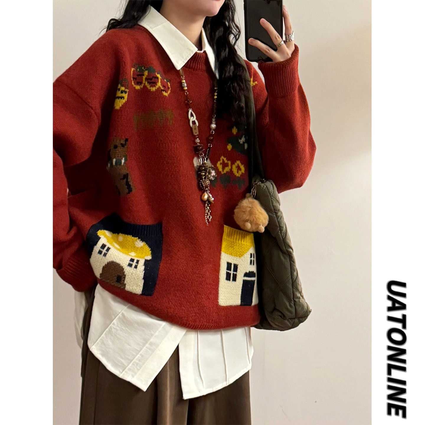 ♥クリスマスツリーモチーフ赤いニット!【UATONLINEシリーズ】★セーター★ ユニセックス ニットトップス クリスマス 新年 レッド