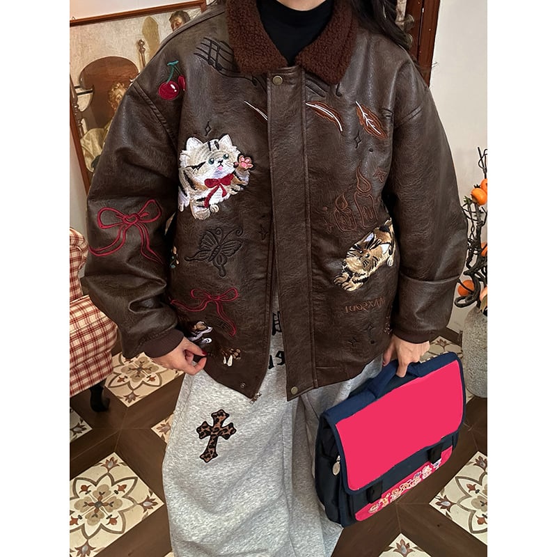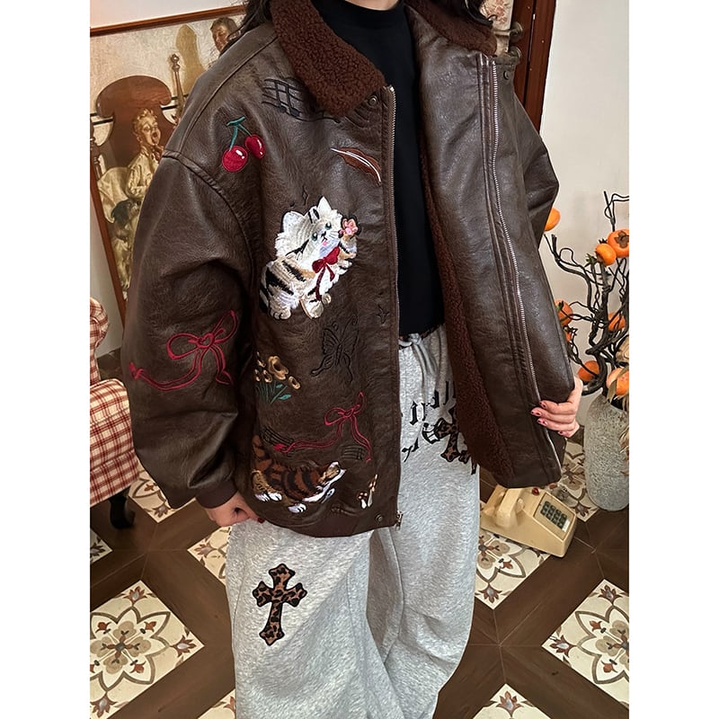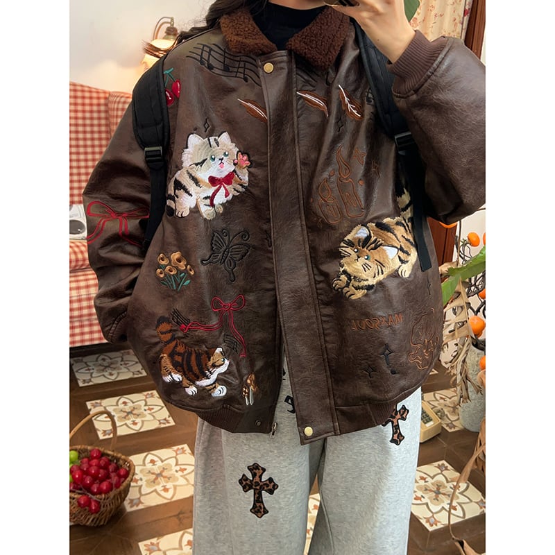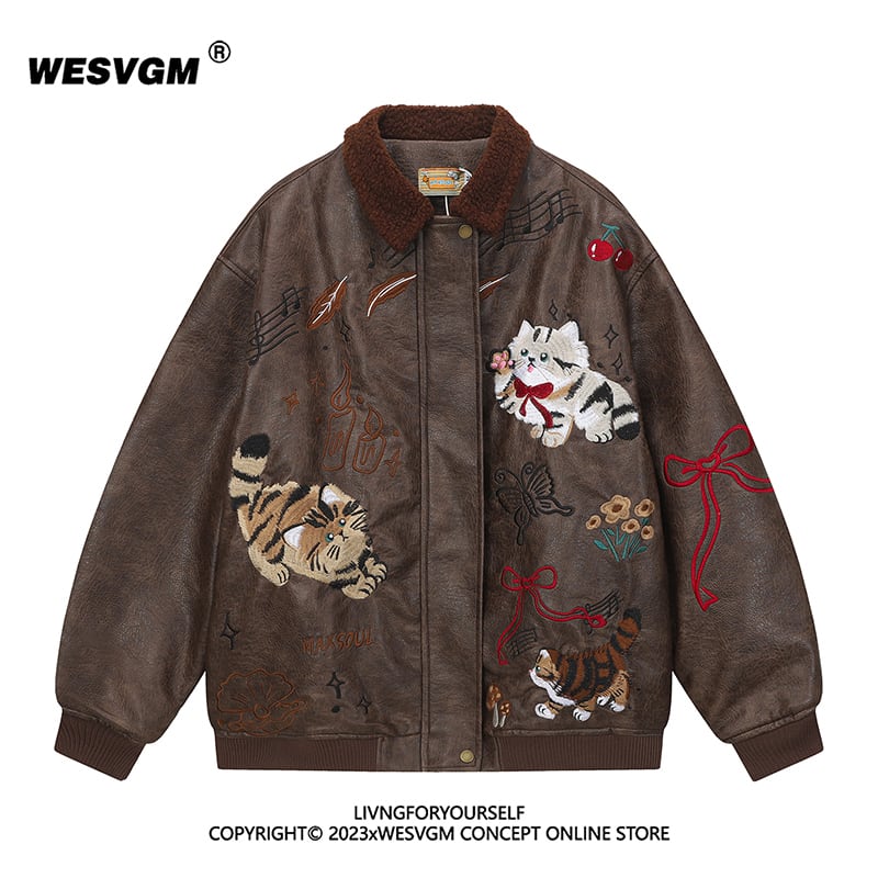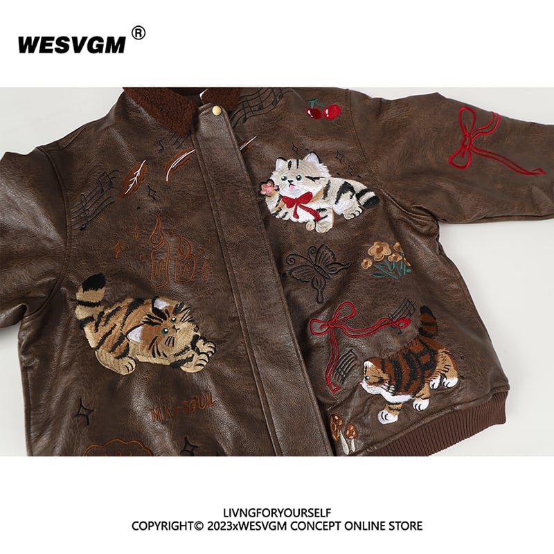 ✿猫刺繍裏起毛PUジャケット!【WESVGMシリーズ】★コート★ ユニセックス 冬用コート アウター メンズ 裏起毛 ジャケット