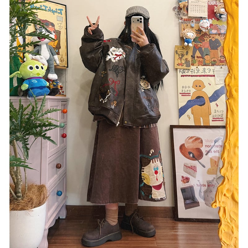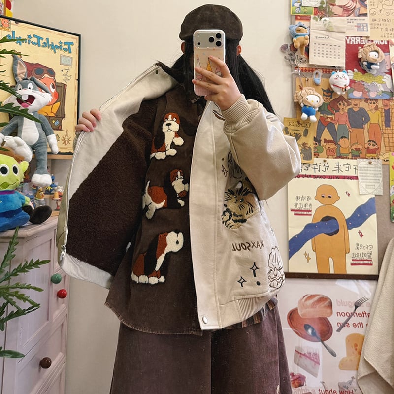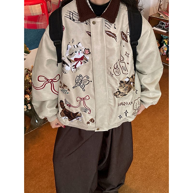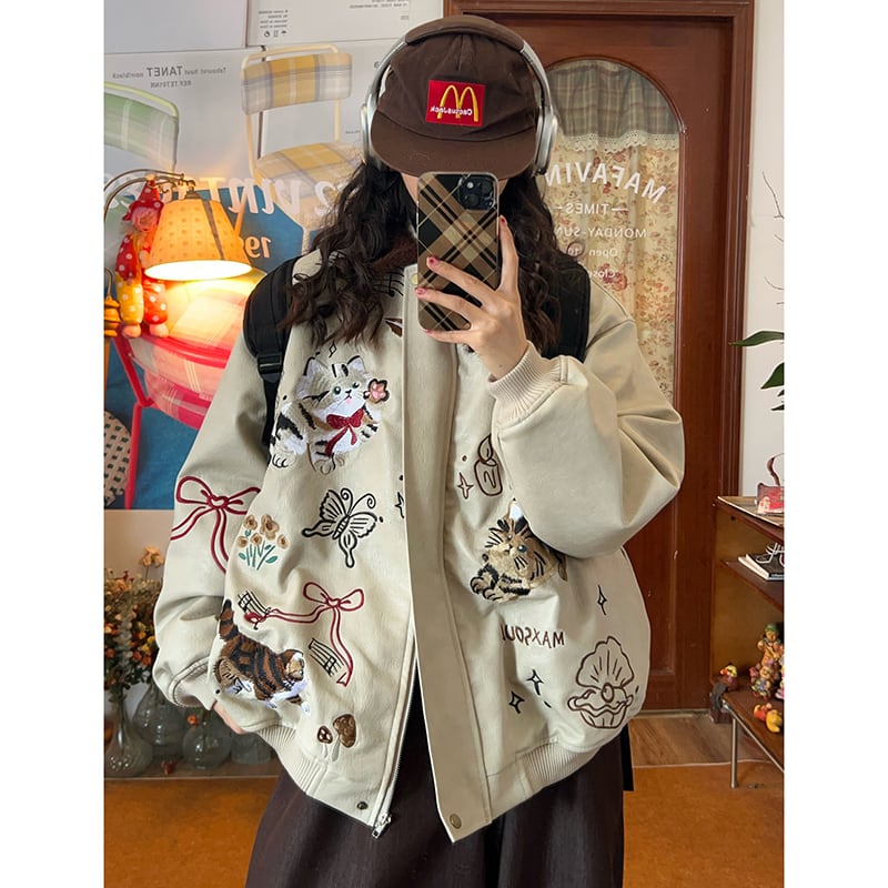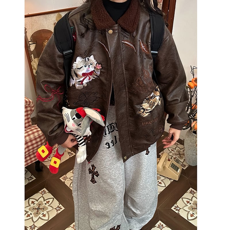 ✿猫刺繍裏起毛PUジャケット!【WESVGMシリーズ】★コート★ ユニセックス 冬用コート アウター メンズ 裏起毛 ジャケット