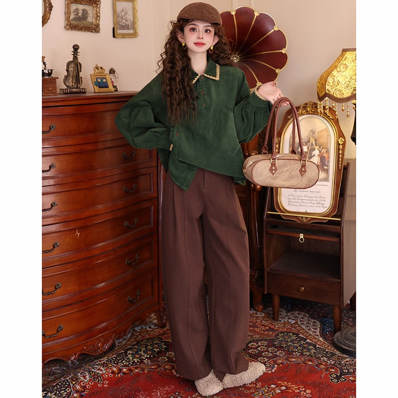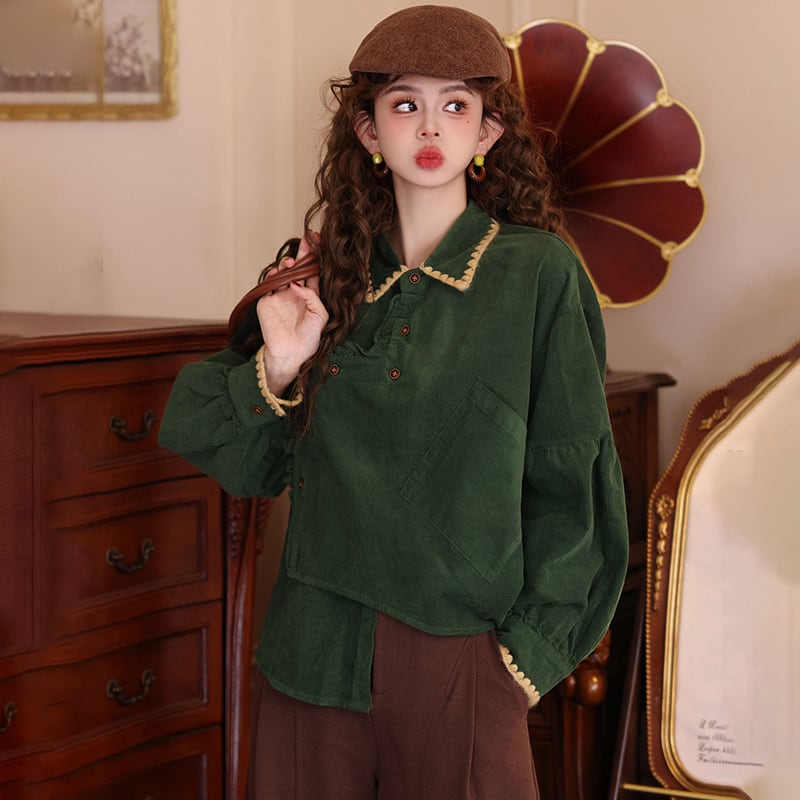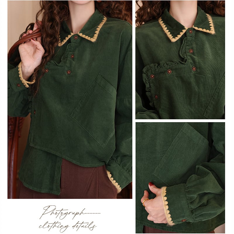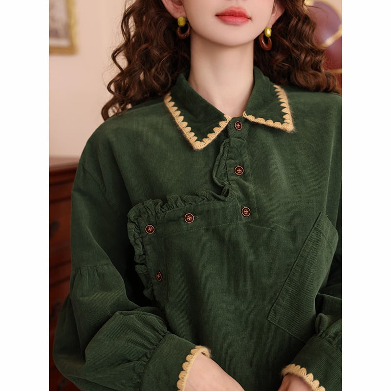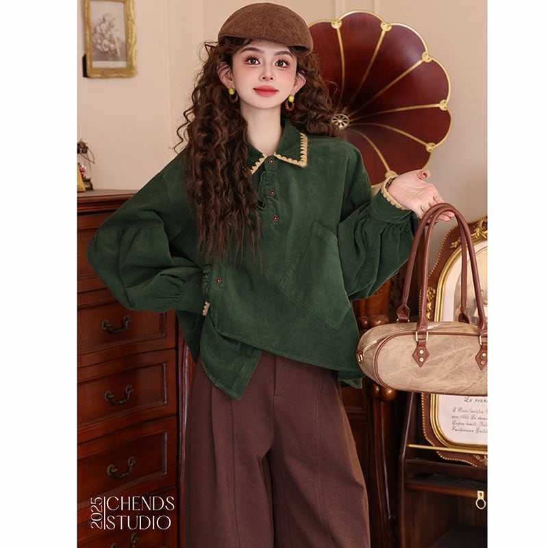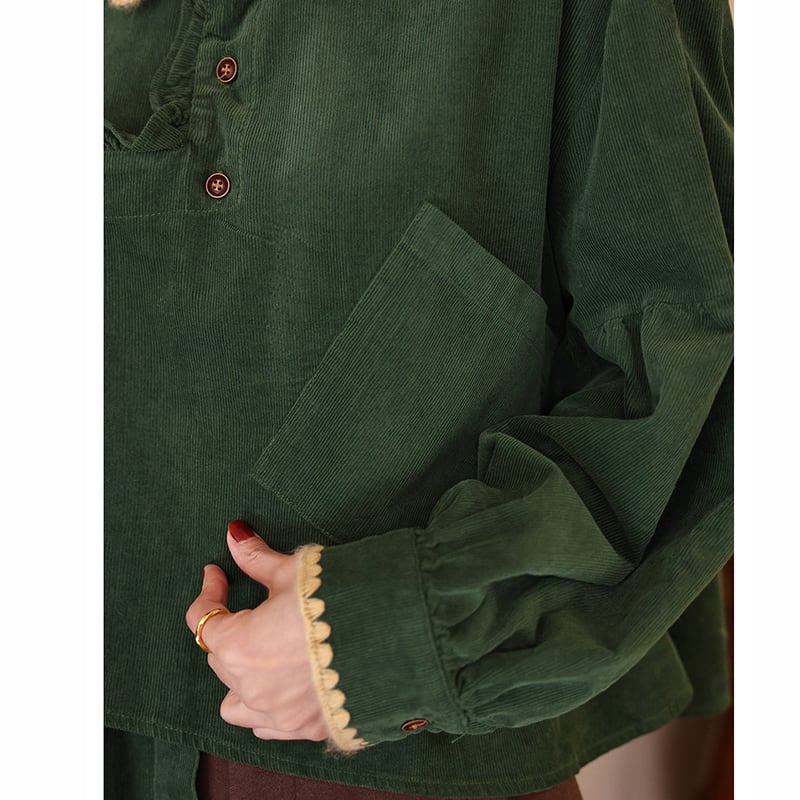 ♥不均一な美、コールデンシャツ!【CHENDSシリーズ】★シャツ★ トップス 長袖シャツ レディース グリーン 緑 コーデュロイ