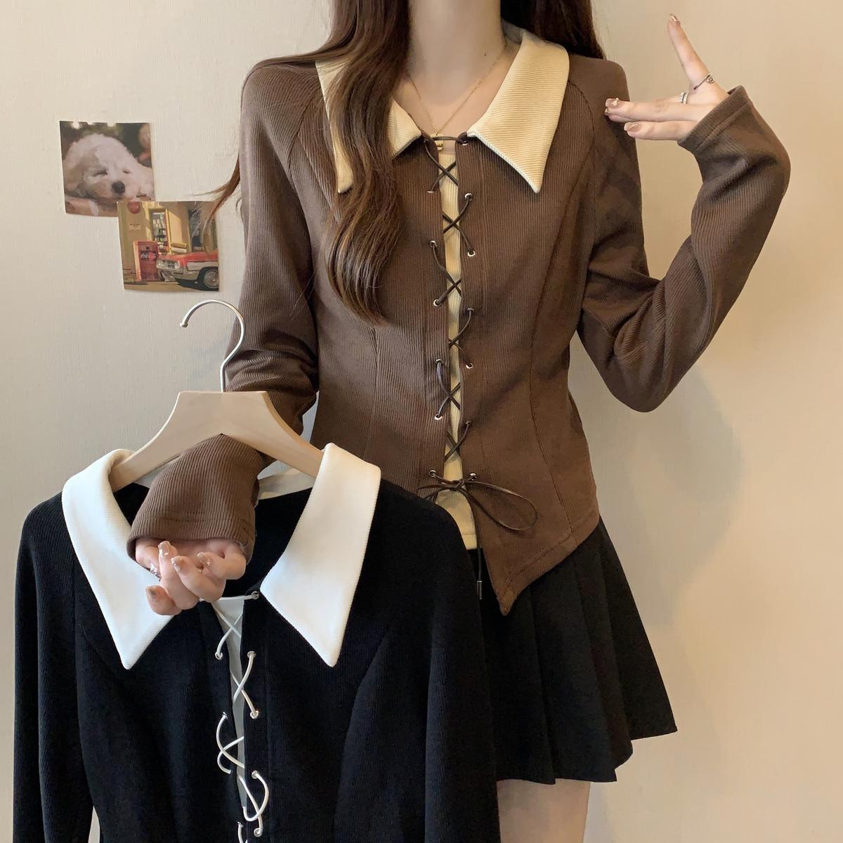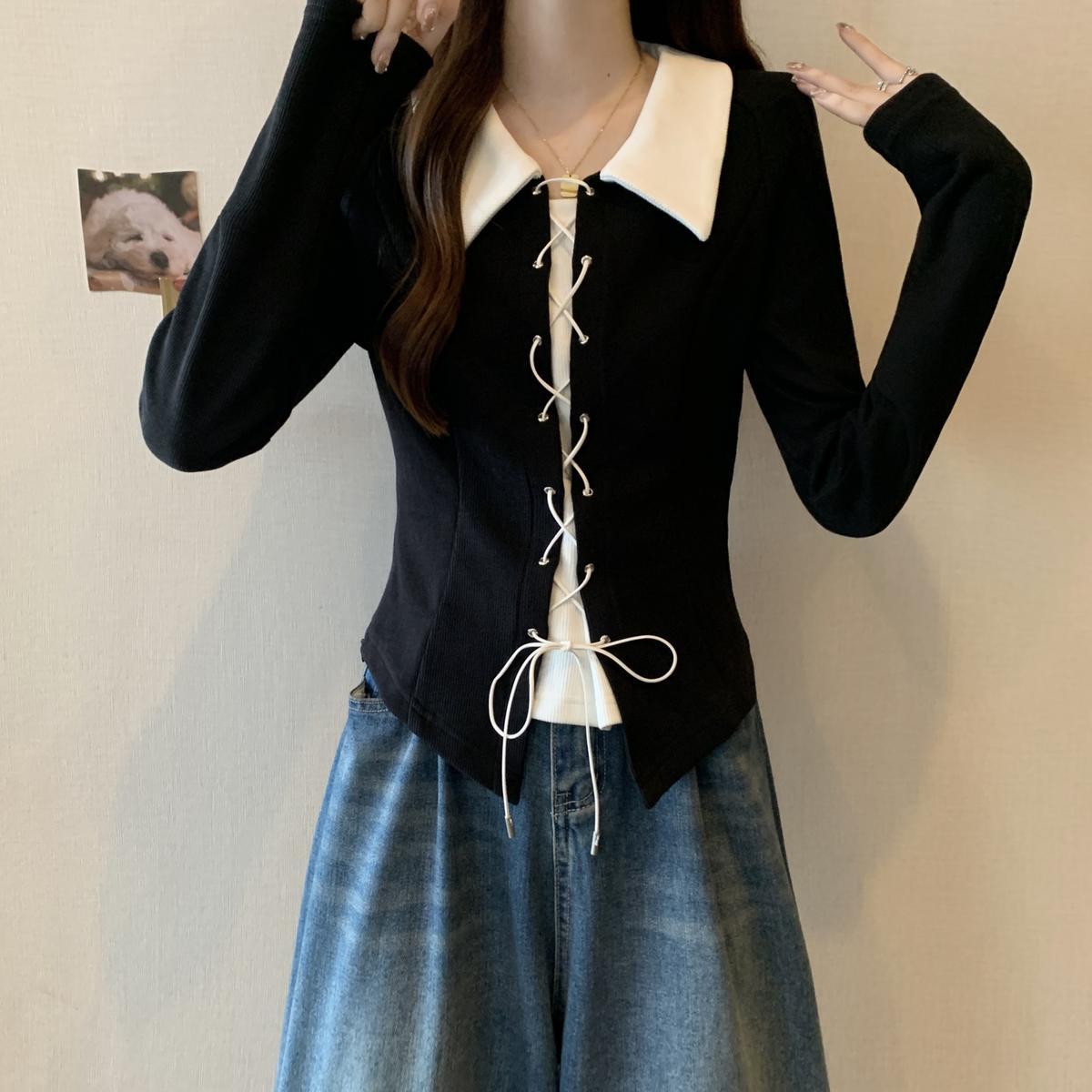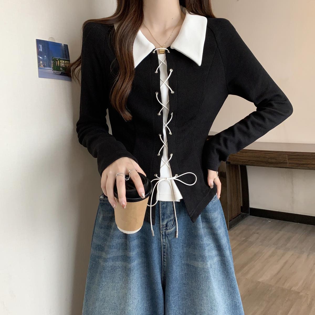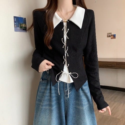♥大人可愛い、ポロカラーとリボン!【YQYシリーズ】★POLOシャツ★ 2color トップス 長袖 フェイクレイヤード