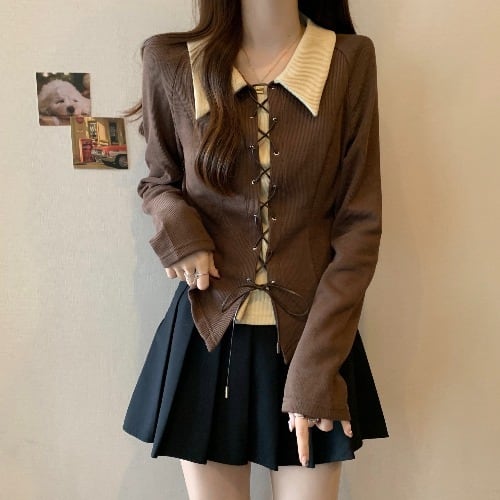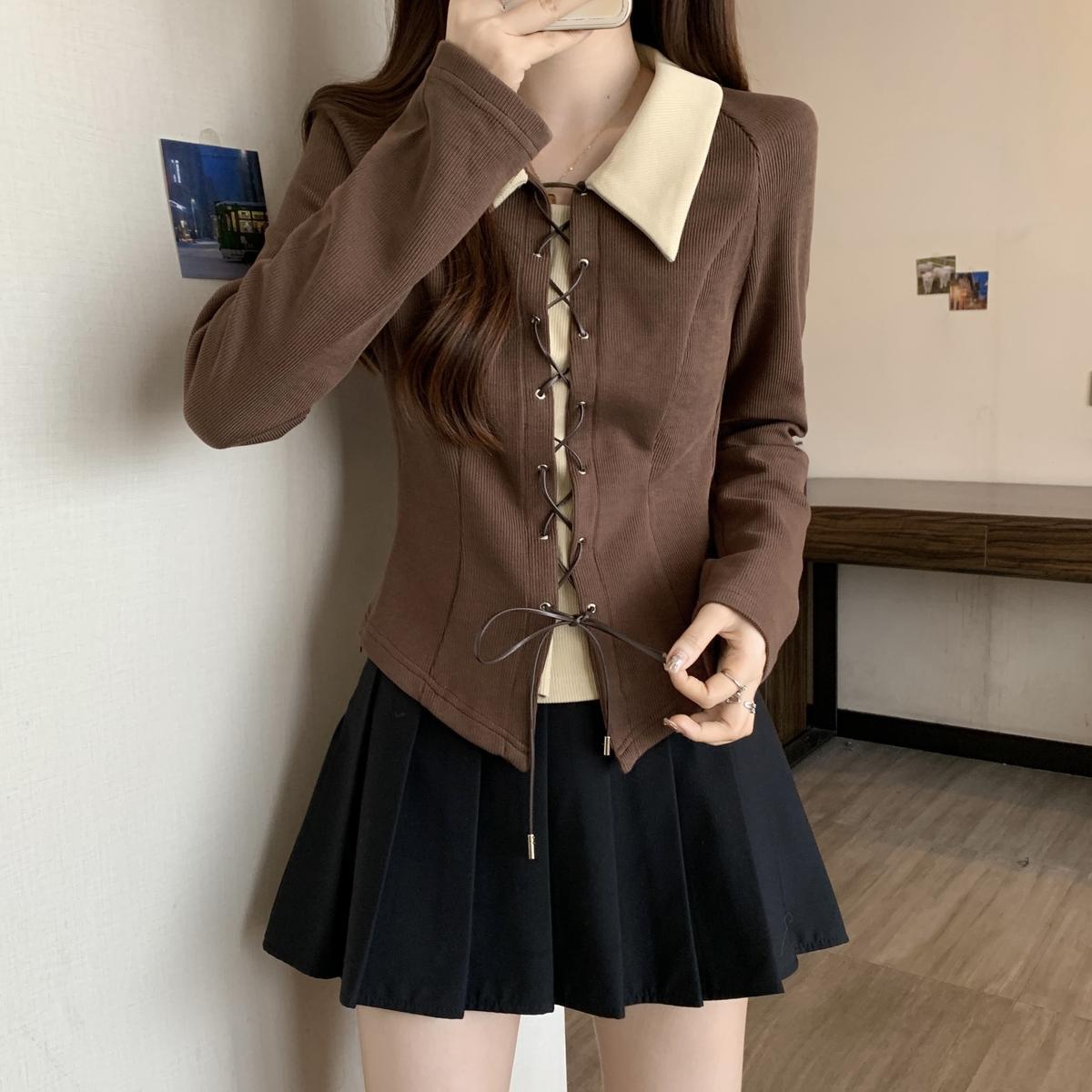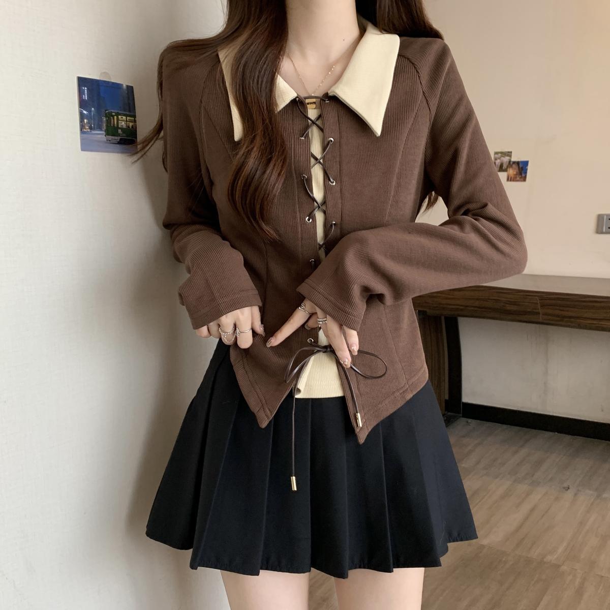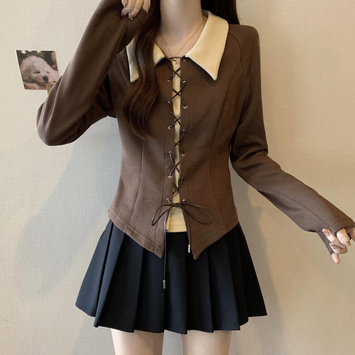 ♥大人可愛い、ポロカラーとリボン!【YQYシリーズ】★POLOシャツ★ 2color トップス 長袖 フェイクレイヤード
