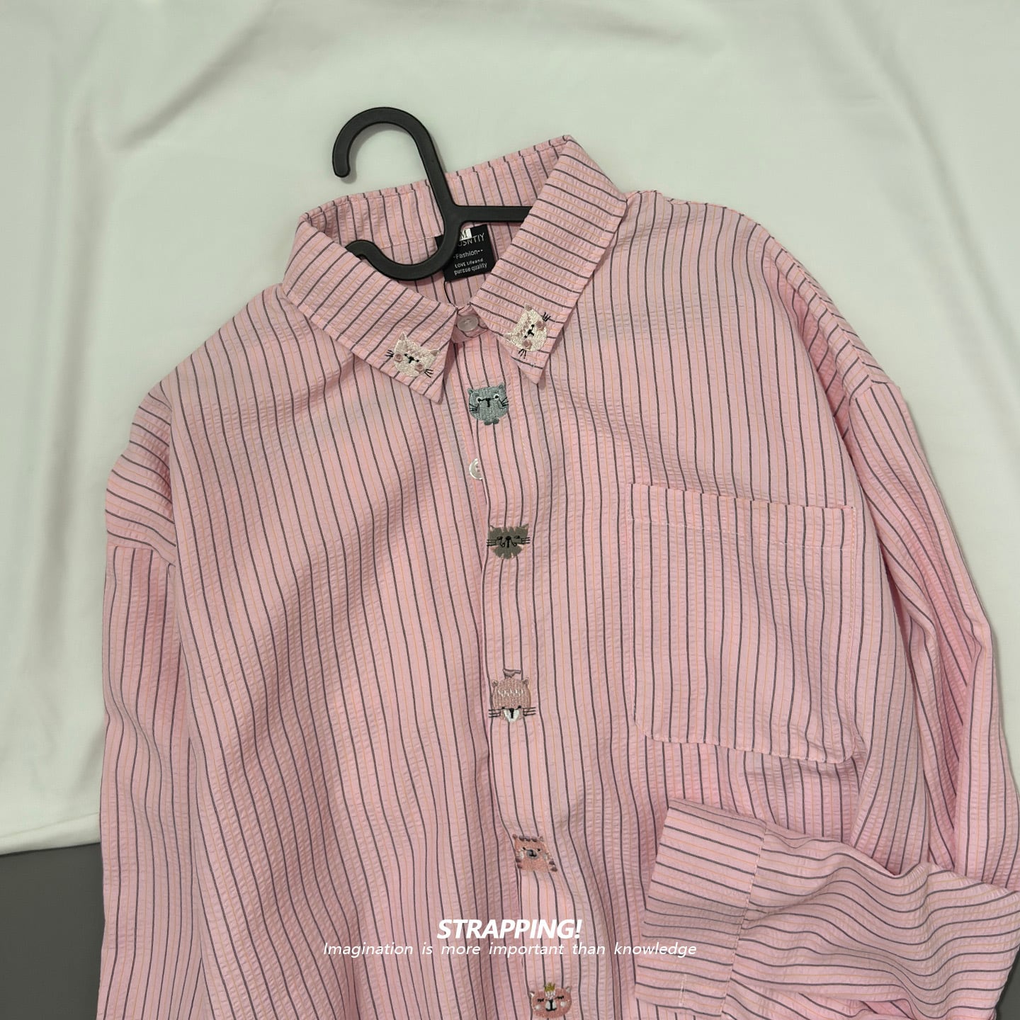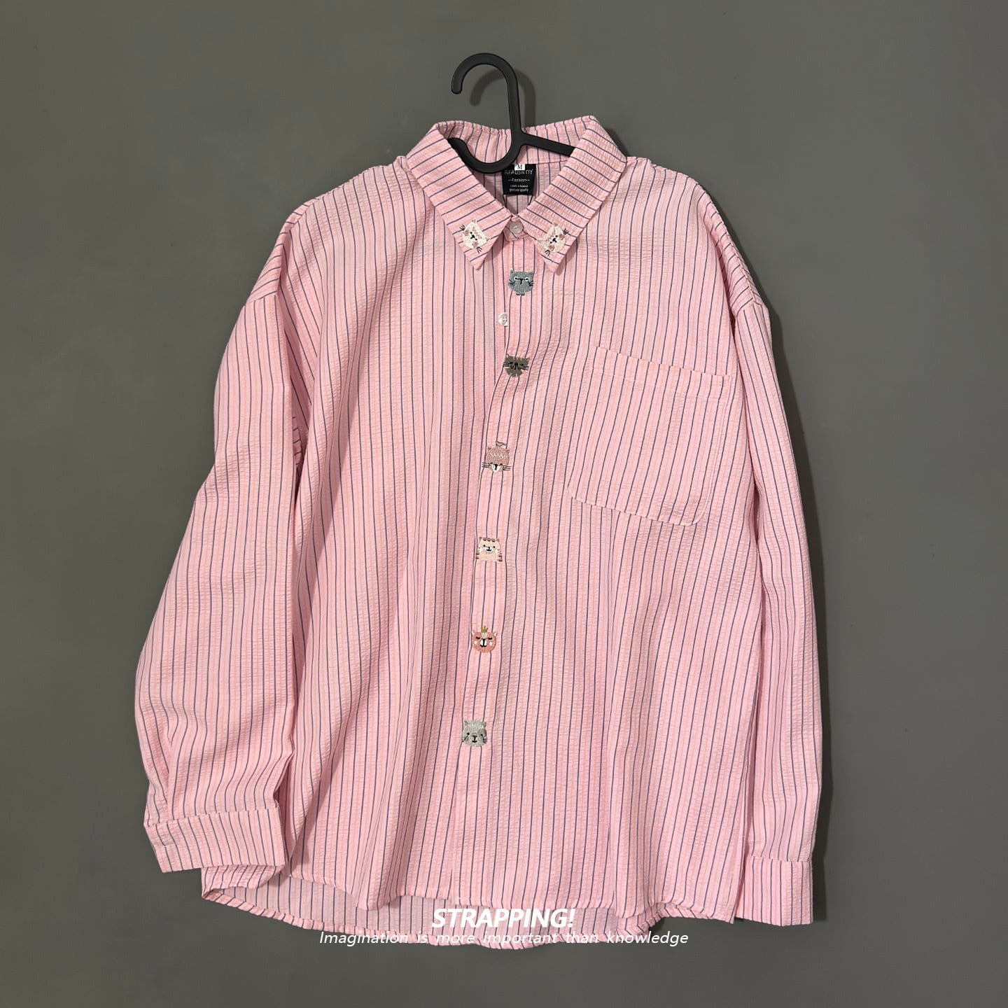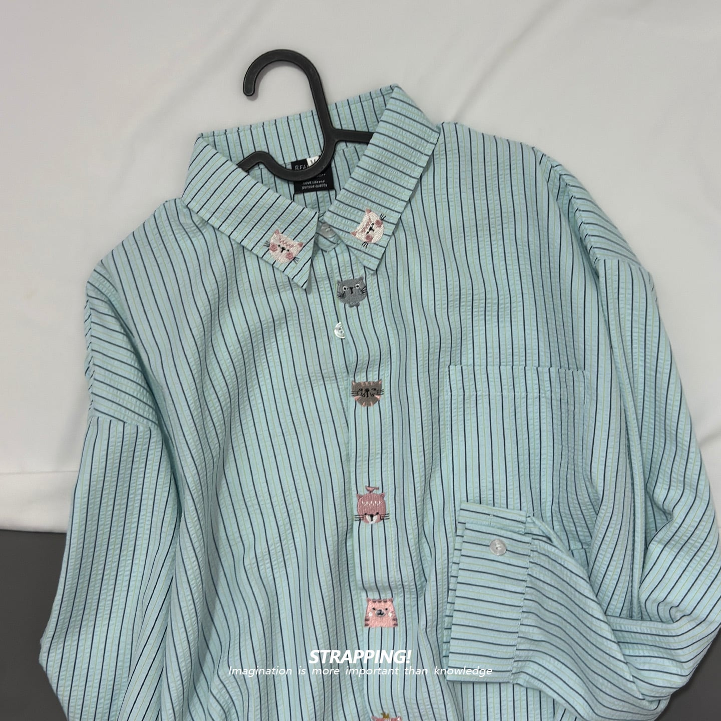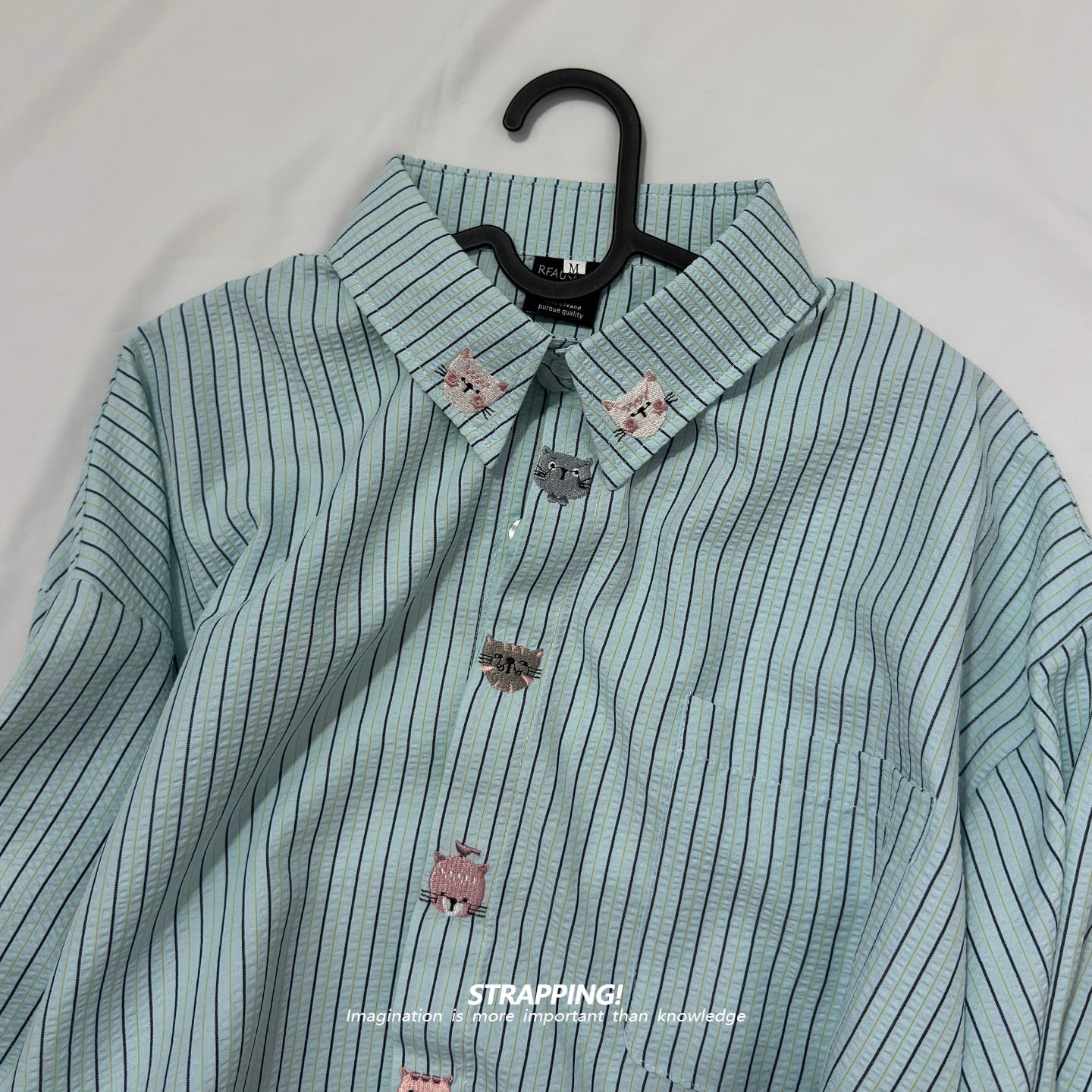 ♥猫刺繍入り縦縞シャツ!【STRAPPINGシリーズ】★シャツ★ ユニセックス 3color トップス 長袖シャツ 縦縞 縞模様