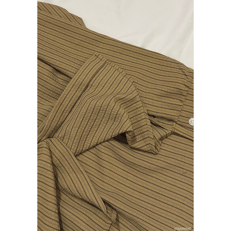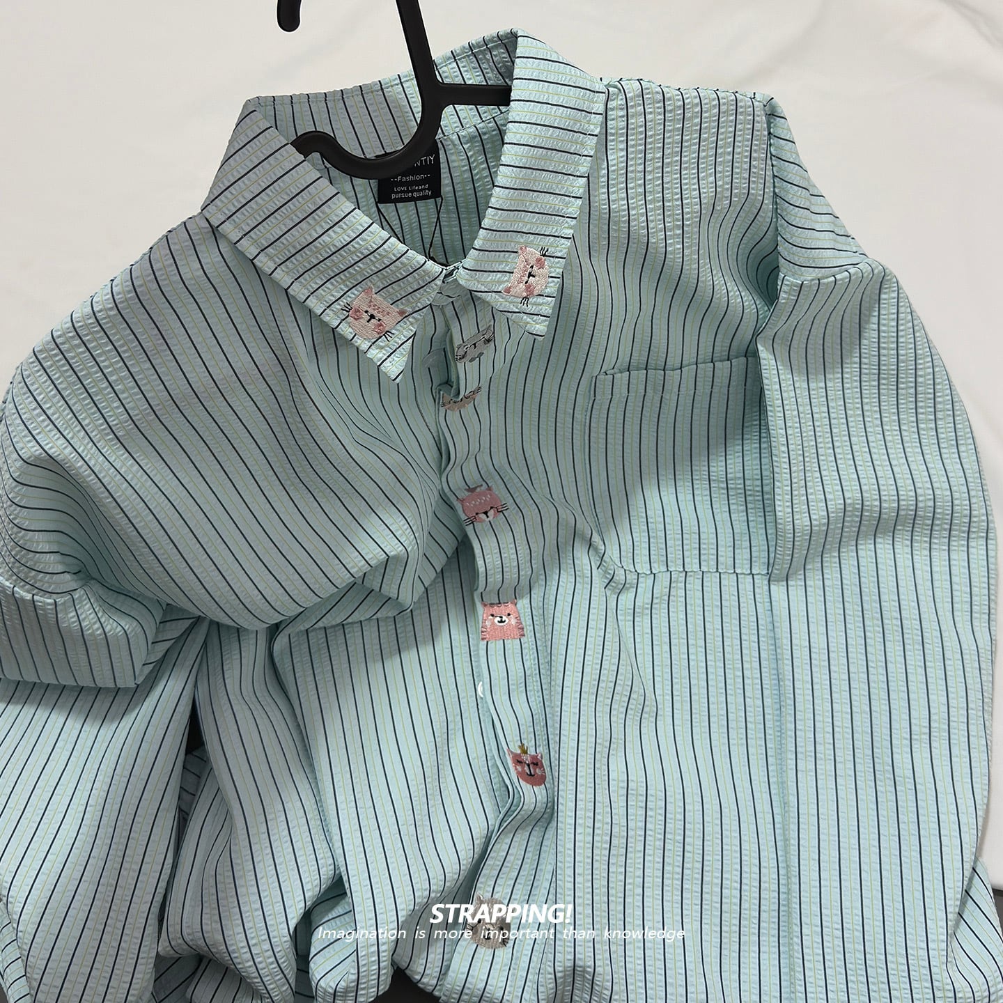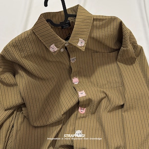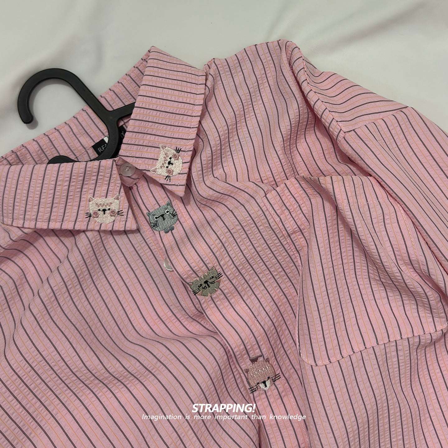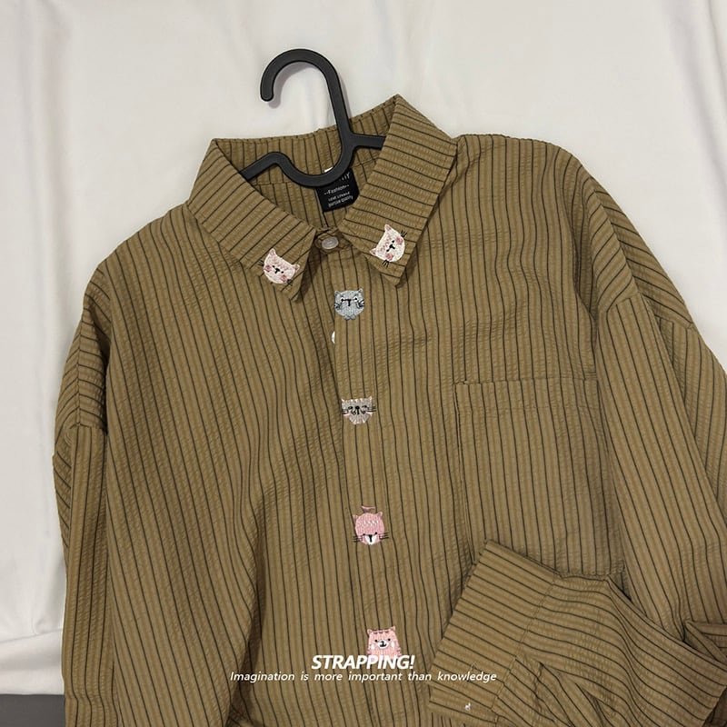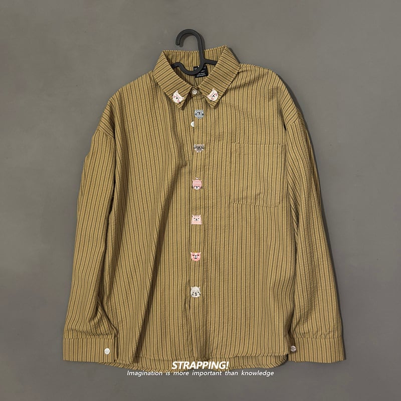 ♥猫刺繍入り縦縞シャツ!【STRAPPINGシリーズ】★シャツ★ ユニセックス 3color トップス 長袖シャツ 縦縞 縞模様
