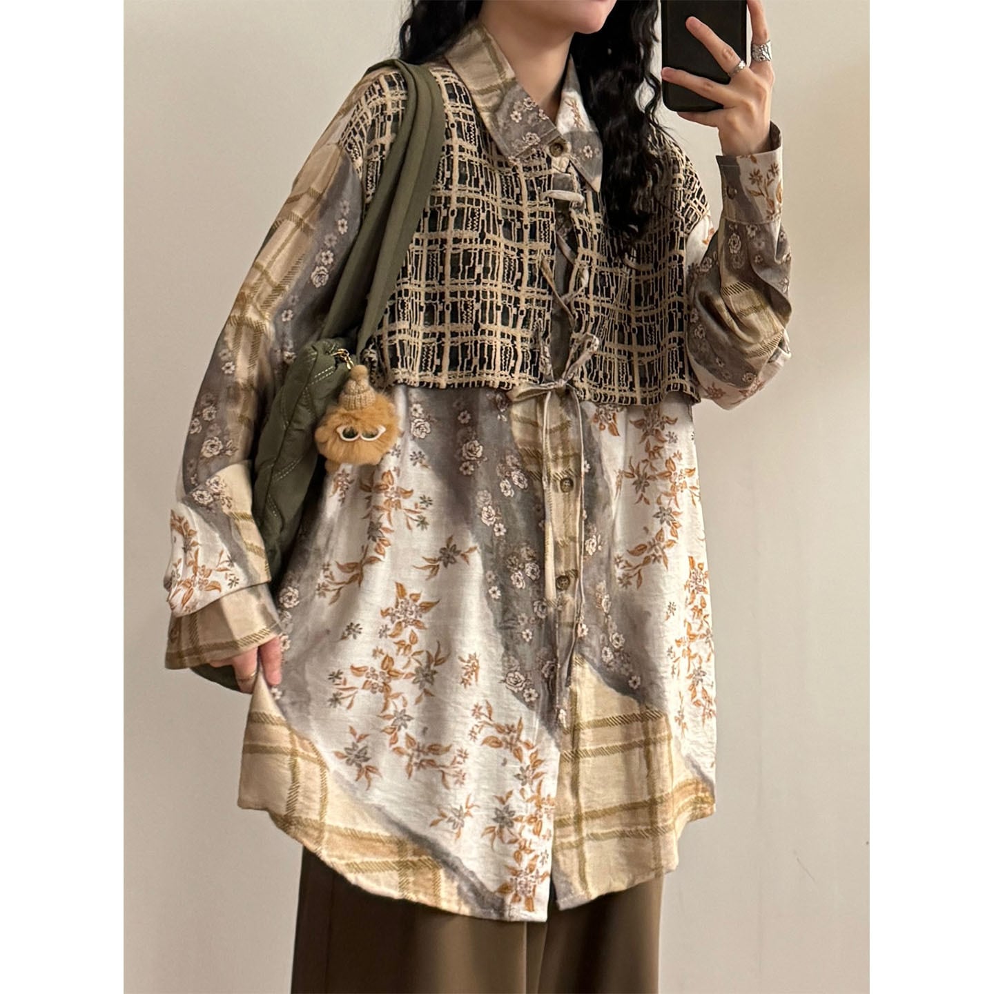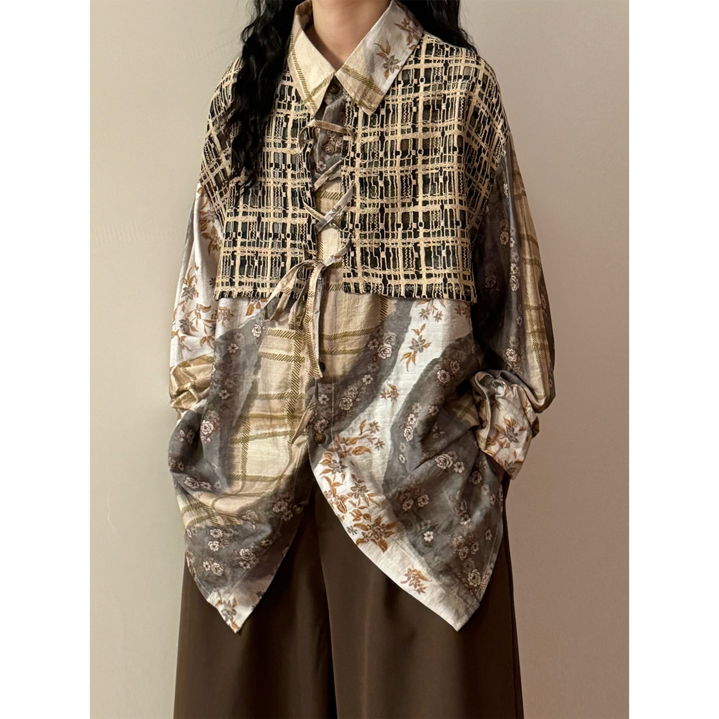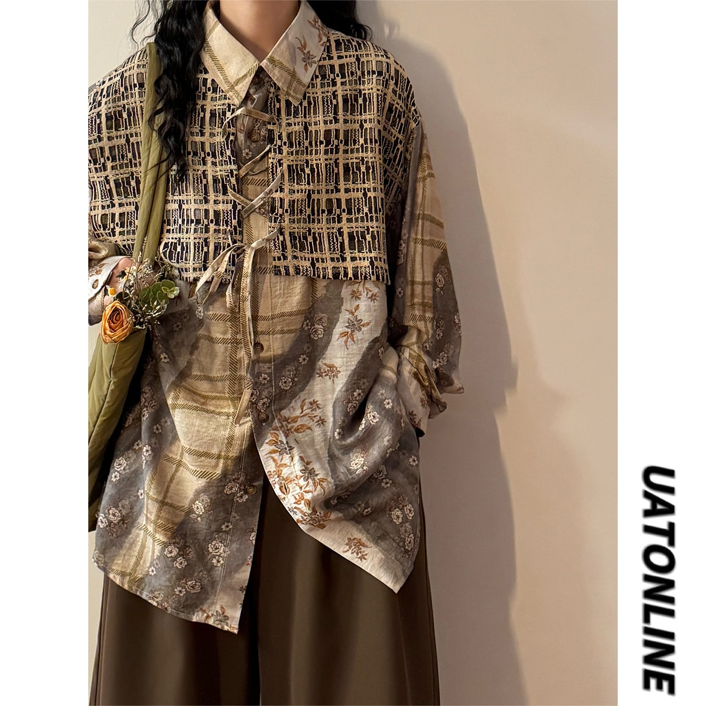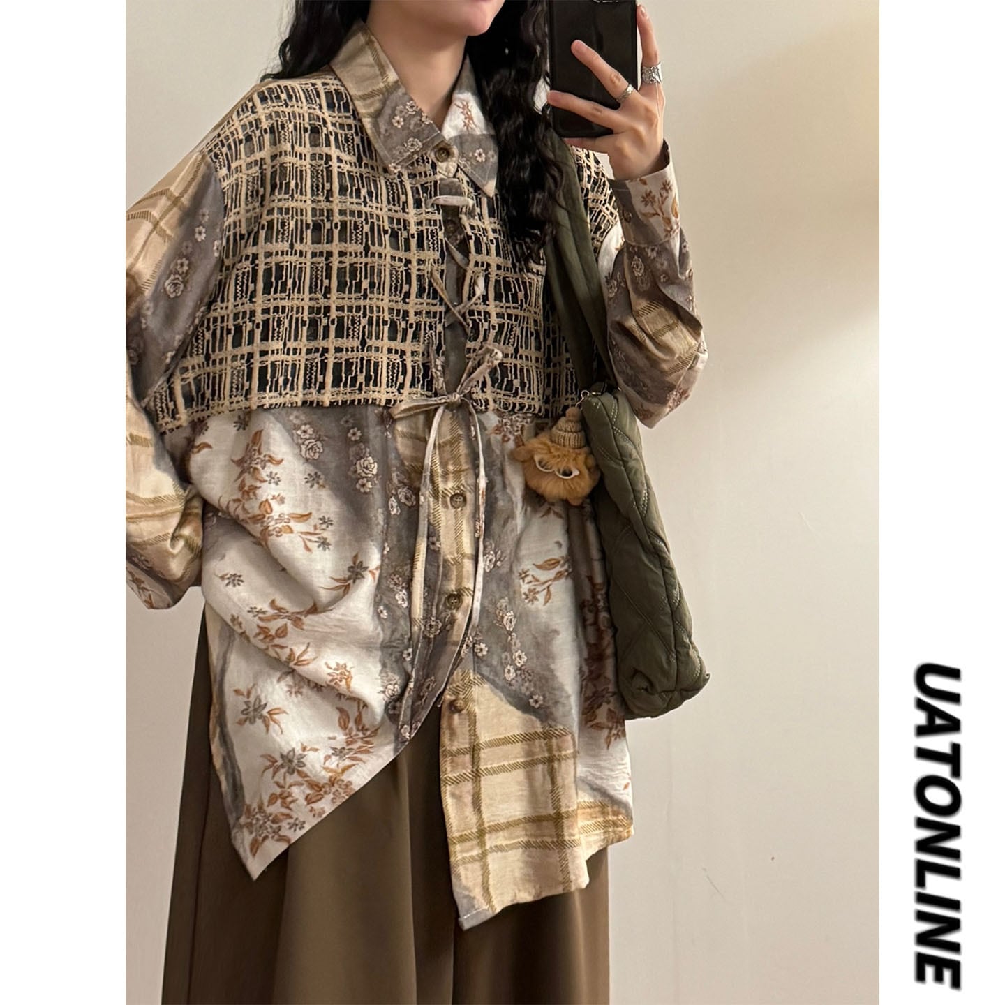 ♥一枚で二重の優しさ!【UATONLINEシリーズ】★チャイナ風トップス★ ユニセックス フェイクレイヤード シャツ プリント レトロ