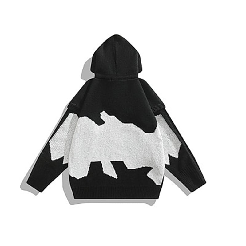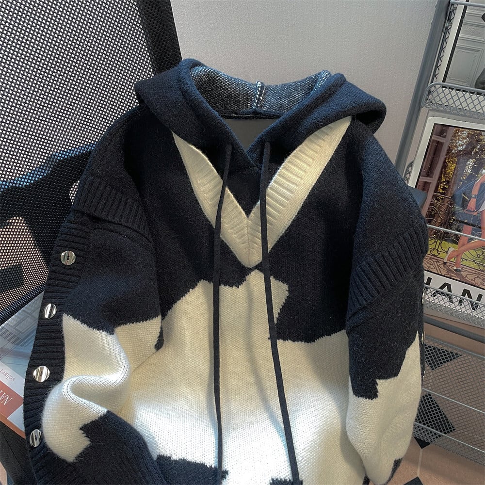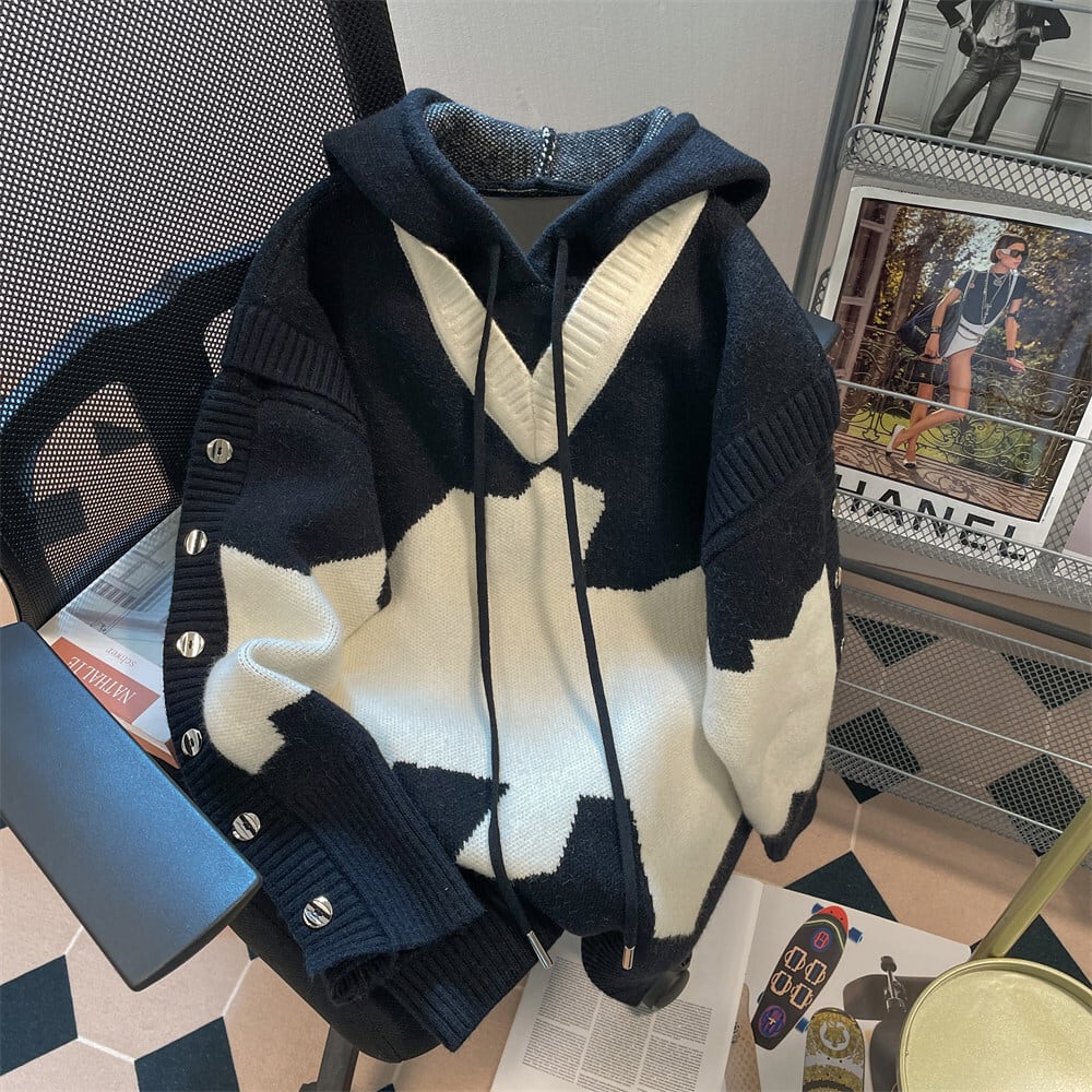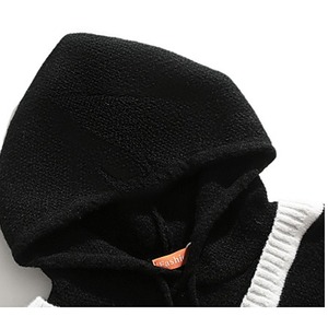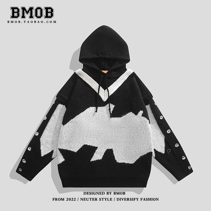 ♥拼接ぎとフードで際立つ、新たな定番!【BMOBシリーズ】★セーター★ ユニセックス ニットパーカー トップス フェイクレイヤード ブラック 黒い
