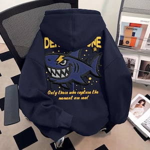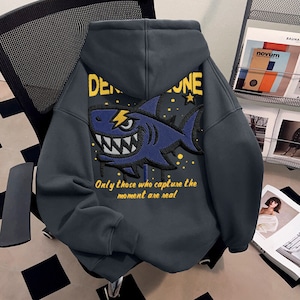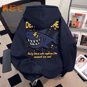♥裏起毛サメ柄パーカー!【DEシリーズ】★パーカー★ 裏起毛 ユニセックス 3color トップス カートゥーン 青 灰 黒