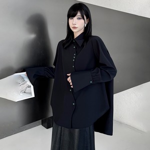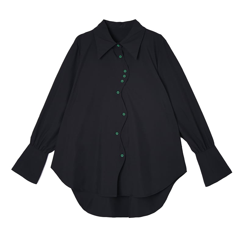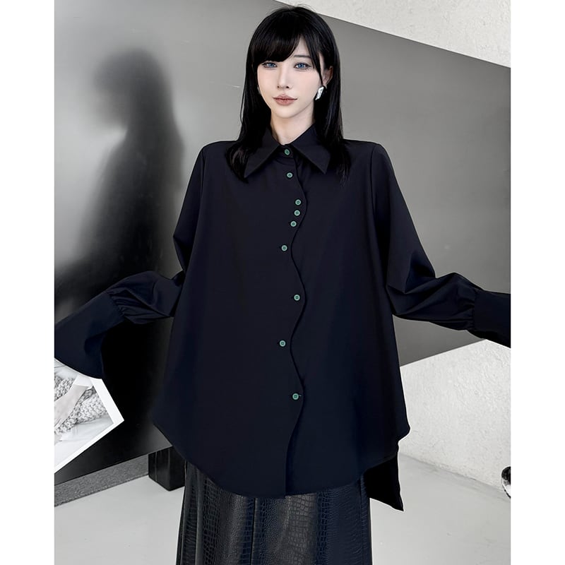 ✿ダークなキャンバス、緑の釦がアクセント!【YIDAOシリーズ】★シャツ★ 2color トップス 緑ボタン 不規則 コットン 黒 白