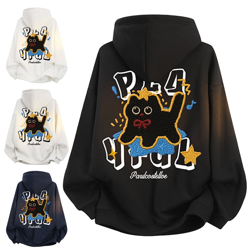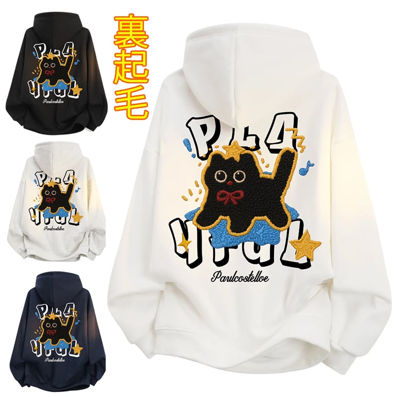 ♥裏起毛カートゥーン黒猫!【ImcTLシリーズ】★パーカー★ 裏起毛 ユニセックス 4color トップス メンズ レディース 猫柄 猫 ネコ 星