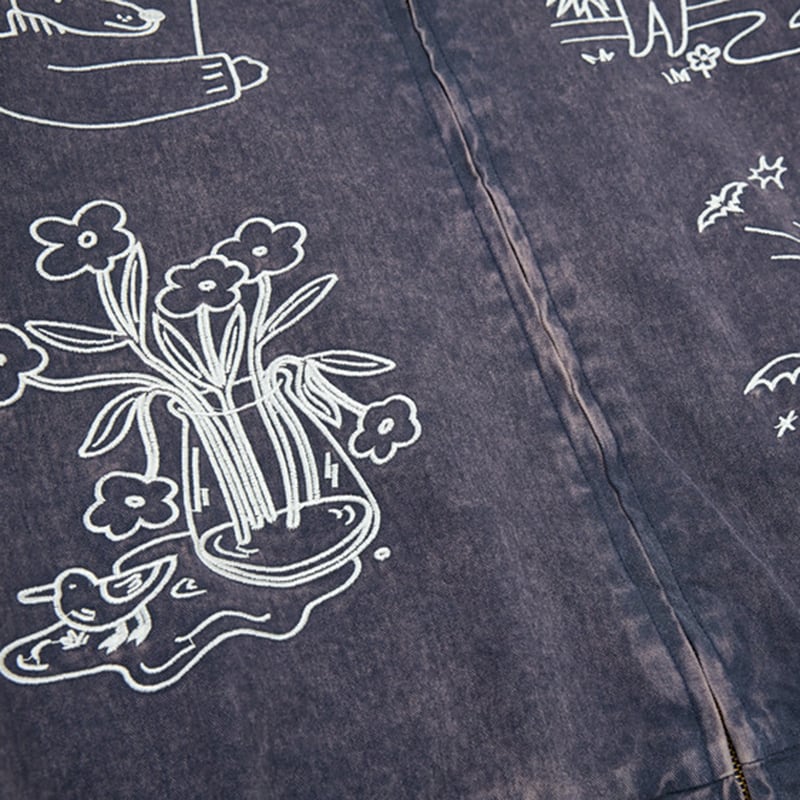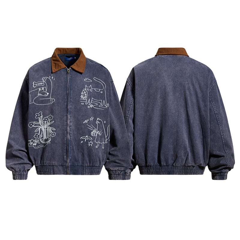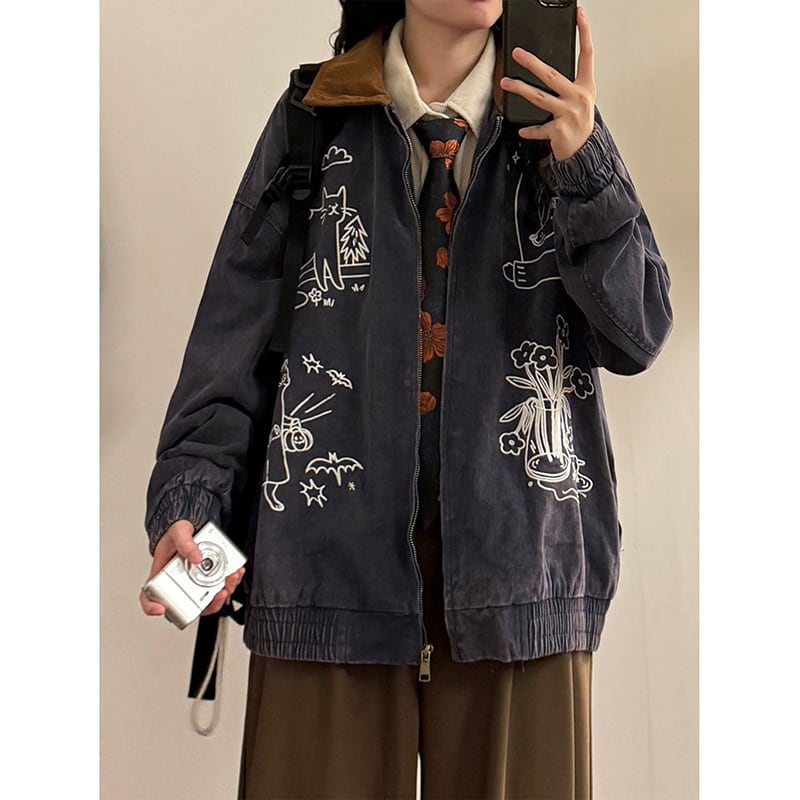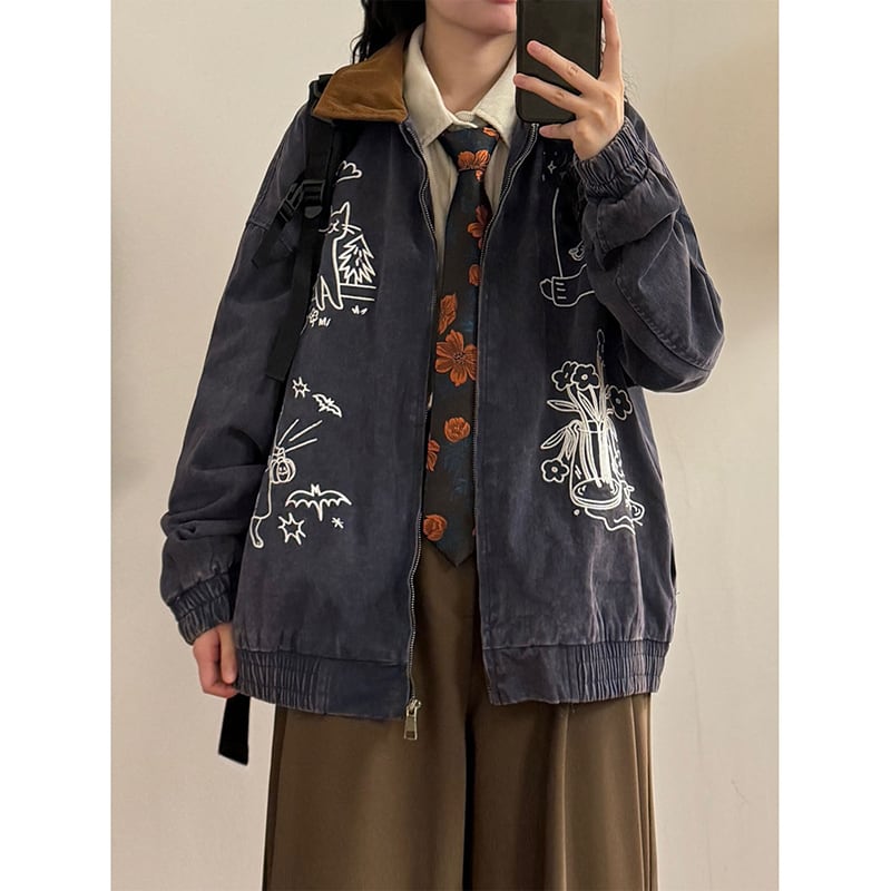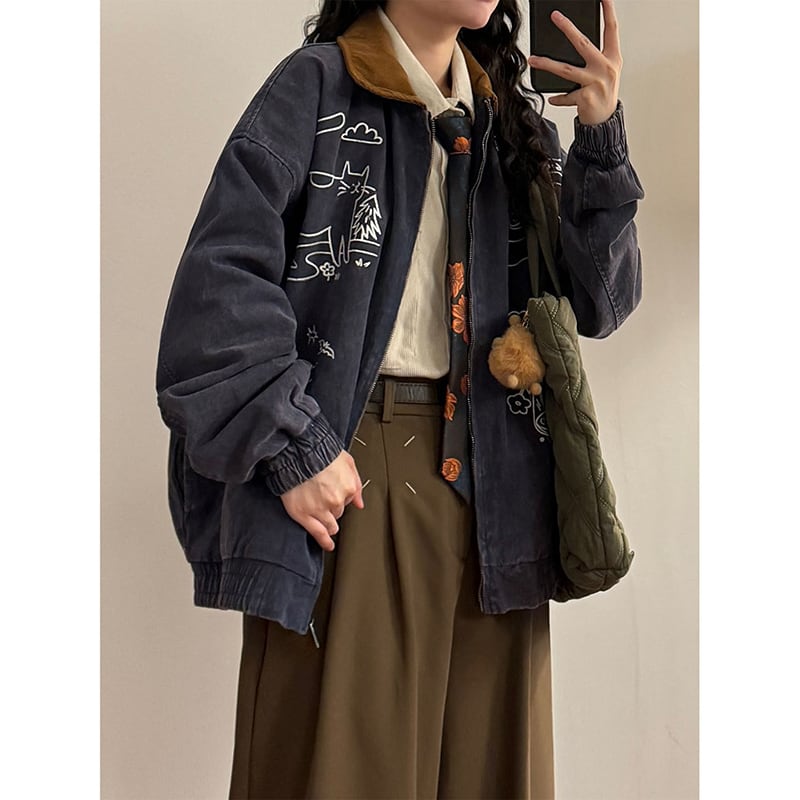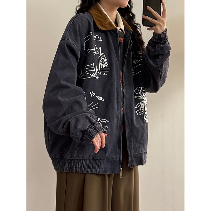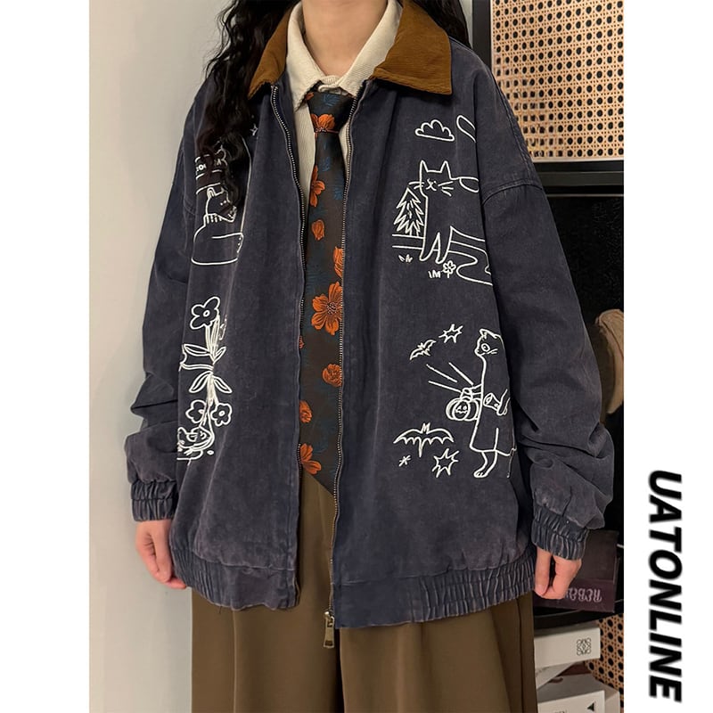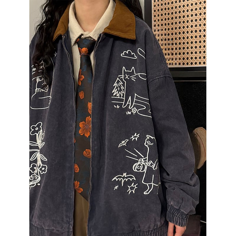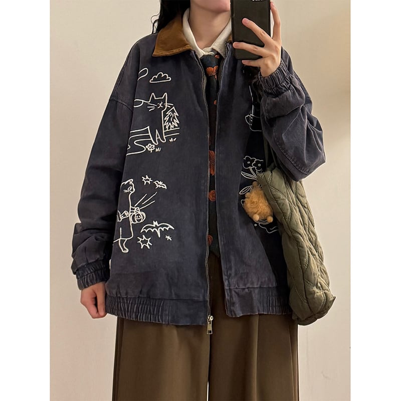 ❤猫刺繍レトロデニムジャケット!【UATONLINEシリーズ】★ジャケット★ ユニセックス アウター 猫 刺繍 レトロ デニム