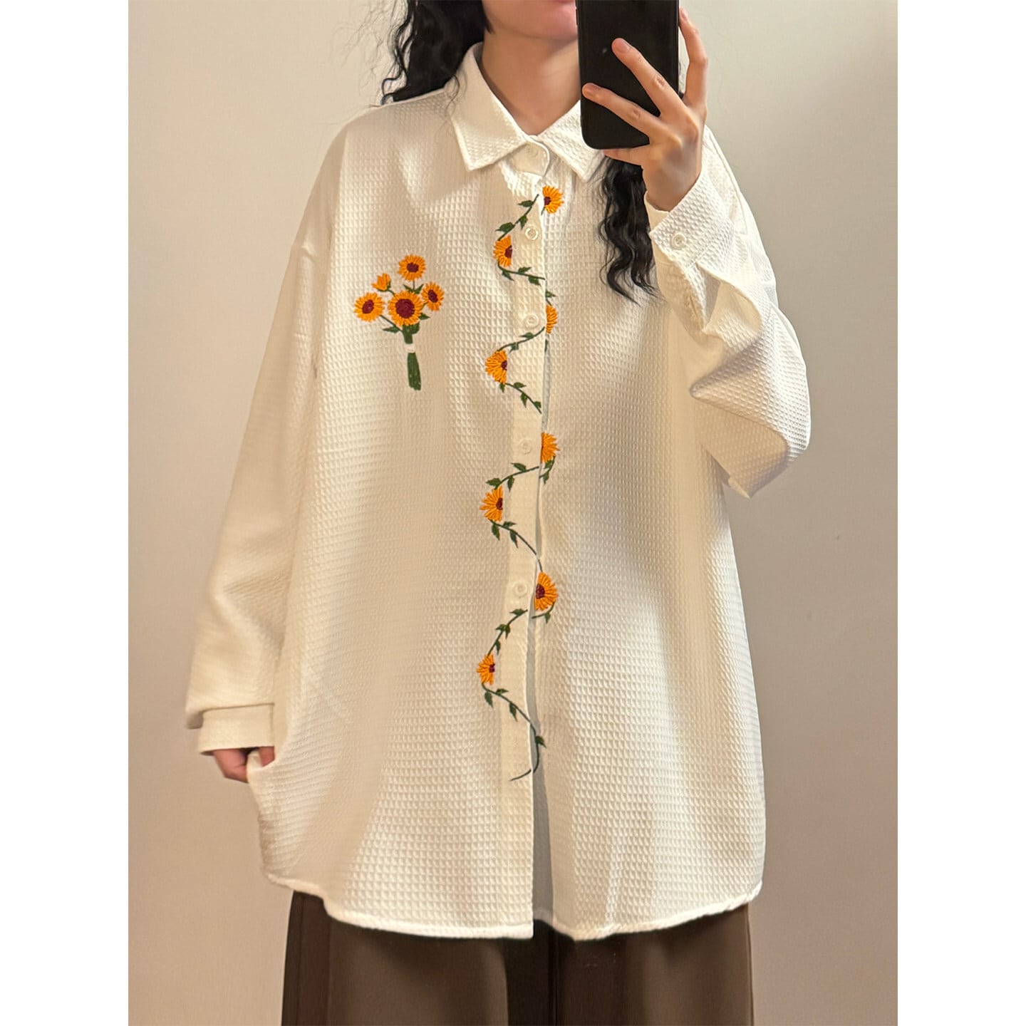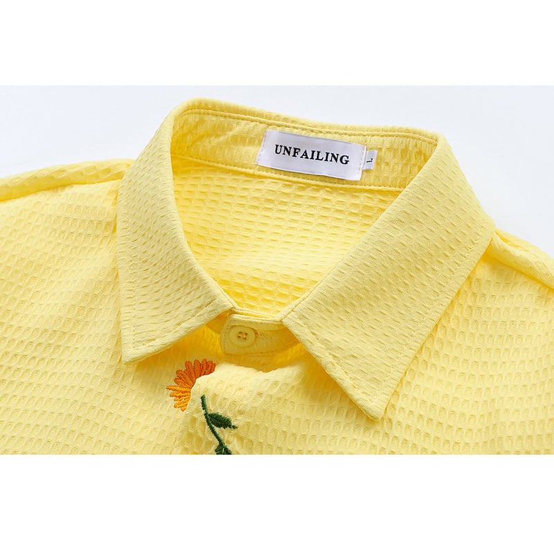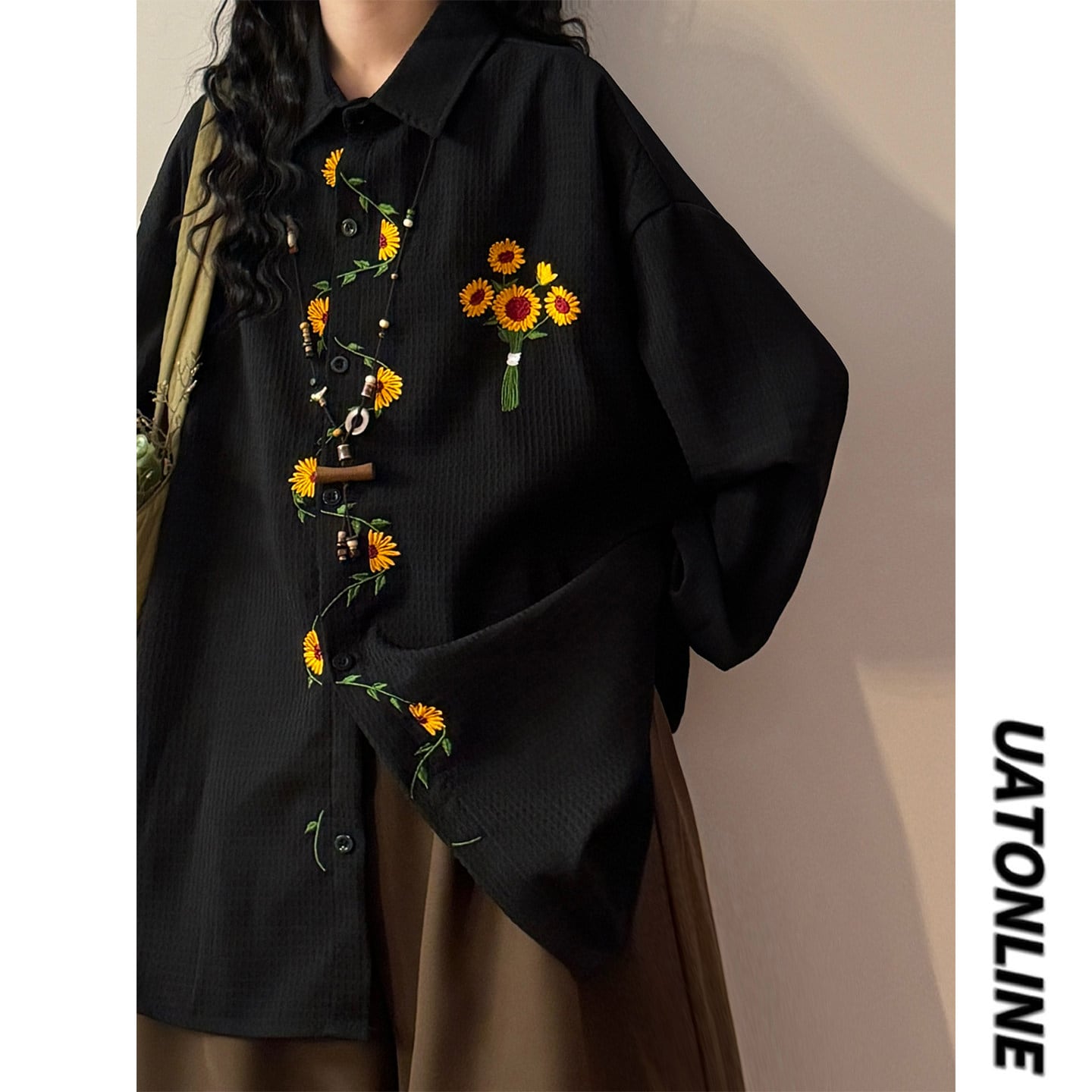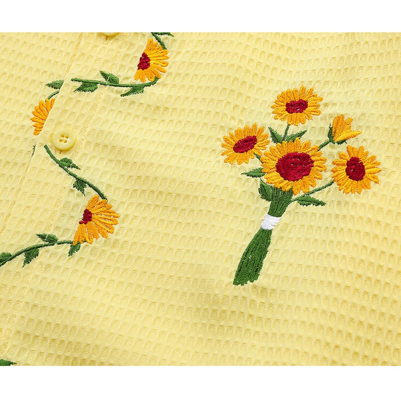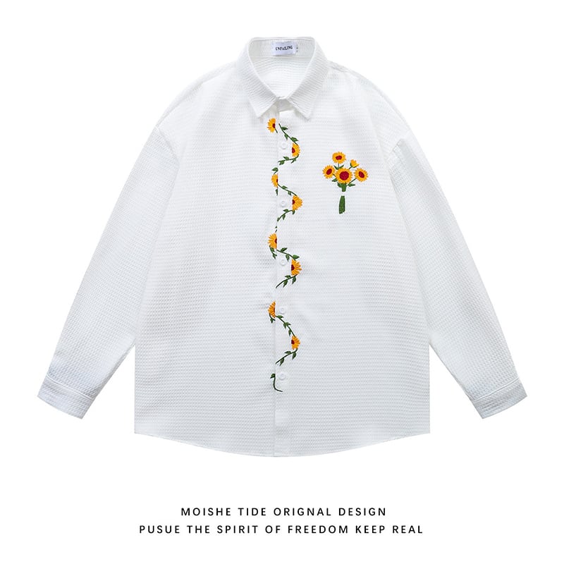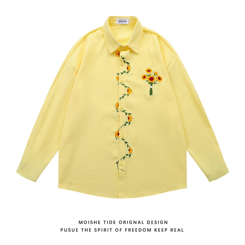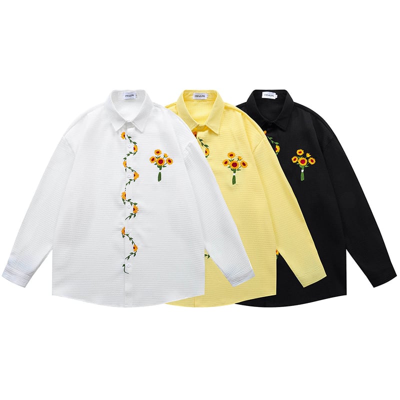 ♥向日葵刺繍シャツ!【UATONLINEシリーズ】★シャツ★ ユニセックス 3color トップス 長袖シャツ 黒 白 黄 向日葵 ひまわり