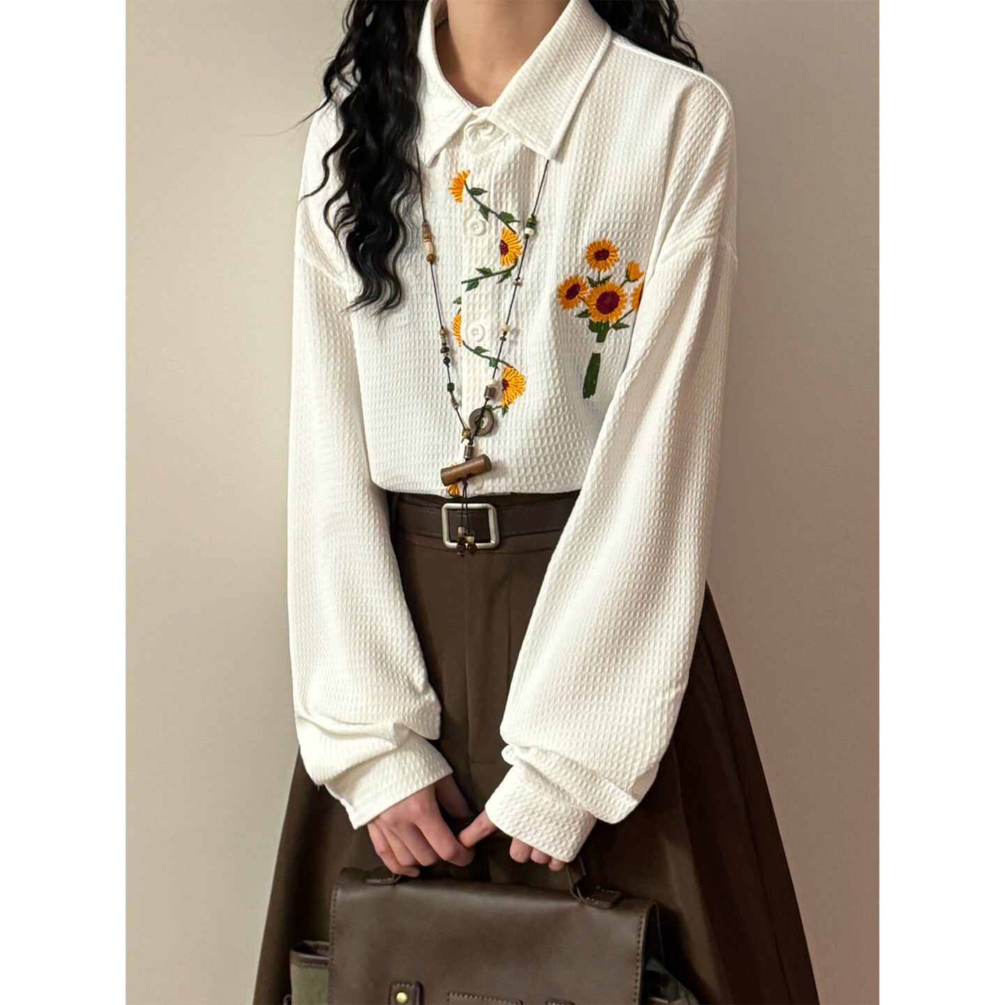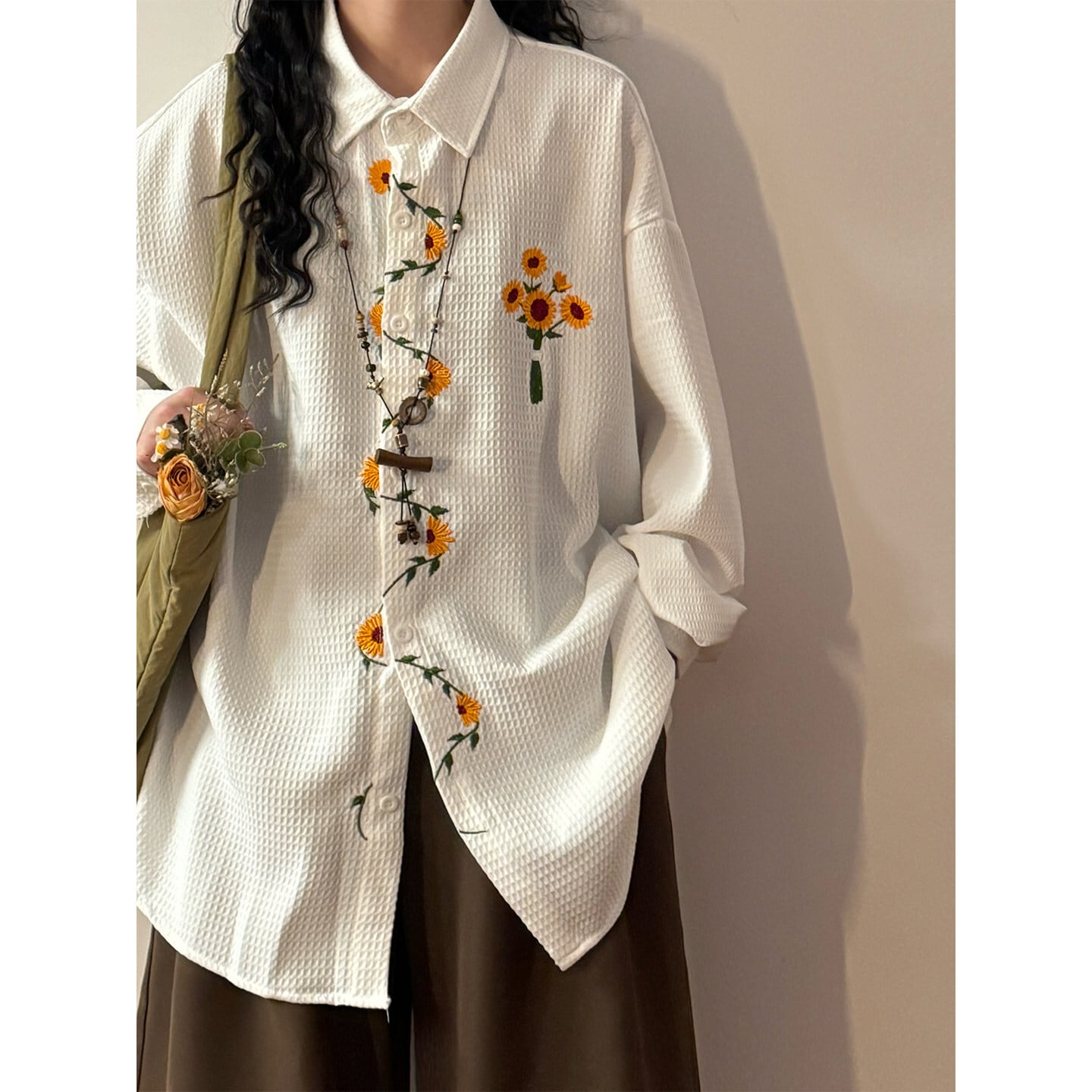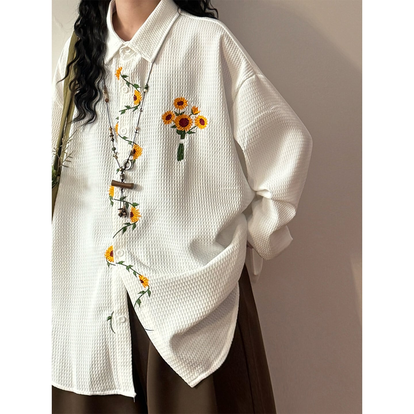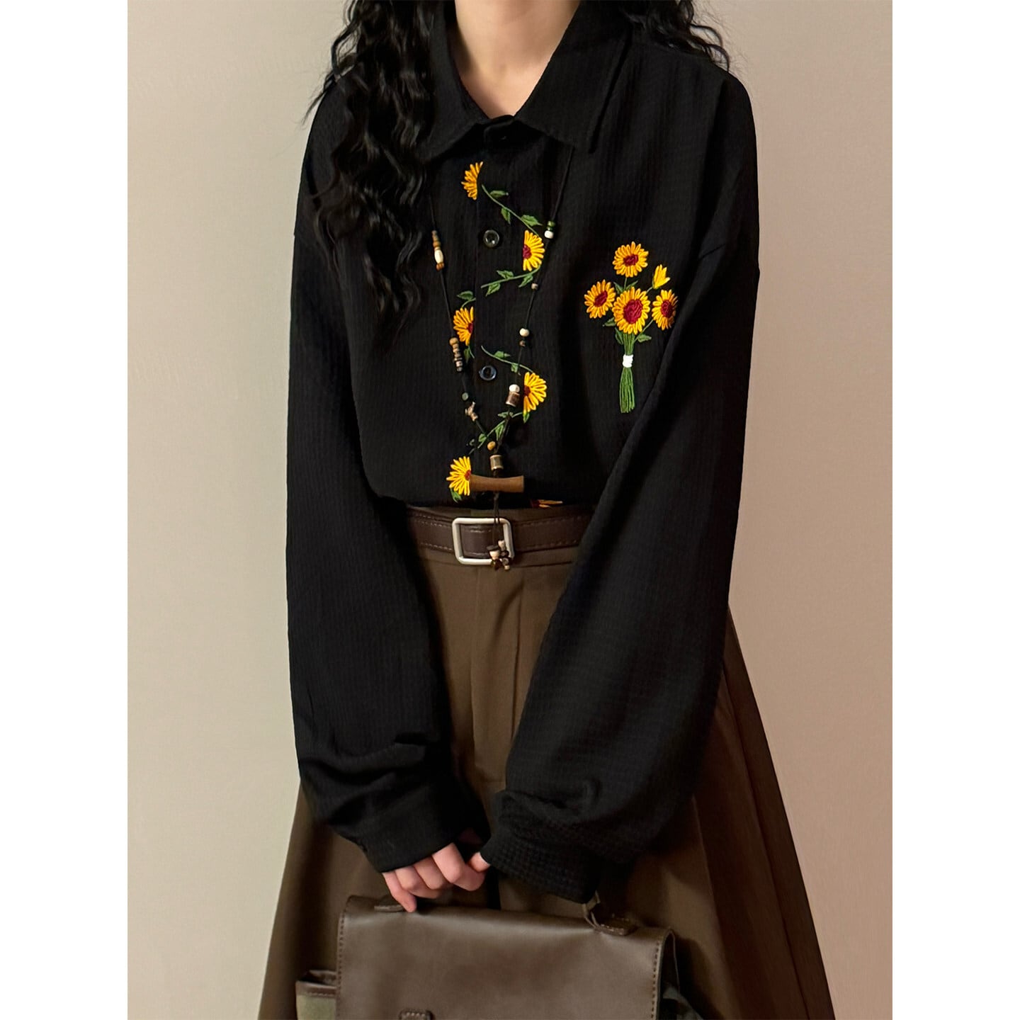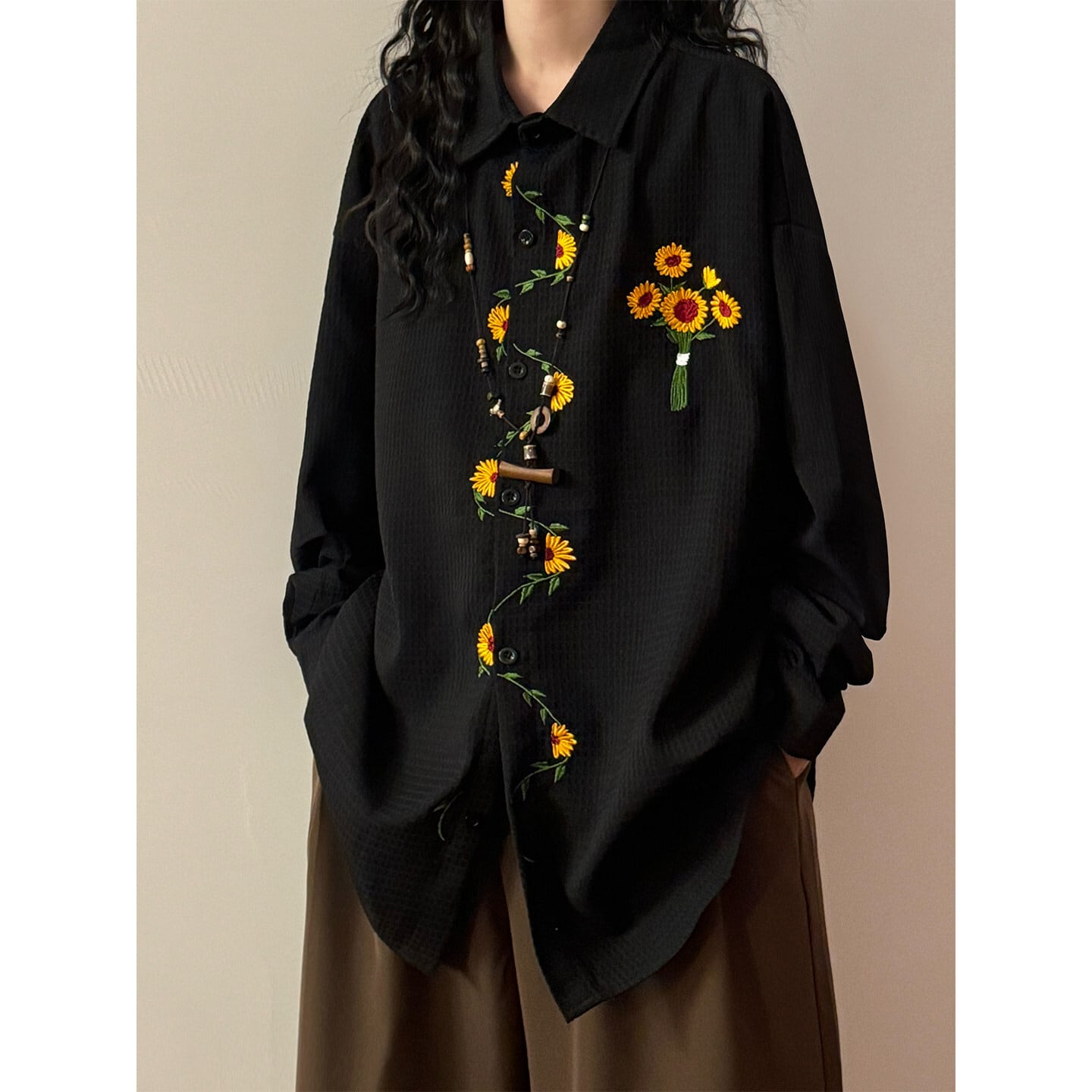 ♥向日葵刺繍シャツ!【UATONLINEシリーズ】★シャツ★ ユニセックス 3color トップス 長袖シャツ 黒 白 黄 向日葵 ひまわり