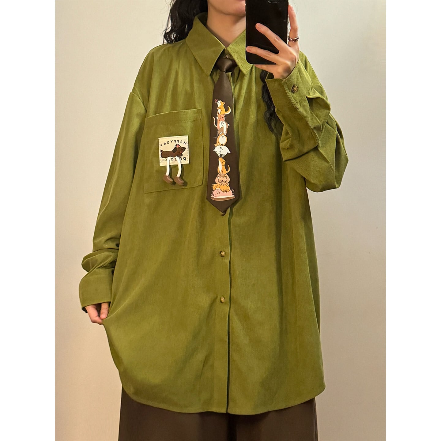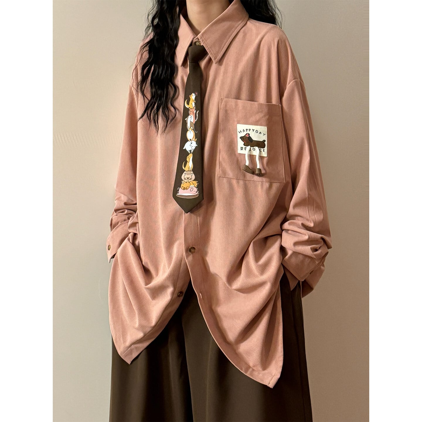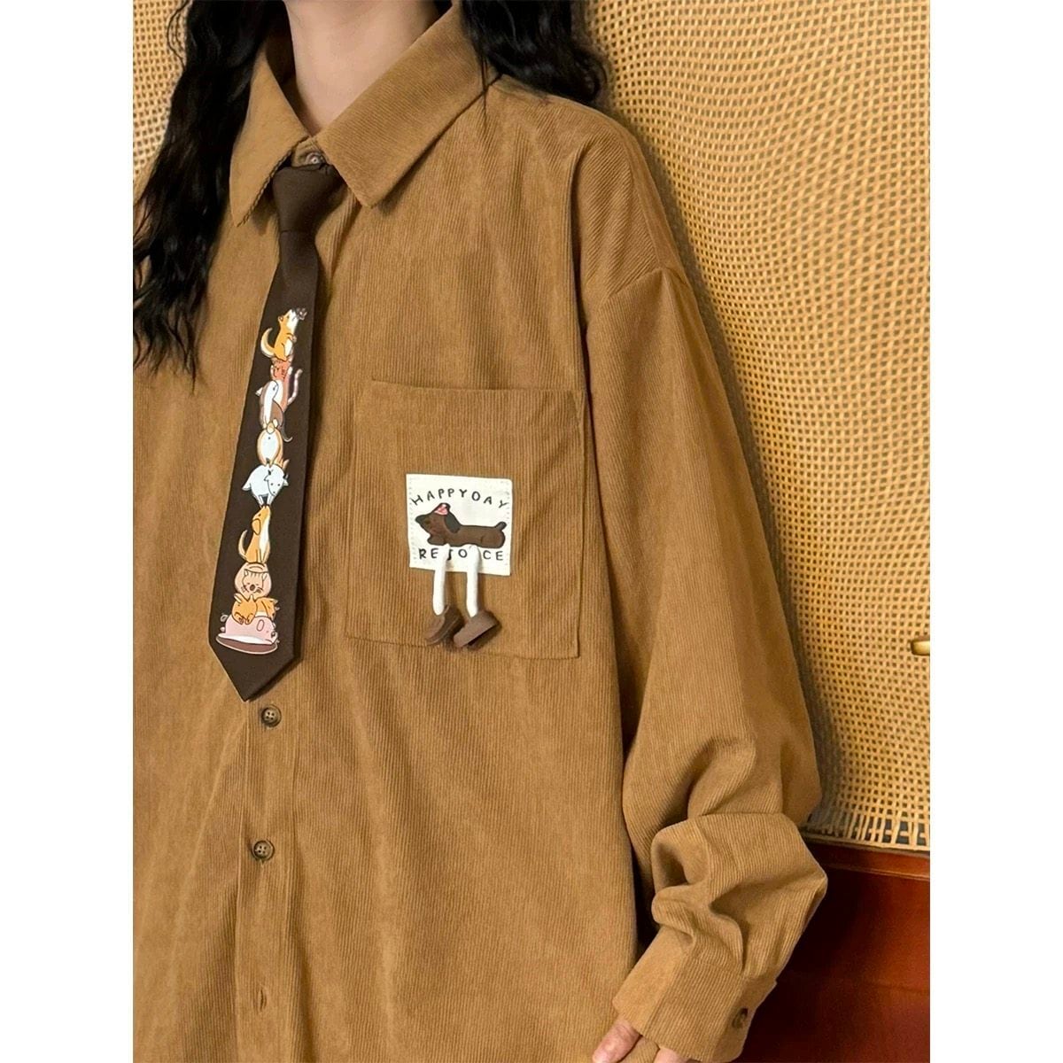 ♥4色展開、コーデュロイ動物柄シャツ!【UATONLINEシリーズ】★シャツ★ 4color 犬 猫 ネクタイ付きシャツ ユニセックス トップス 長袖シャツ コーデュロイ
