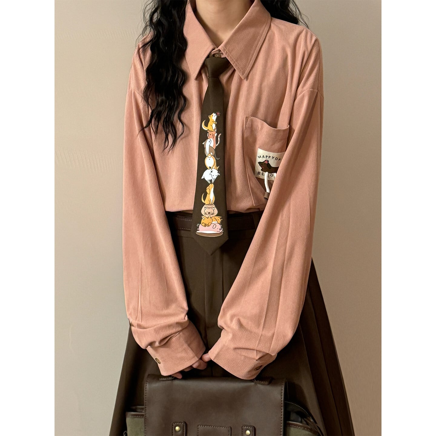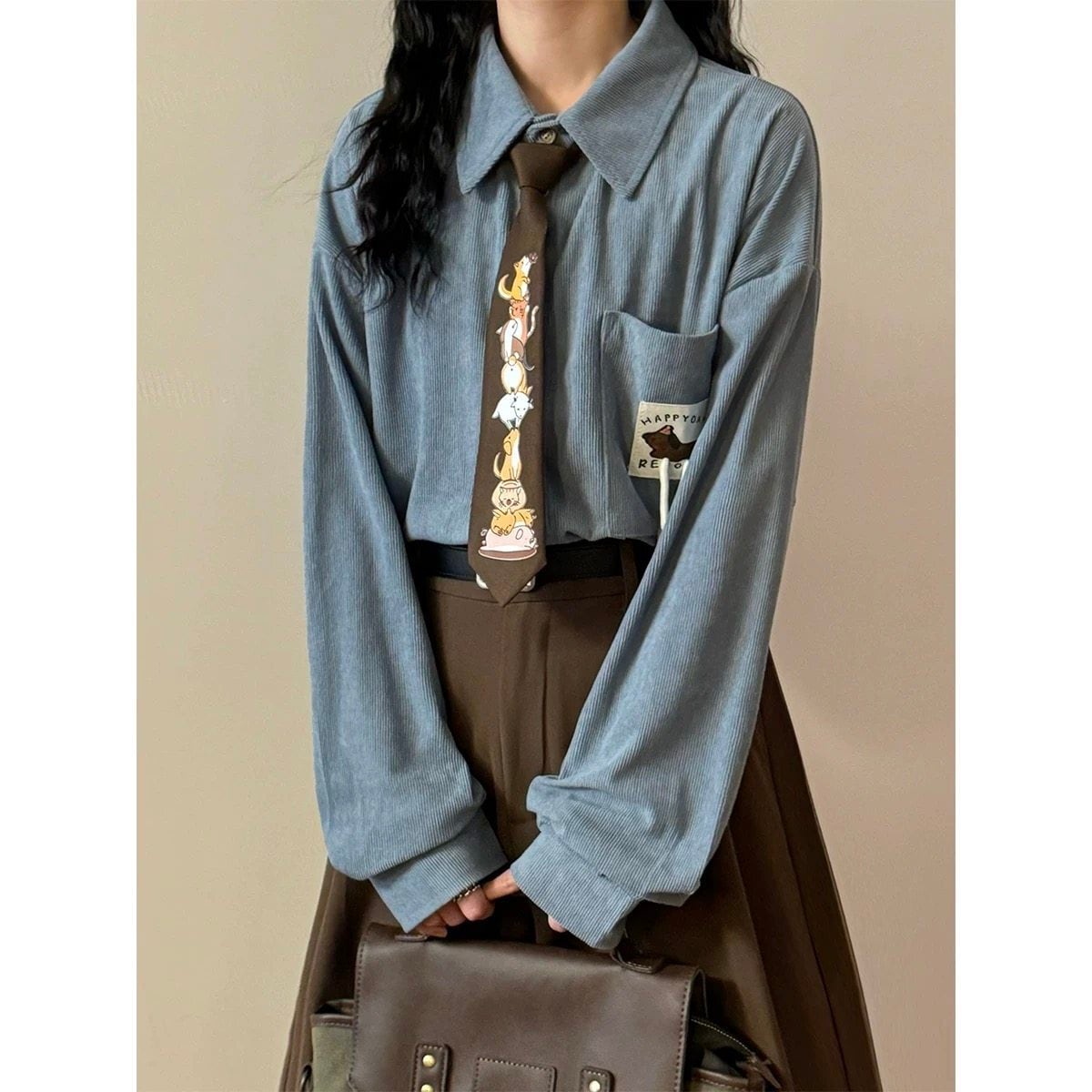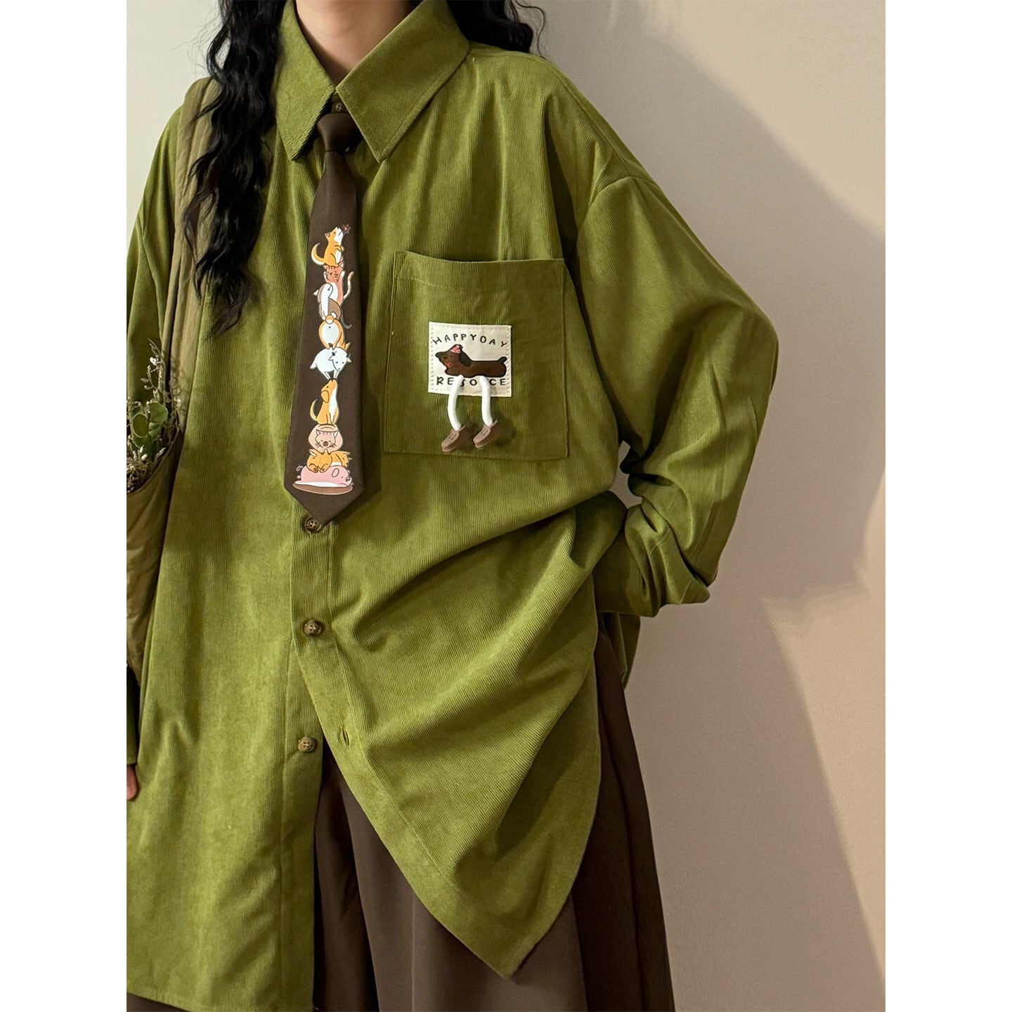 ♥4色展開、コーデュロイ動物柄シャツ!【UATONLINEシリーズ】★シャツ★ 4color 犬 猫 ネクタイ付きシャツ ユニセックス トップス 長袖シャツ コーデュロイ