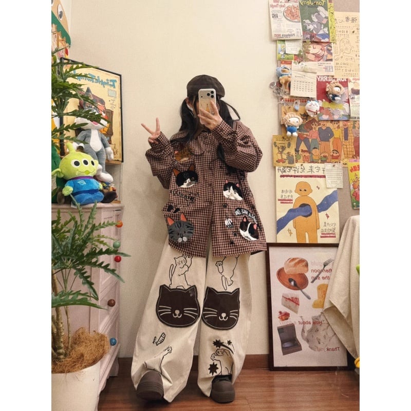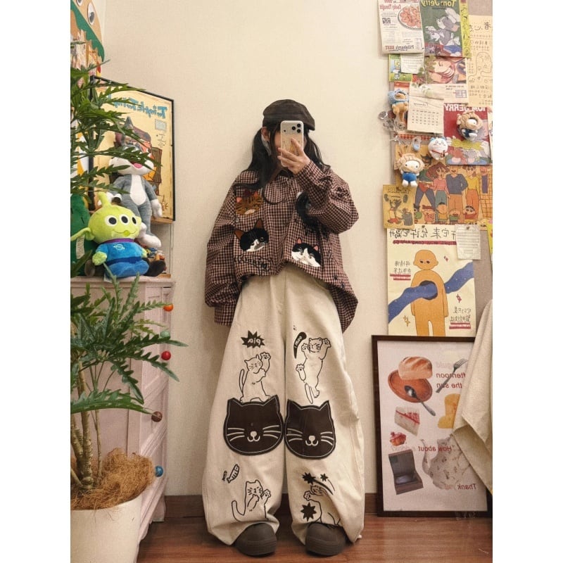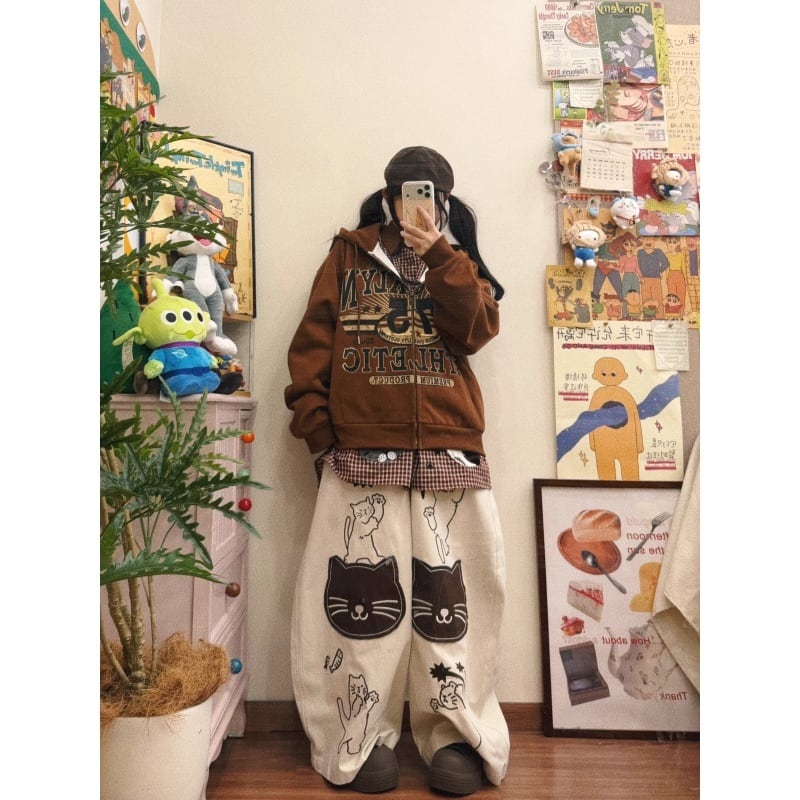 ✿猫の顔がいっぱいで可愛いすぎる!【BIBULUシリーズ】★デニムパンツ★ 刺繍入り 猫柄 動物柄 ねこ ズボン 男女兼用 ベージュ メンズ レディース ネコ