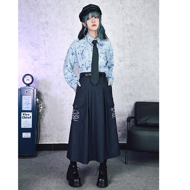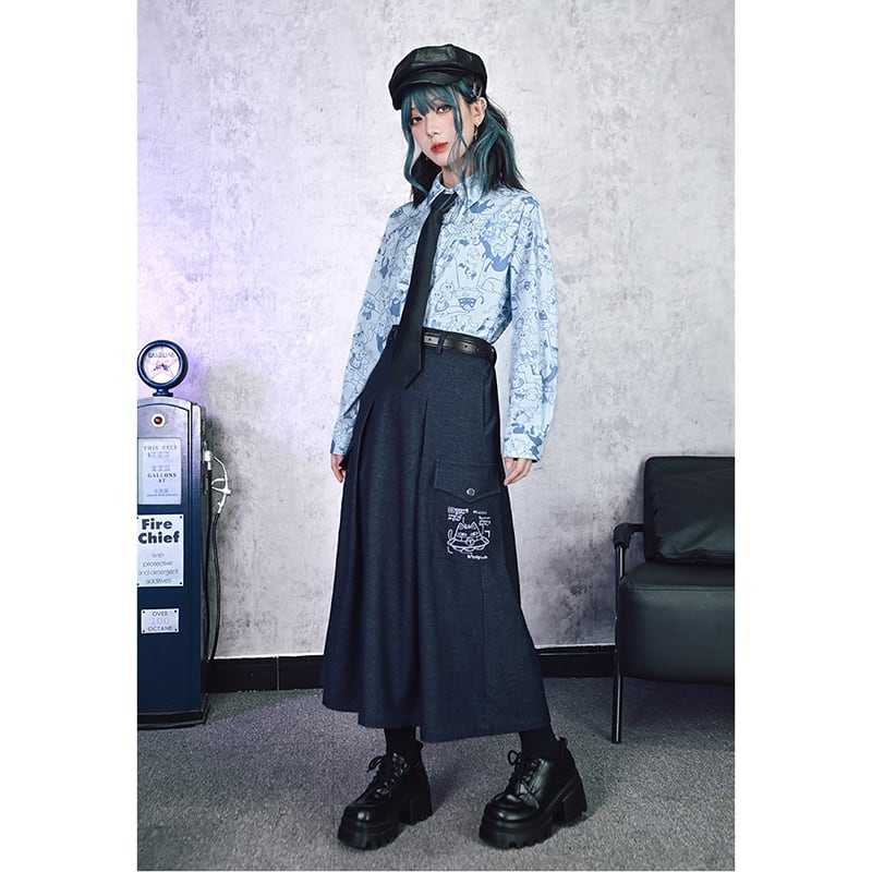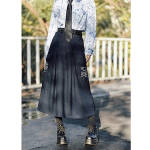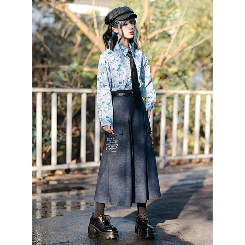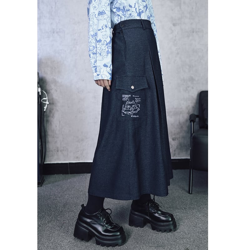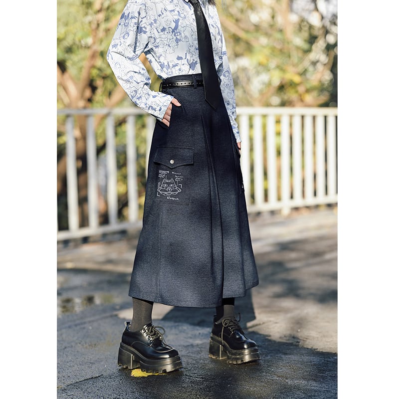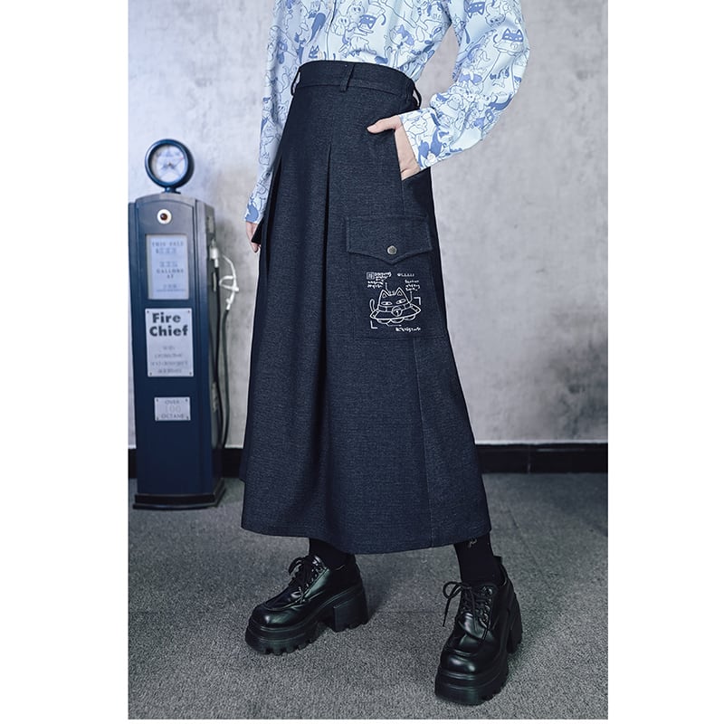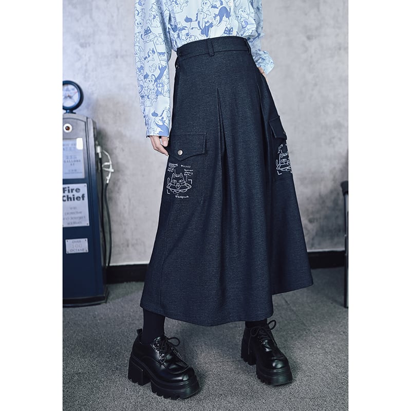 ♬オリジナルの猫柄が遊ぶ、デニムブルーのシルエット!【古怪舍---星際喵盜シリーズ】★チャイナ風スカート★ ボトムス 中華服