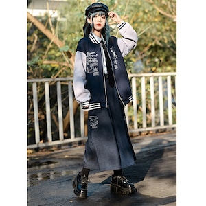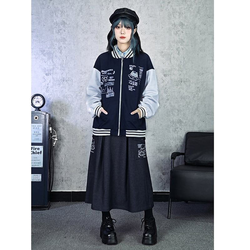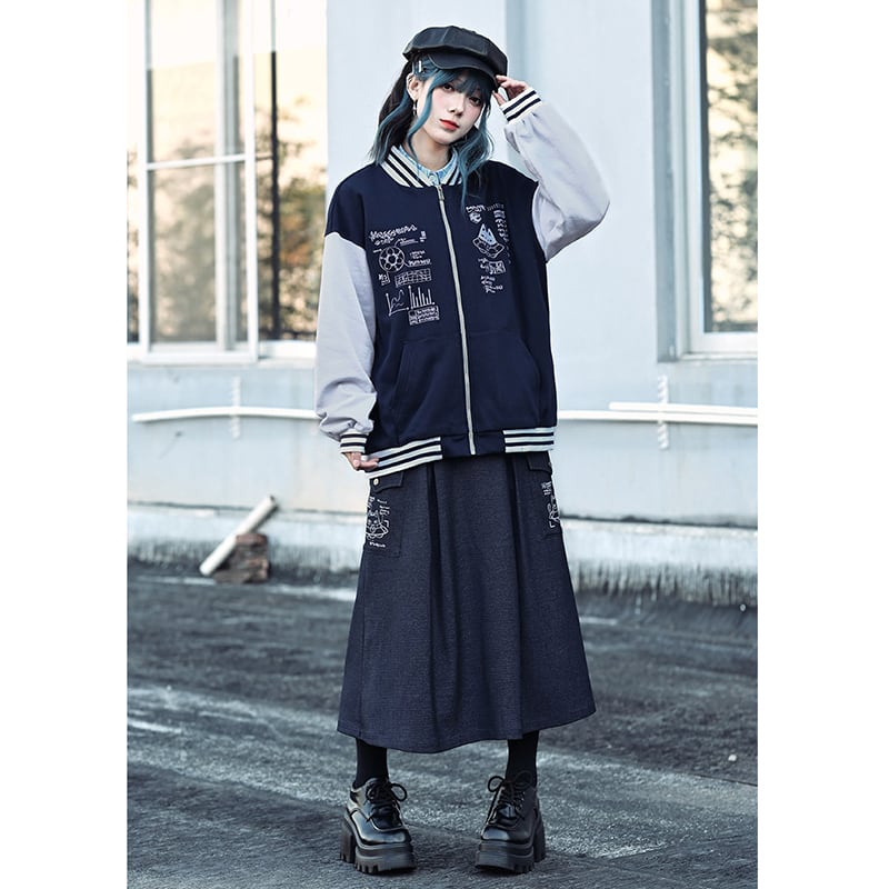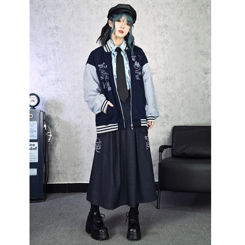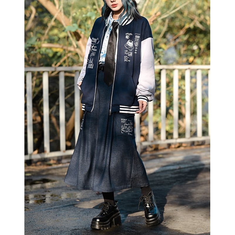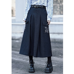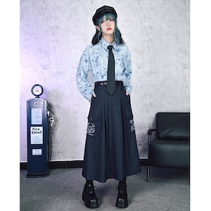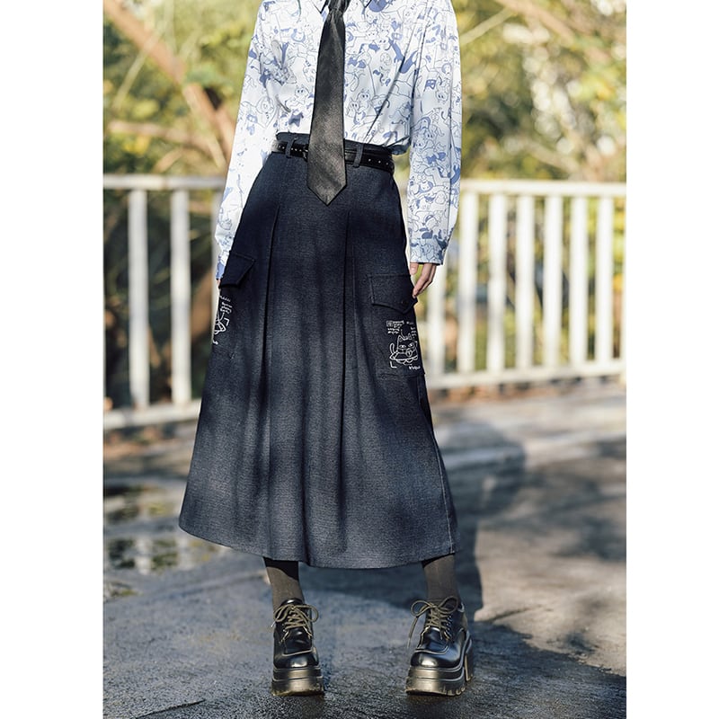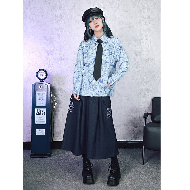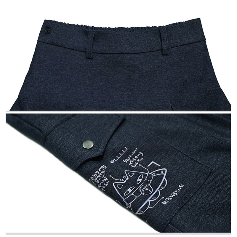 ♬オリジナルの猫柄が遊ぶ、デニムブルーのシルエット!【古怪舍---星際喵盜シリーズ】★チャイナ風スカート★ ボトムス 中華服