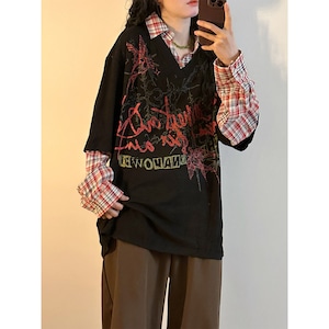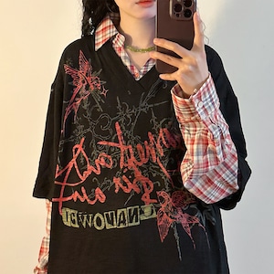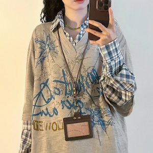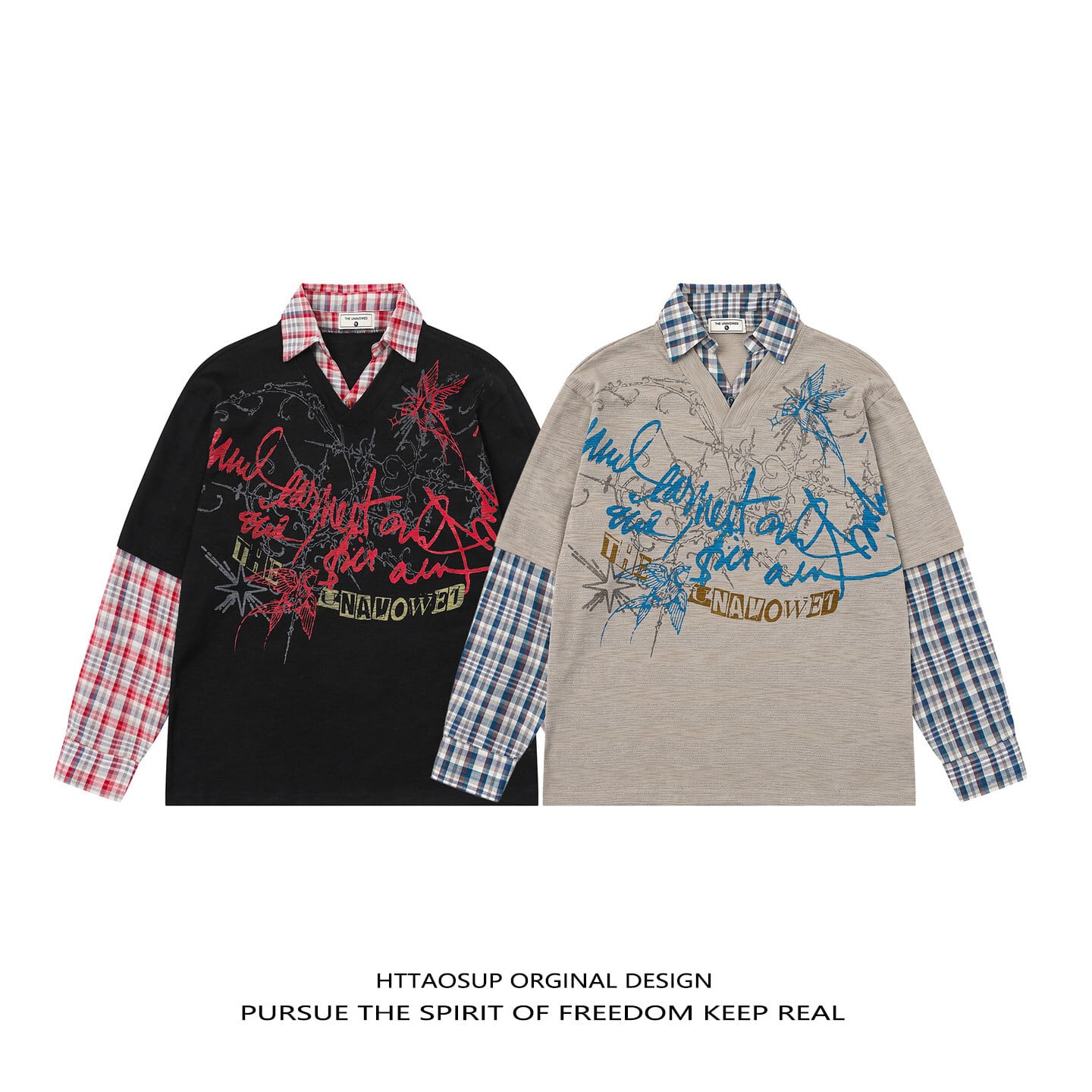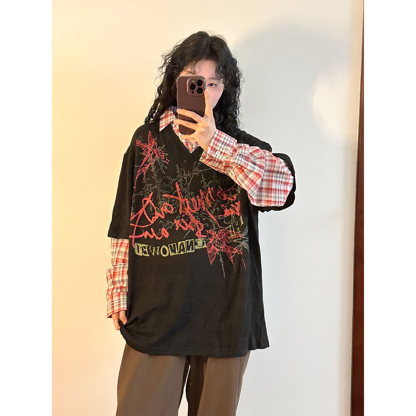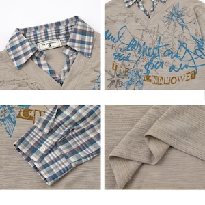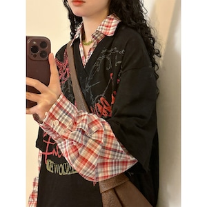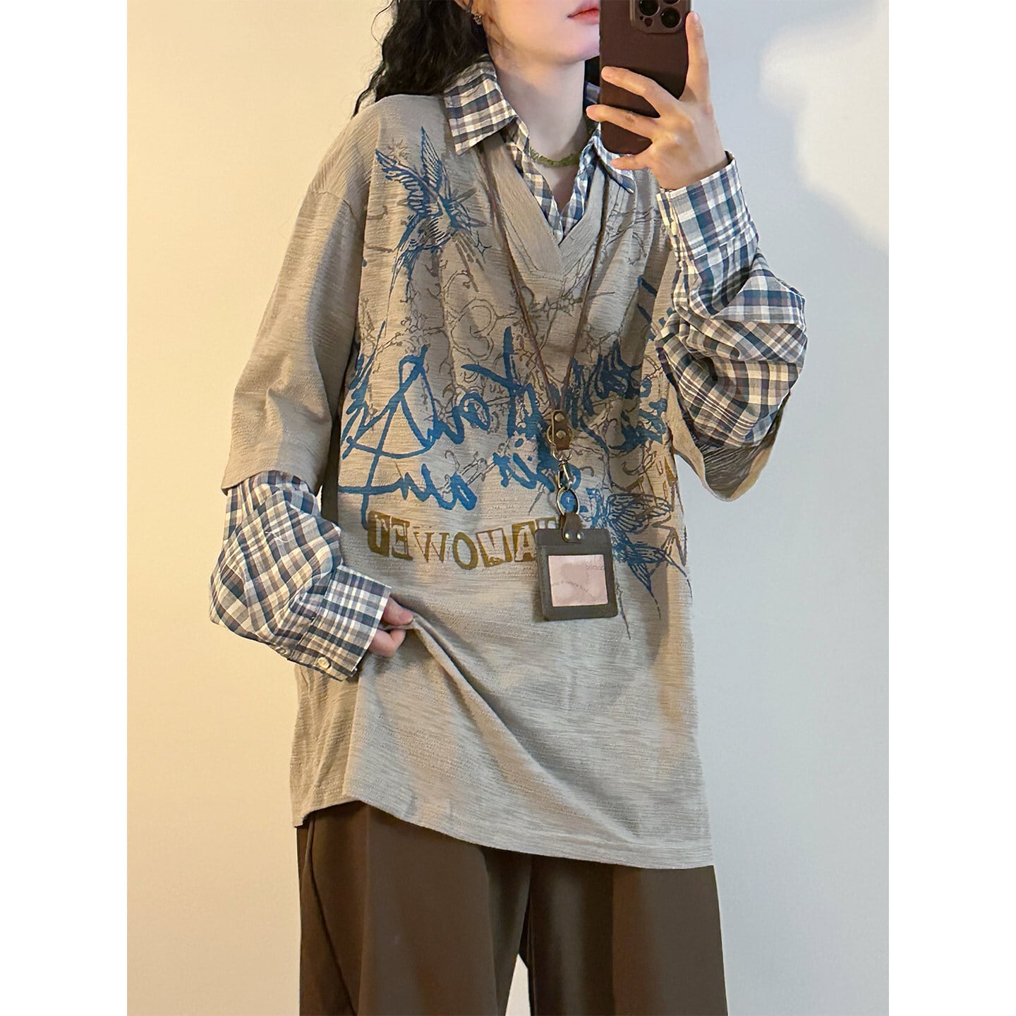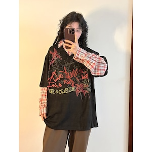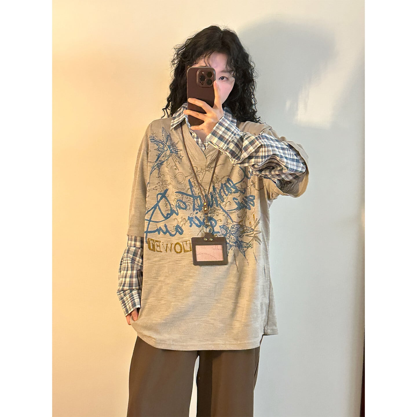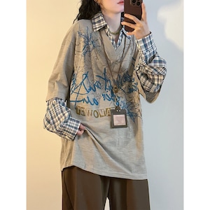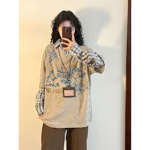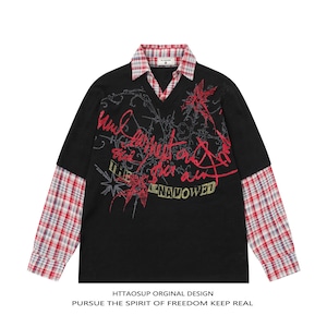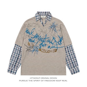 ♥チェック拼接のニュアンスポロシャツ!【UATONLINEシリーズ】★POLOシャツ★ 2color ユニセック トップス フェイクレイヤード Tシャツ 落書き チェック柄