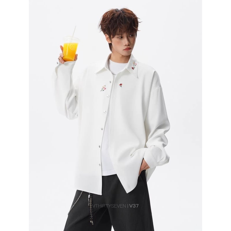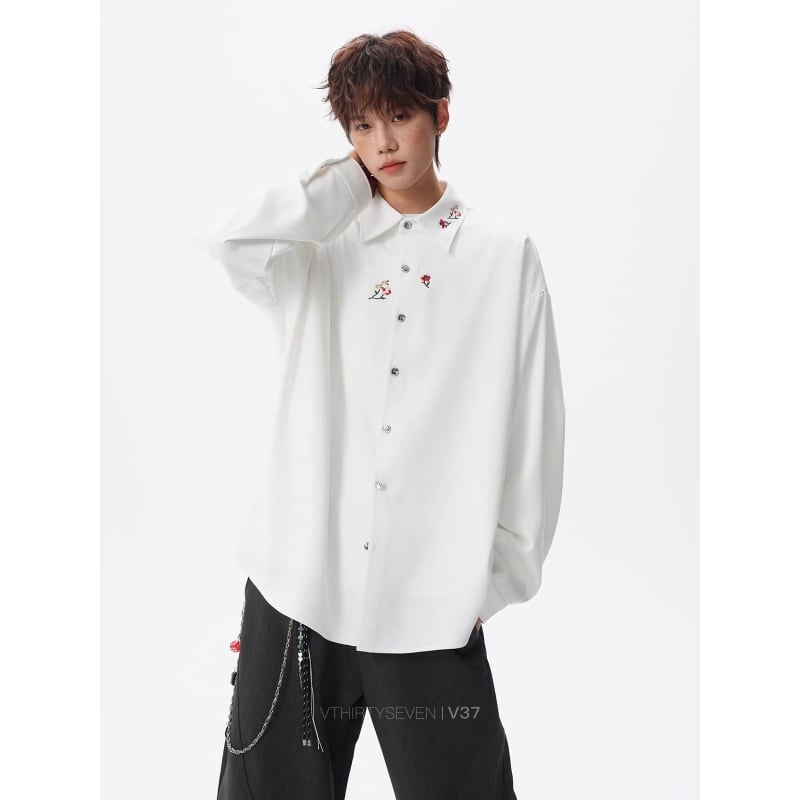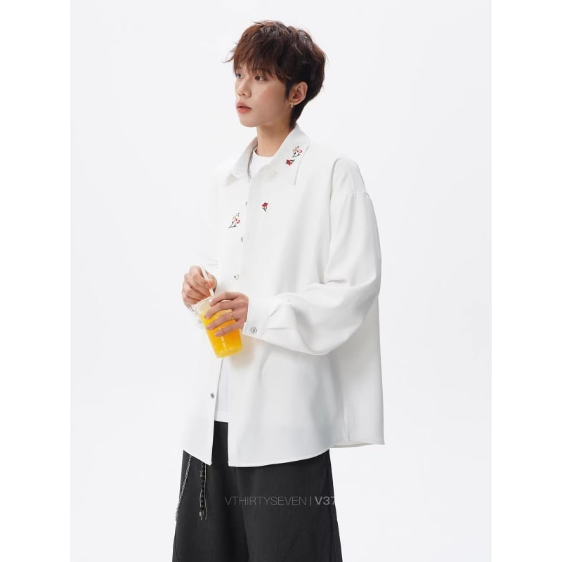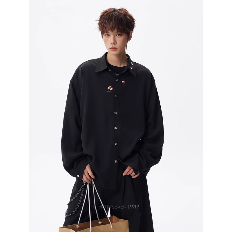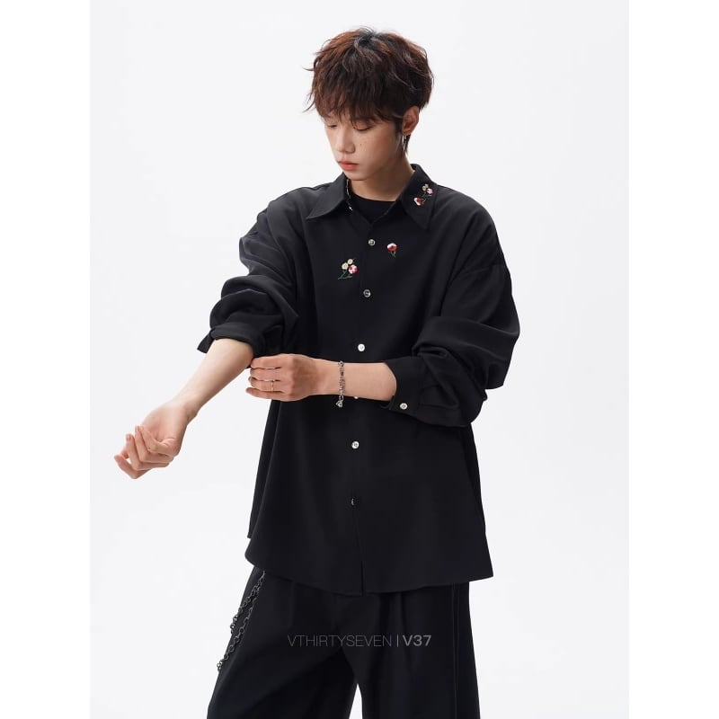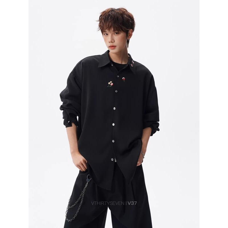 ♥刺繍デザイン、新中式スタイルシャツ!【V37シリーズ】★シャツ★ 2color 黒と白 トップス 刺繍 男女兼用 メンズ シンプル 無地