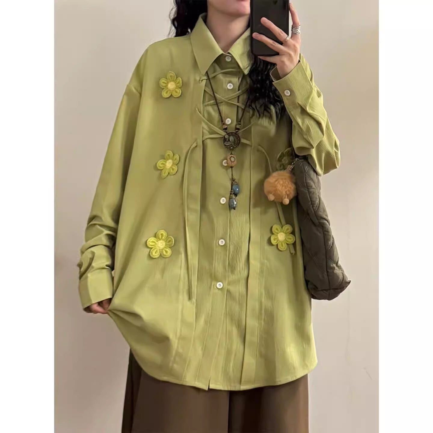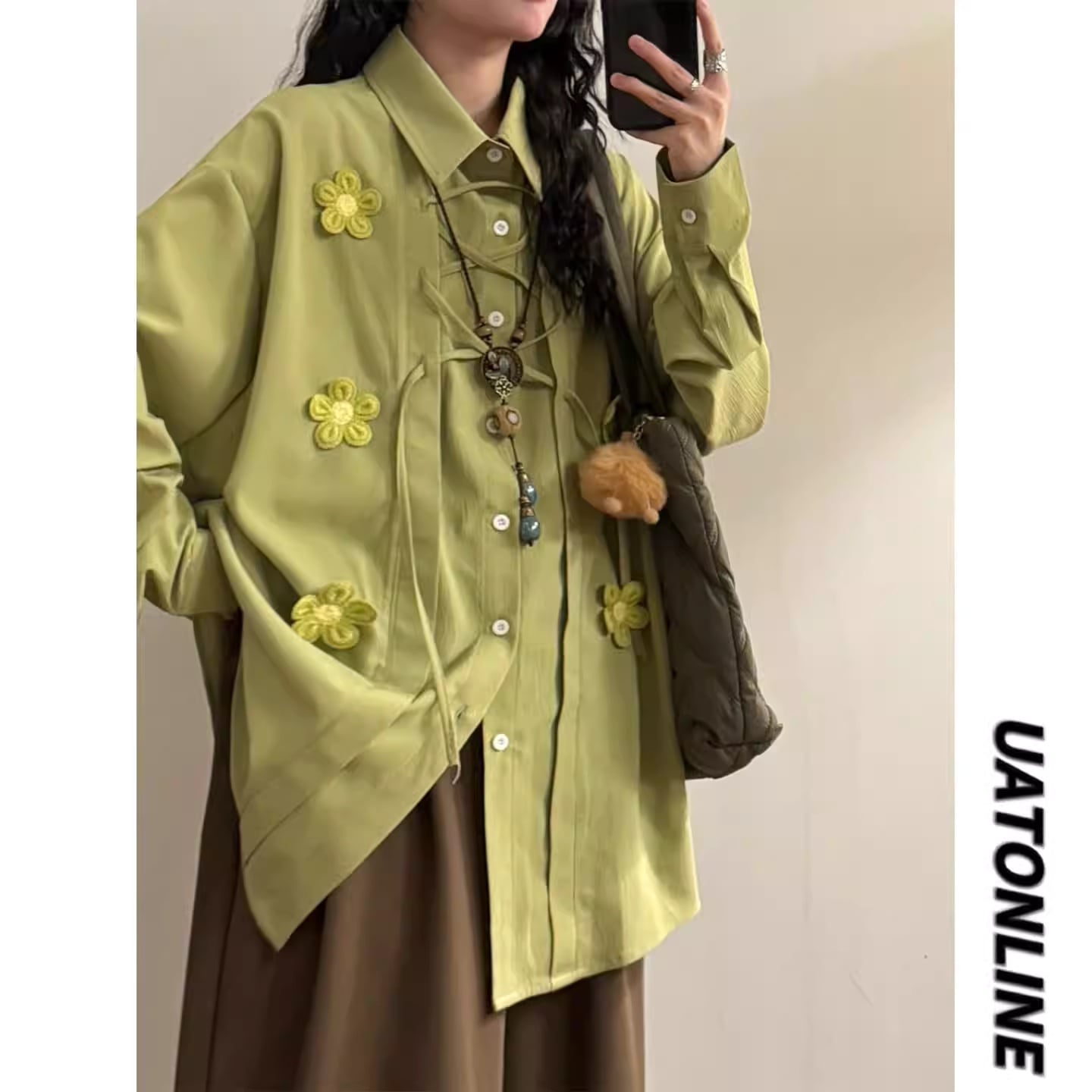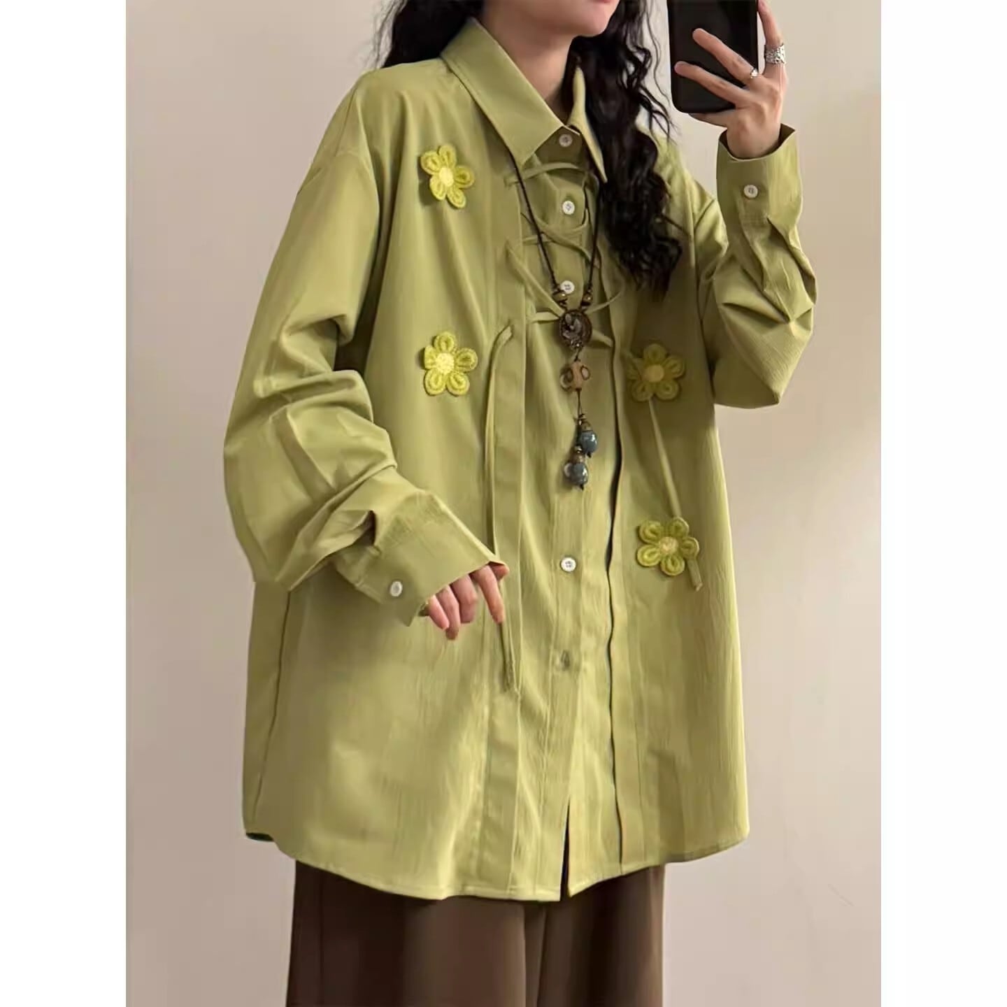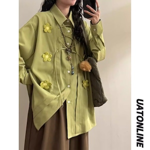❀春新作、レトロな立体花シャツ!【UATONLINEシリーズ】★シャツ★ トップス 男女兼用 花柄 カジュアル 長袖シャツ ガーリー 緑 ブルー アウトドア