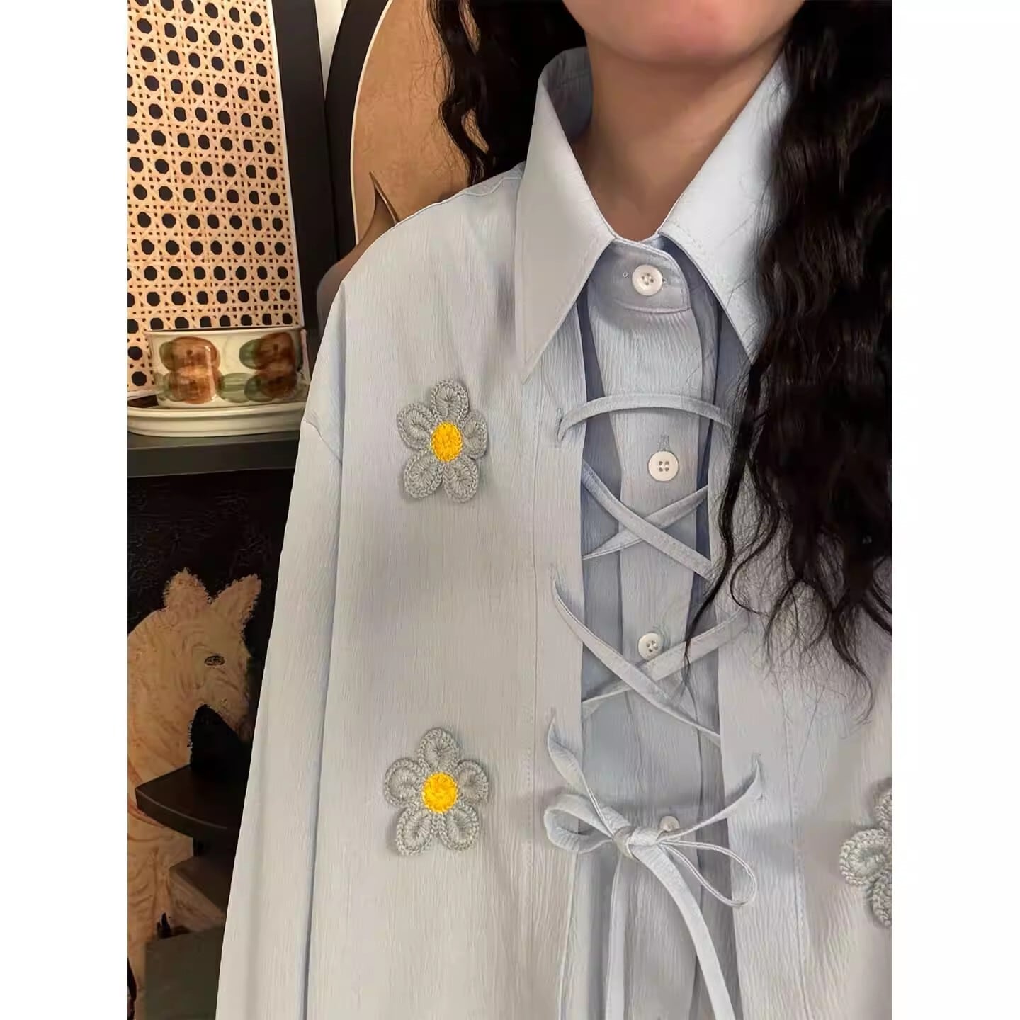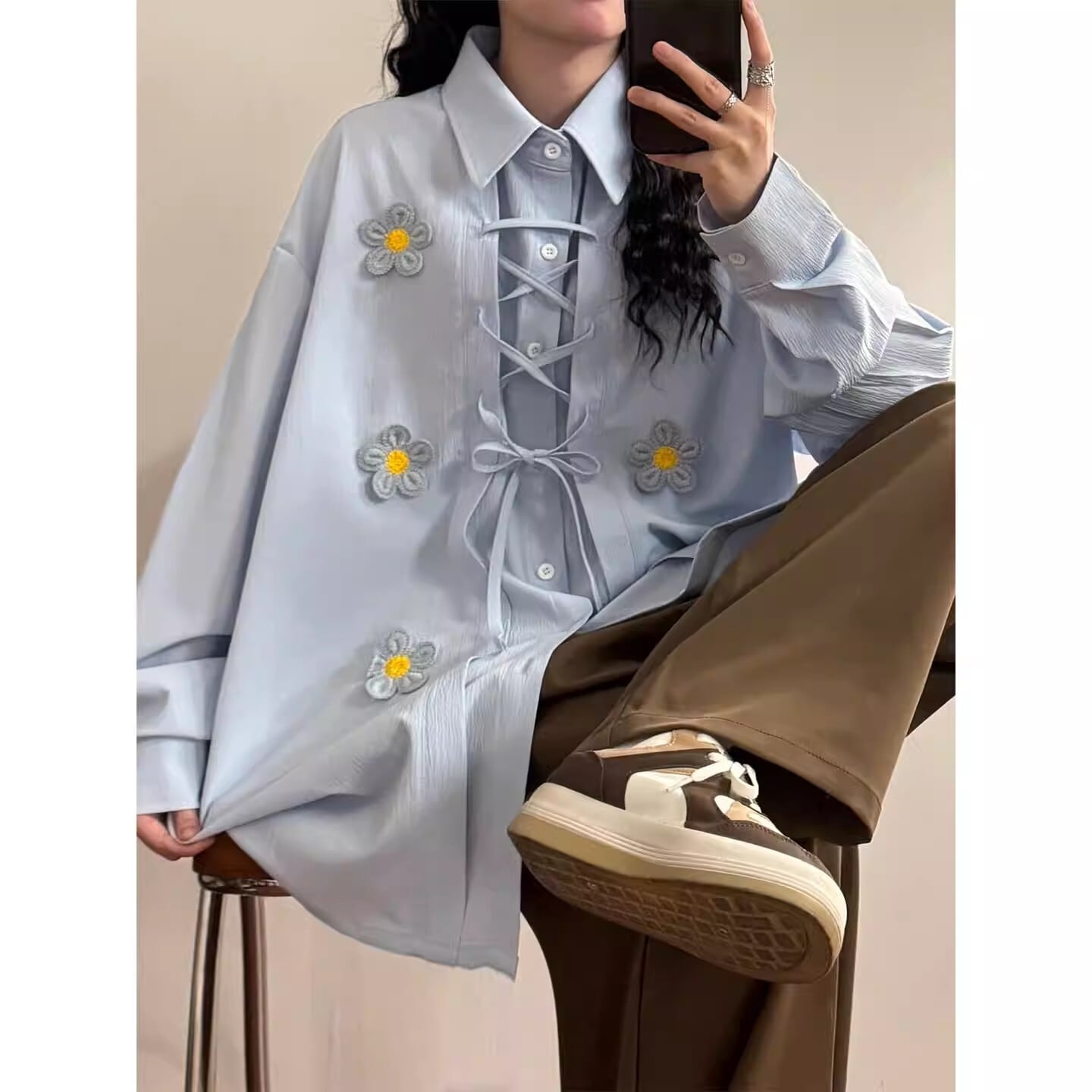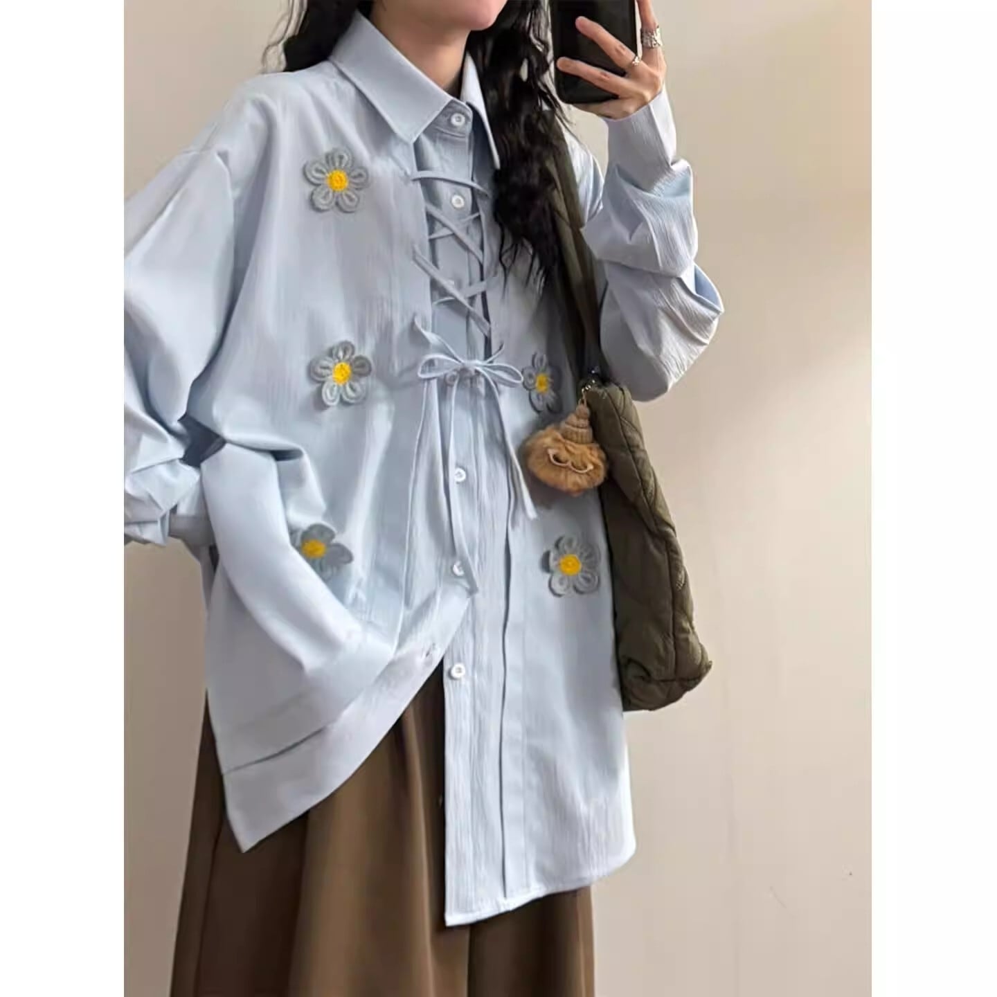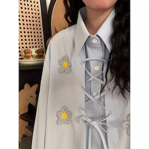 ❀春新作、レトロな立体花シャツ!【UATONLINEシリーズ】★シャツ★ トップス 男女兼用 花柄 カジュアル 長袖シャツ ガーリー 緑 ブルー アウトドア