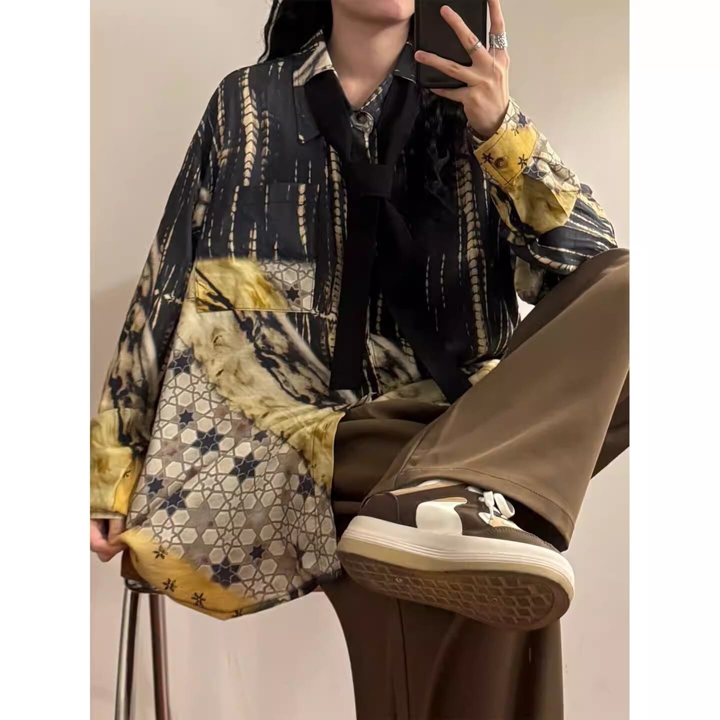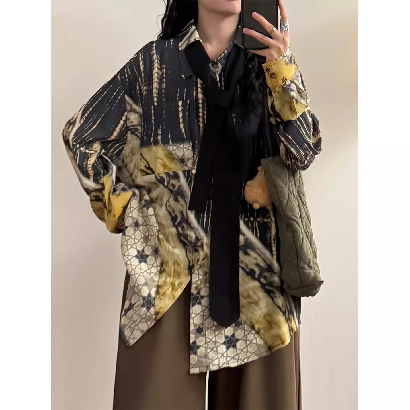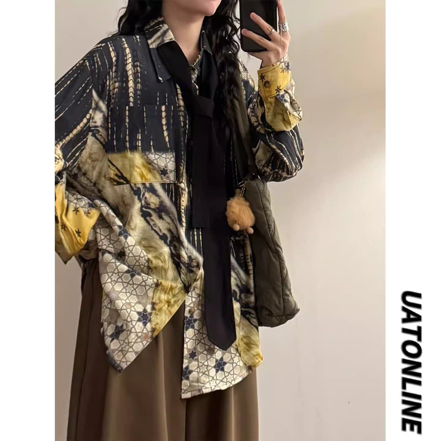 ❀春新作、個性派のプリントシャツ!【UATONLINEシリーズ】★シャツ★ ユニセックス レトロ ネクタイ付きシャツ トップス 長袖シャツ 個性的 ヴィンテージ