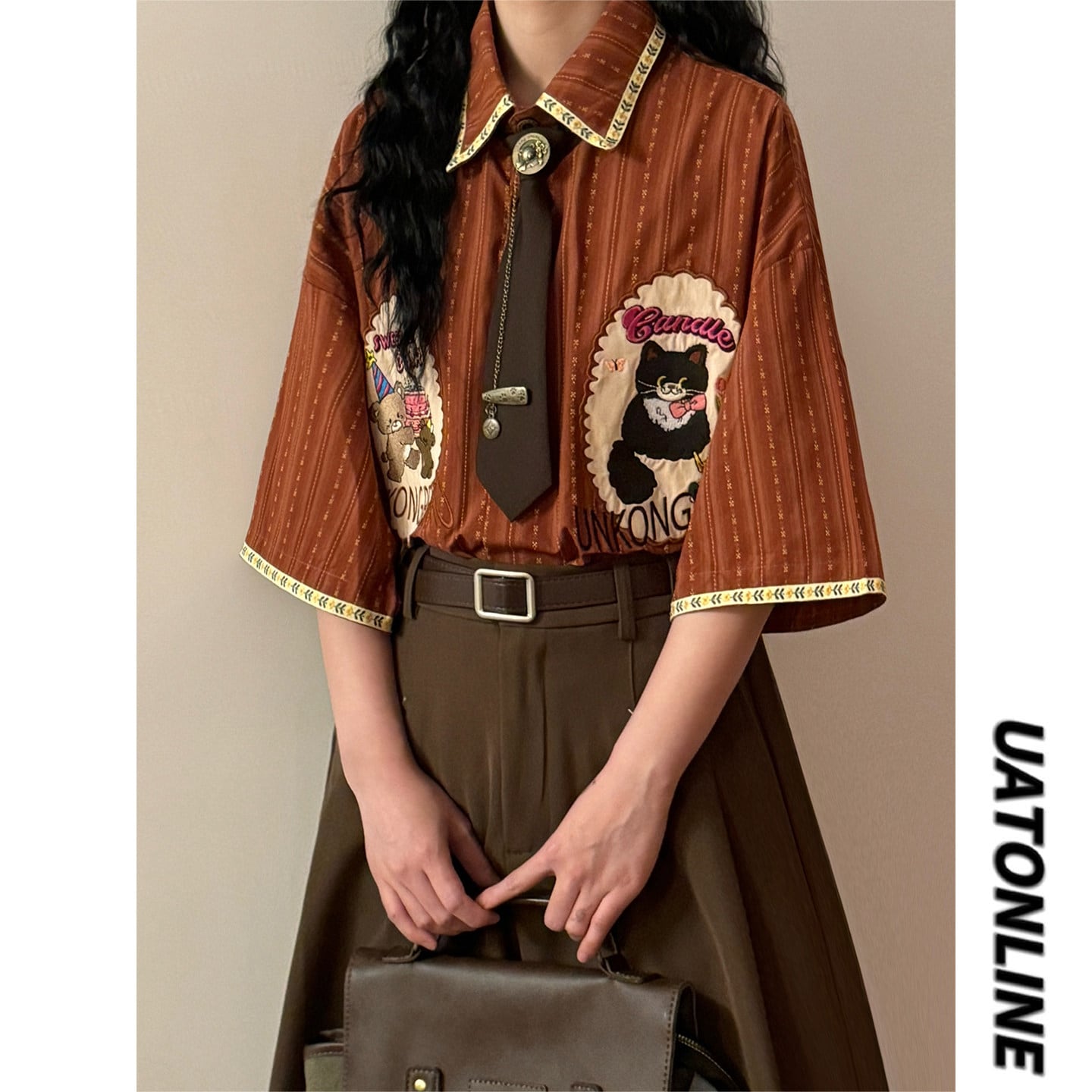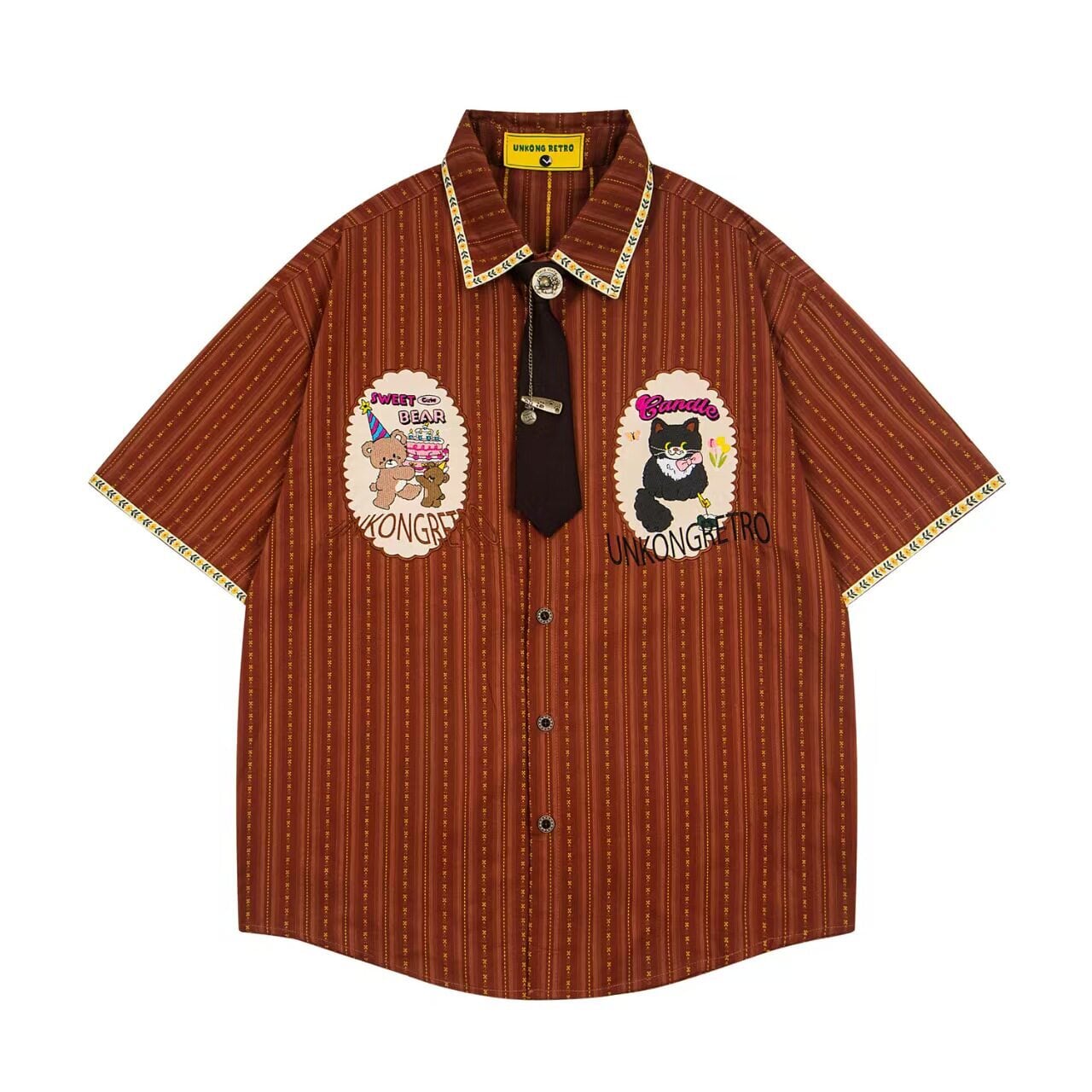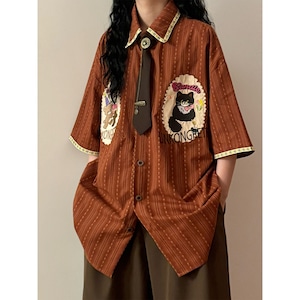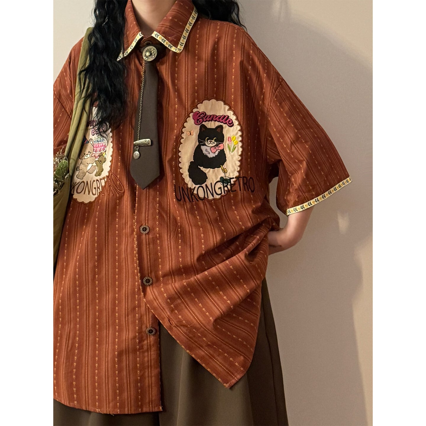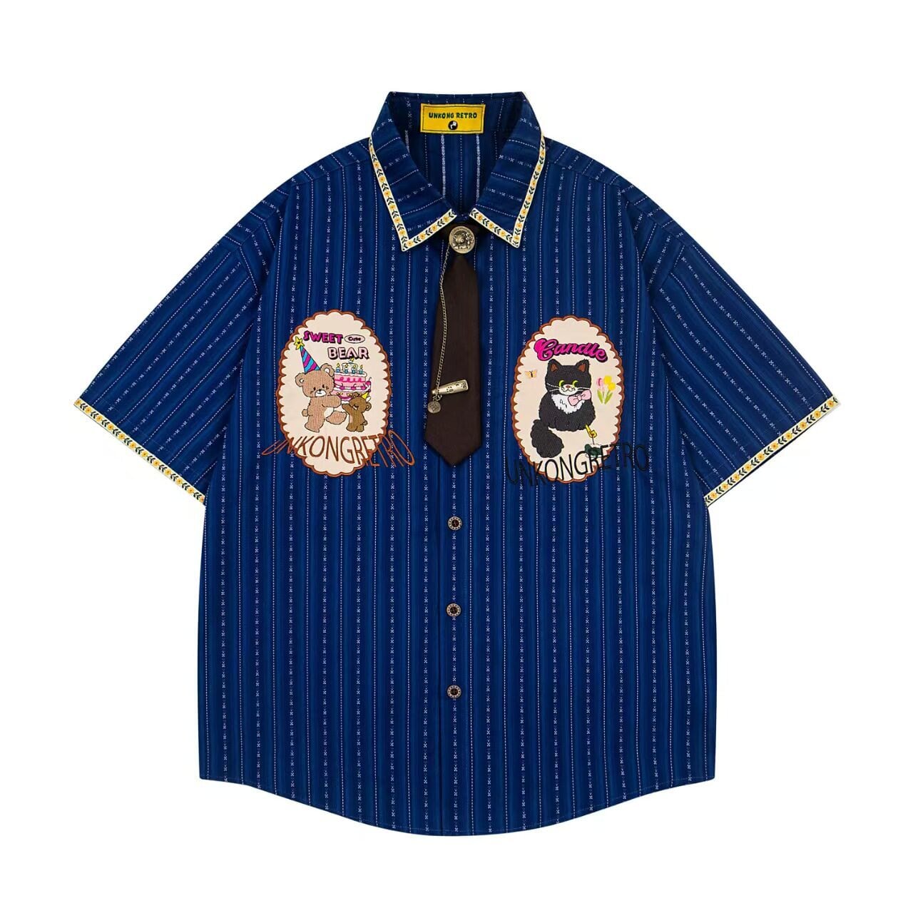 ❀超可愛い縦縞猫柄シャツ!【UATONLINEシリーズ】★シャツ★ 2color ユニセックス レトロ ネクタイ付きシャツ トップス 半袖シャツ カートゥーン 猫柄 縦縞 縞模様