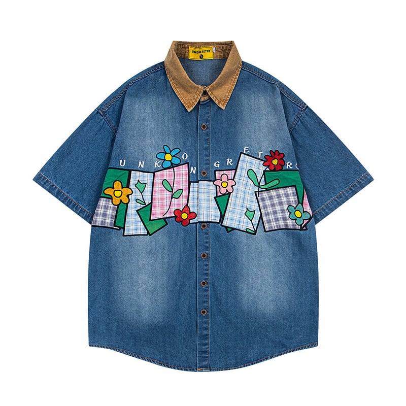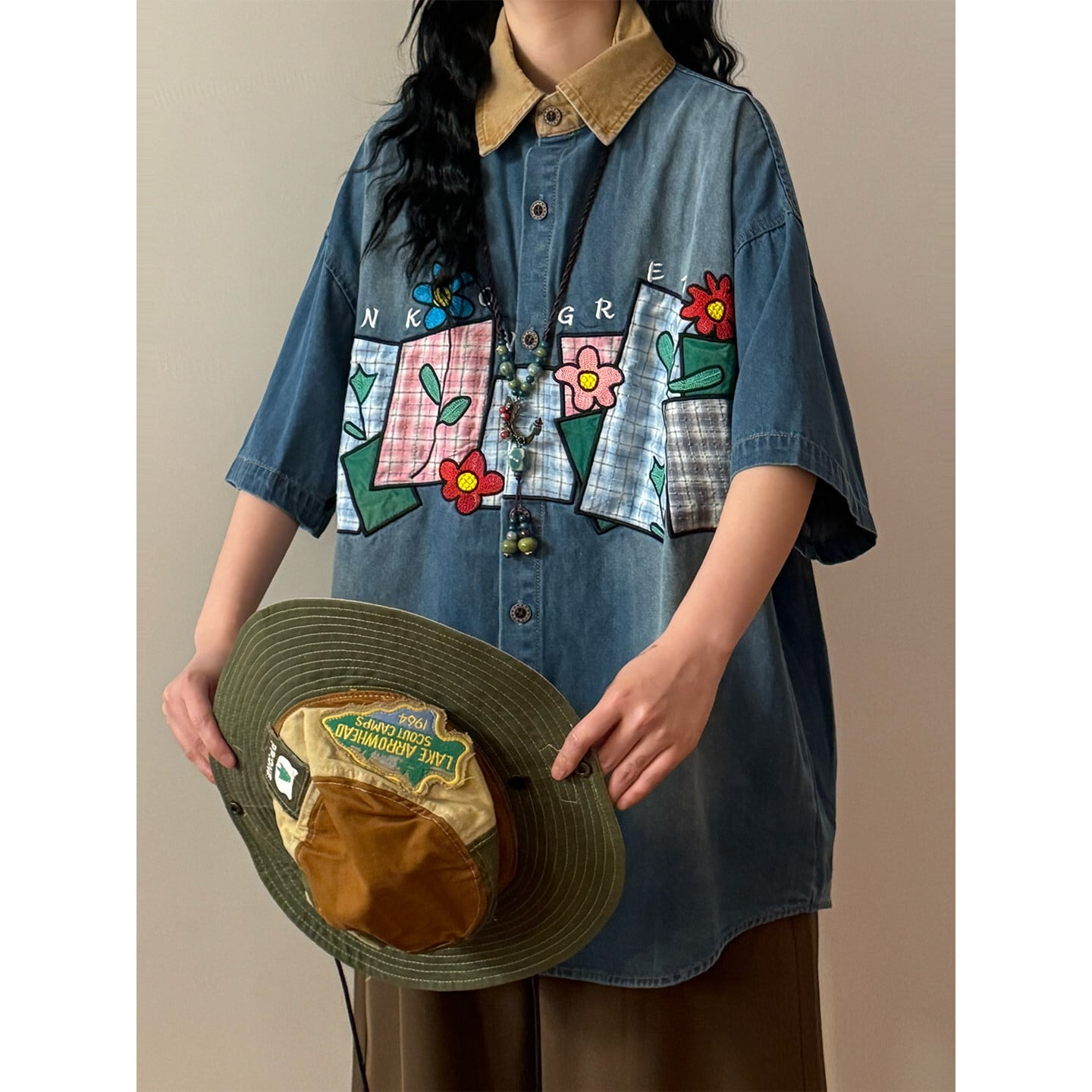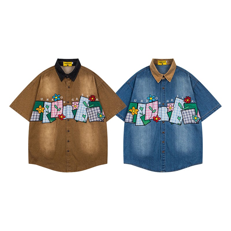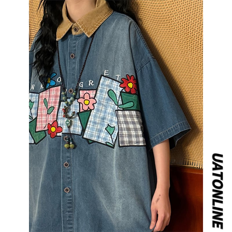 ❀チェックと花の組み合わせに、心奪われる夏!【UATONLINEシリーズ】★シャツ★ 2color ユニセックス レトロ デニム 半袖