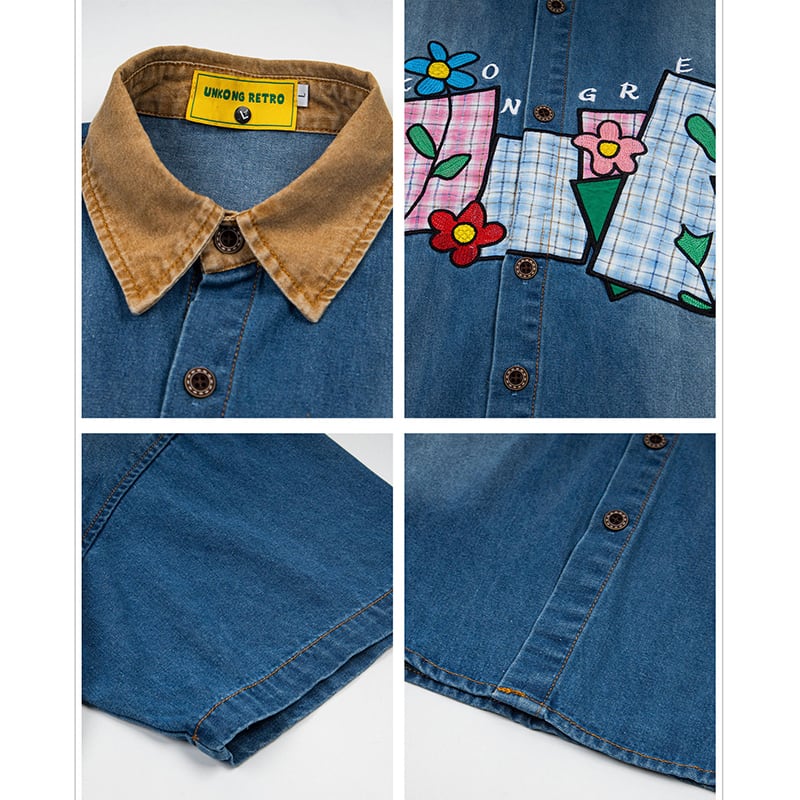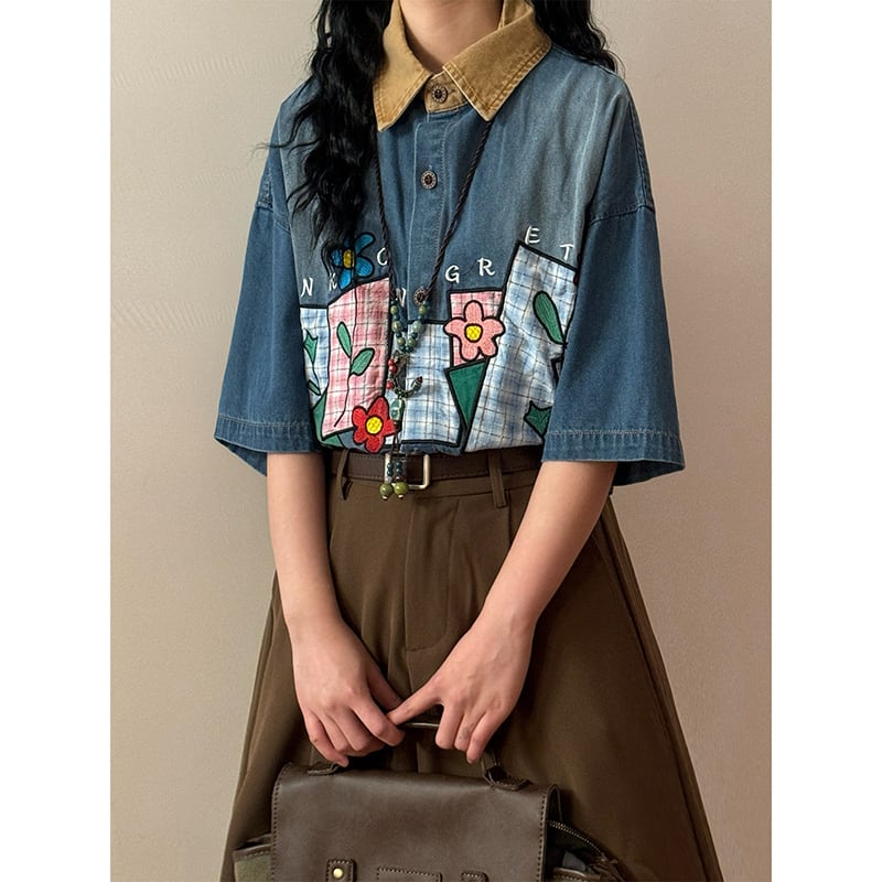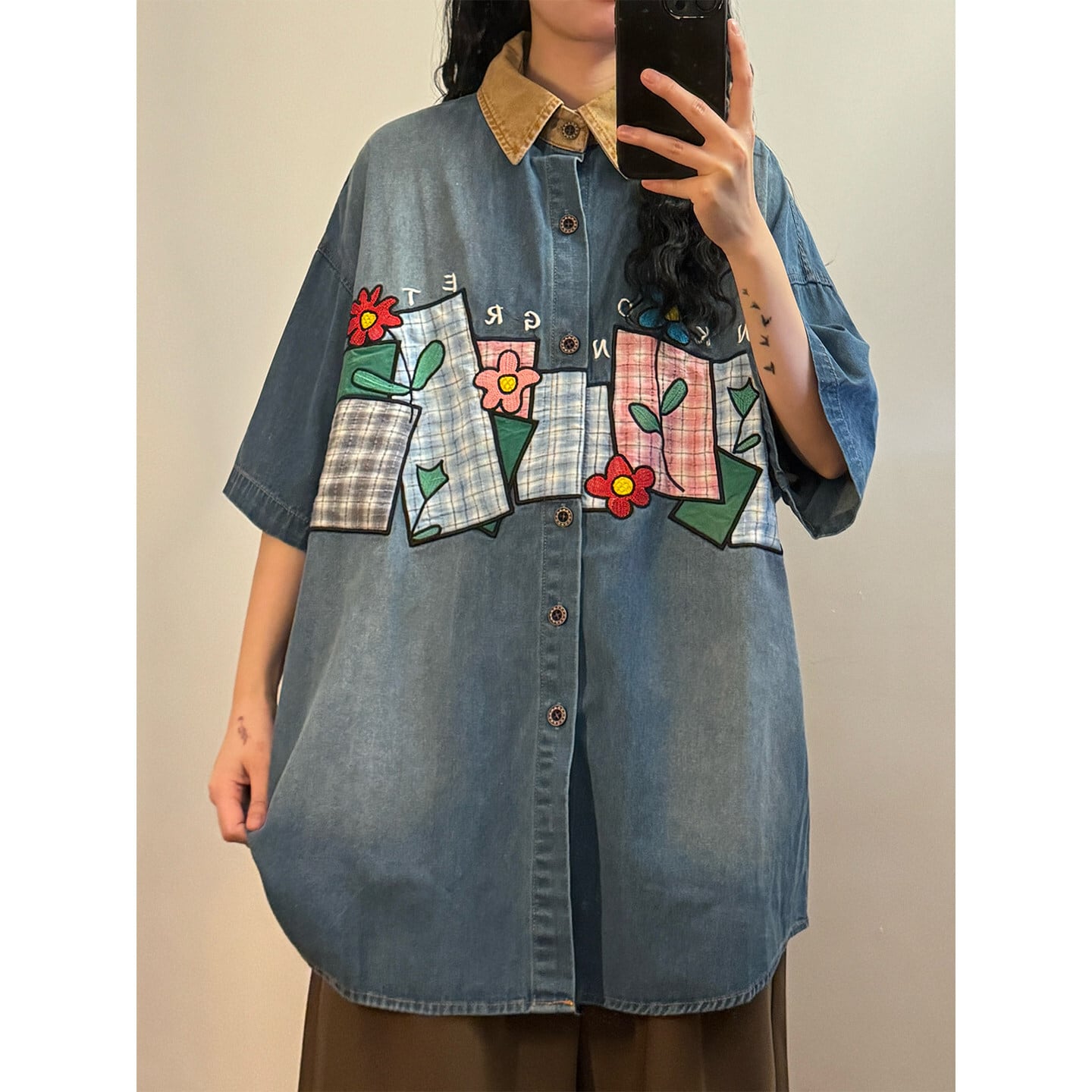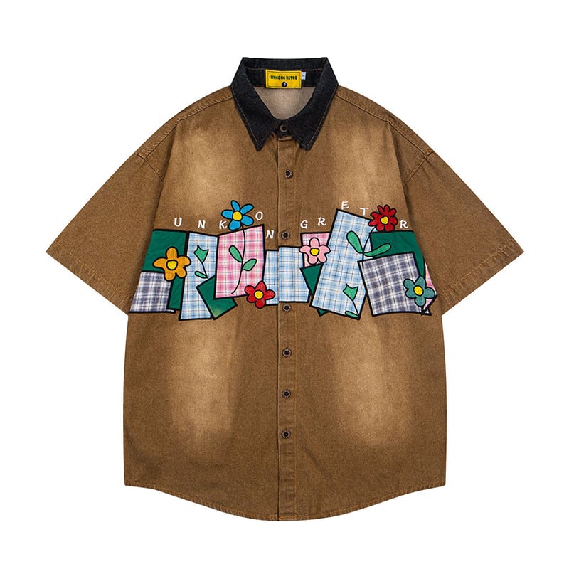 ❀チェックと花の組み合わせに、心奪われる夏!【UATONLINEシリーズ】★シャツ★ 2color ユニセックス レトロ デニム 半袖
