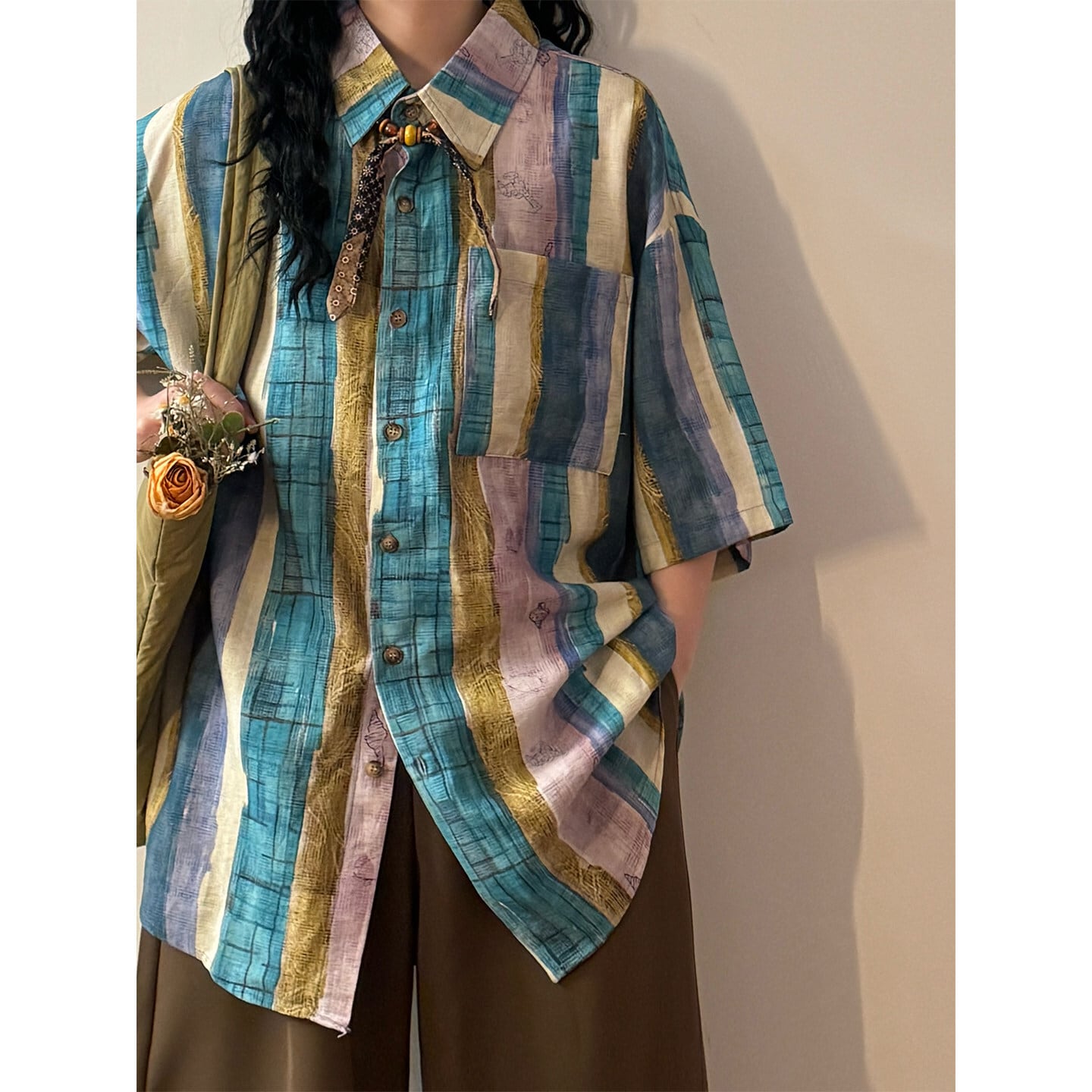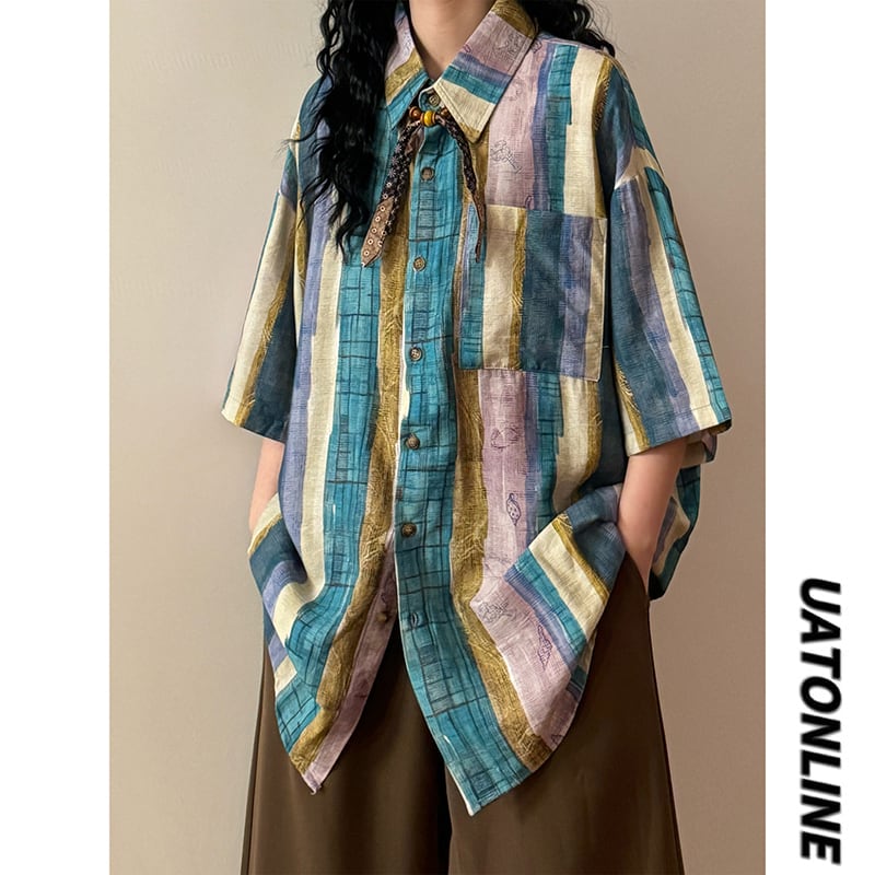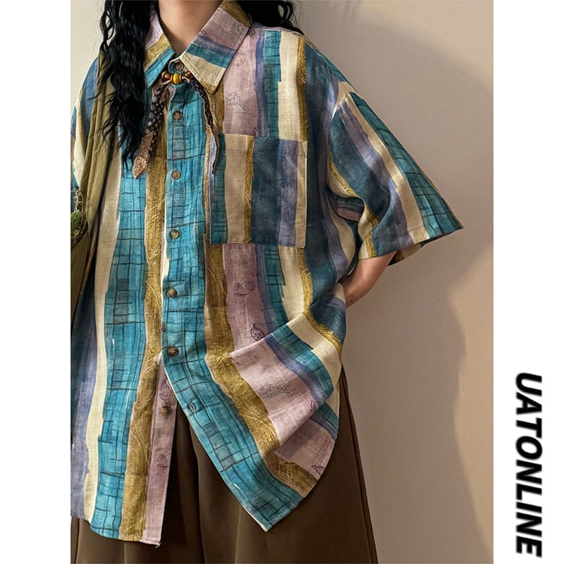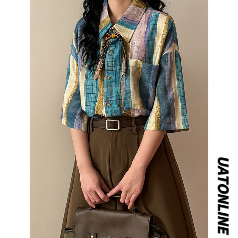 ❀切り替えストライプの魔法にかかる!【UATONLINEシリーズ】★シャツ★ ネクタイ付き ユニセックス レトロ 半袖 配色