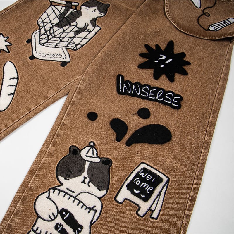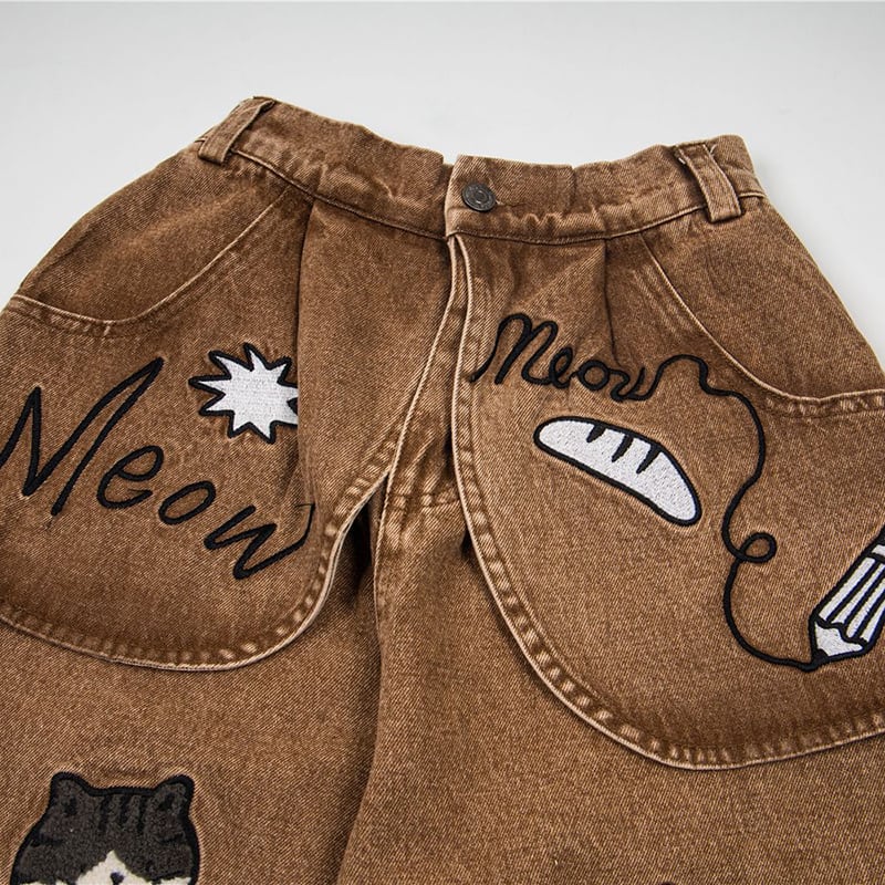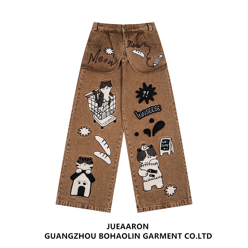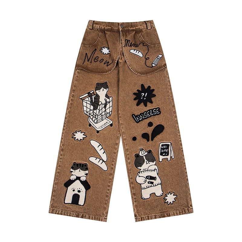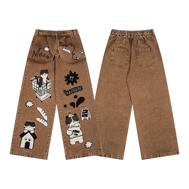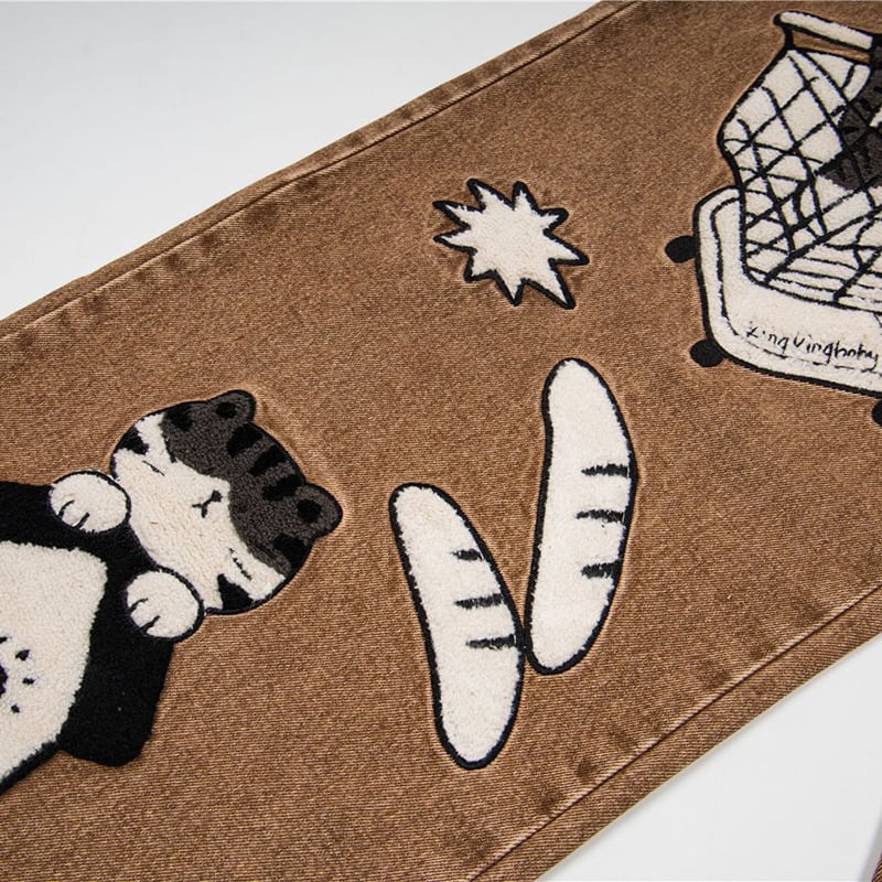✿猫と一緒にお買い物、デニムでお出かけ!【YIDAOシリーズ】★デニムパンツ★ ズボン ボトムス ユニセックス コットン 猫 猫柄 レトロ