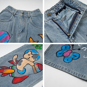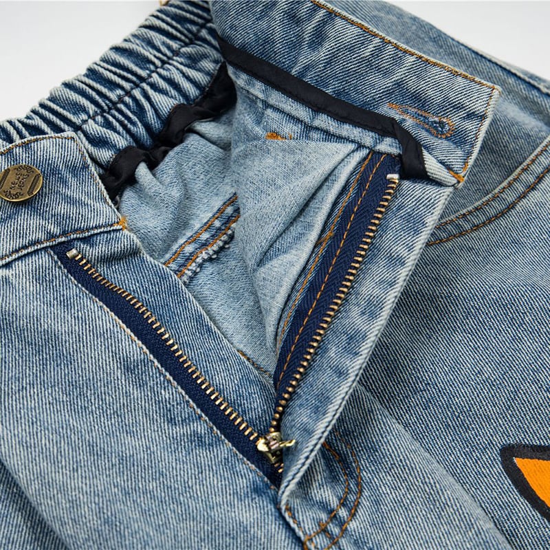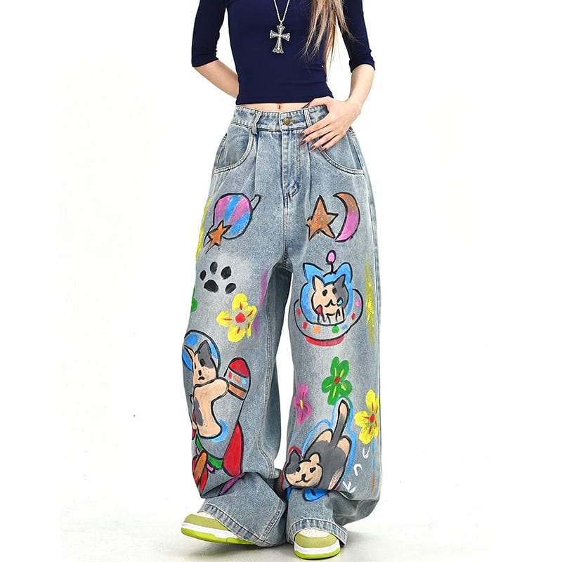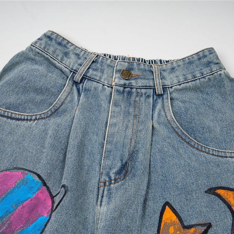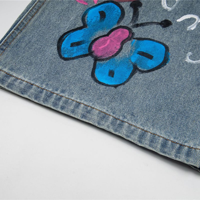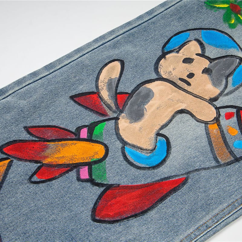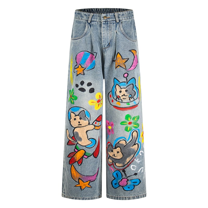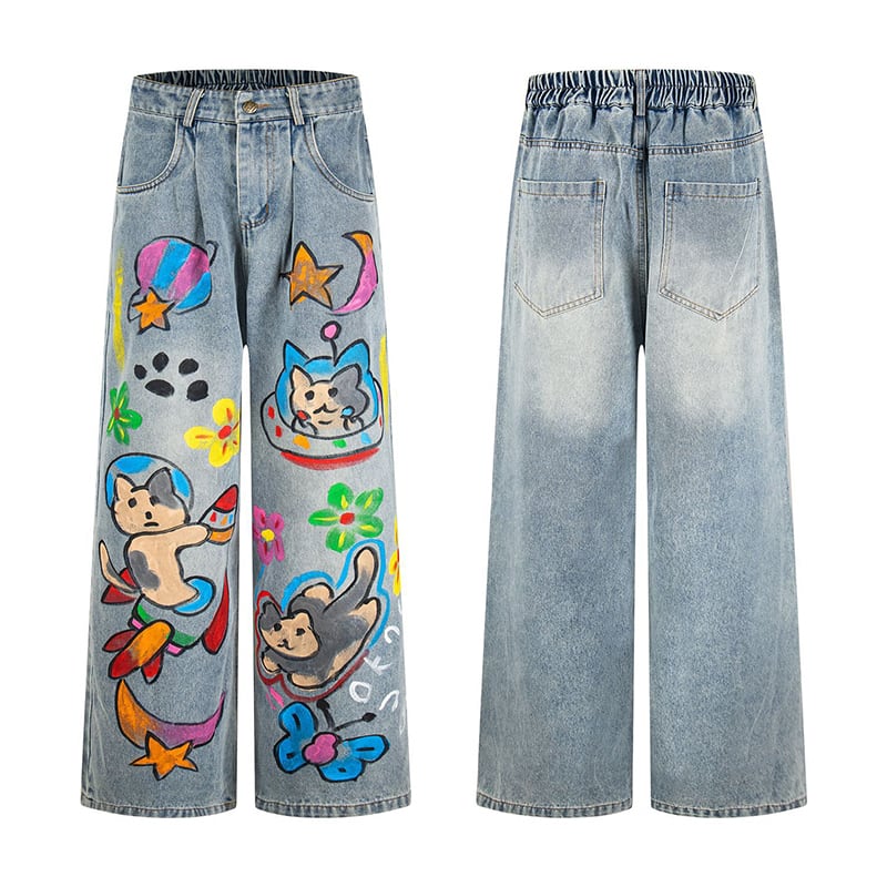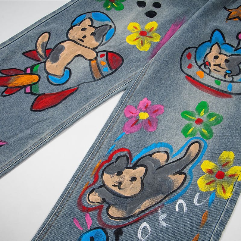 ✿カートゥーンが踊る、楽しいデニム!【YIDAOシリーズ】★デニムパンツ★ 落書き ズボン ボトムス ユニセックス コットン 猫 猫柄 彩り